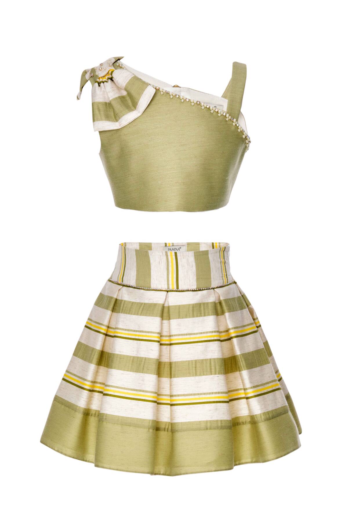 "Cotton lining is used for extra comfort. Striped linen bowknot detailed solid color bustier with asymmetric shoulders. Colorful striped linen skirt is pleated. It has a non skin contact invisible zipper. Dry cleaning only."