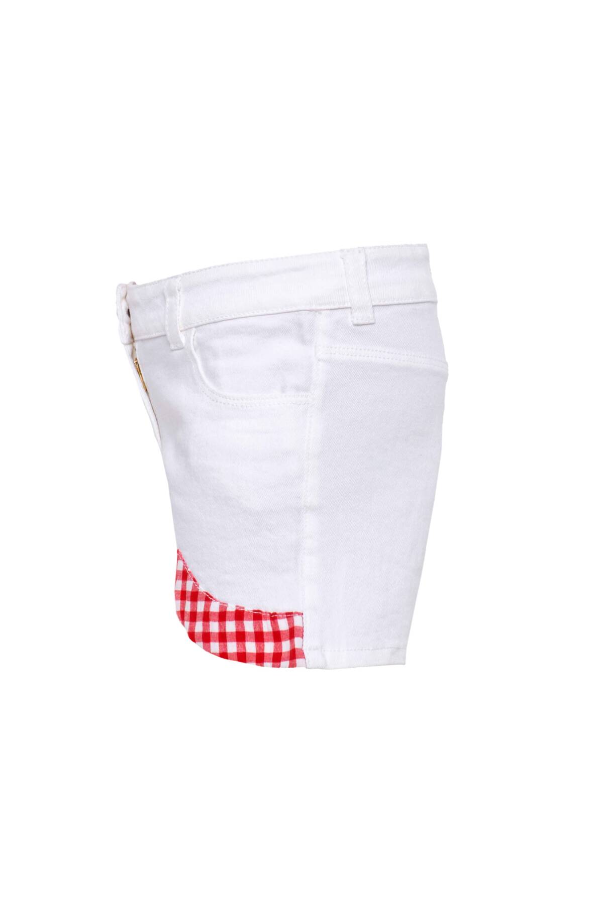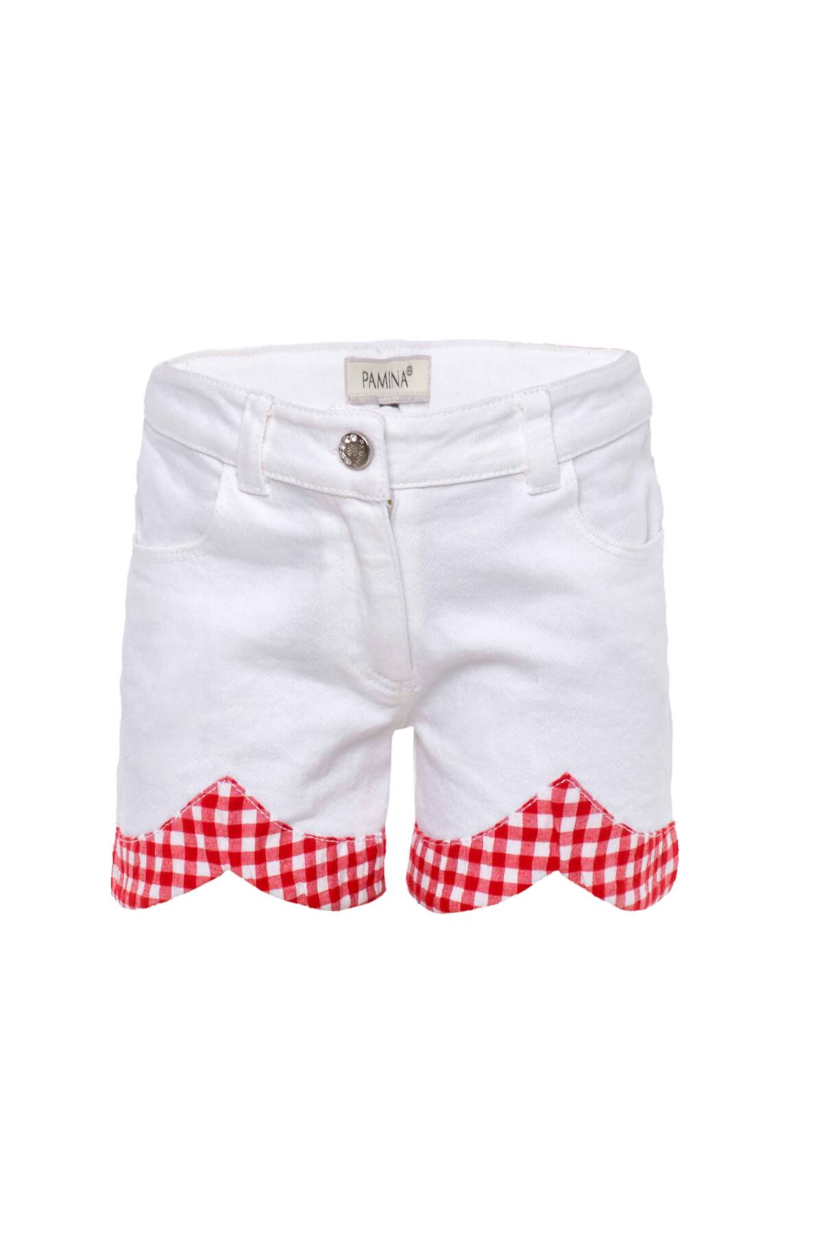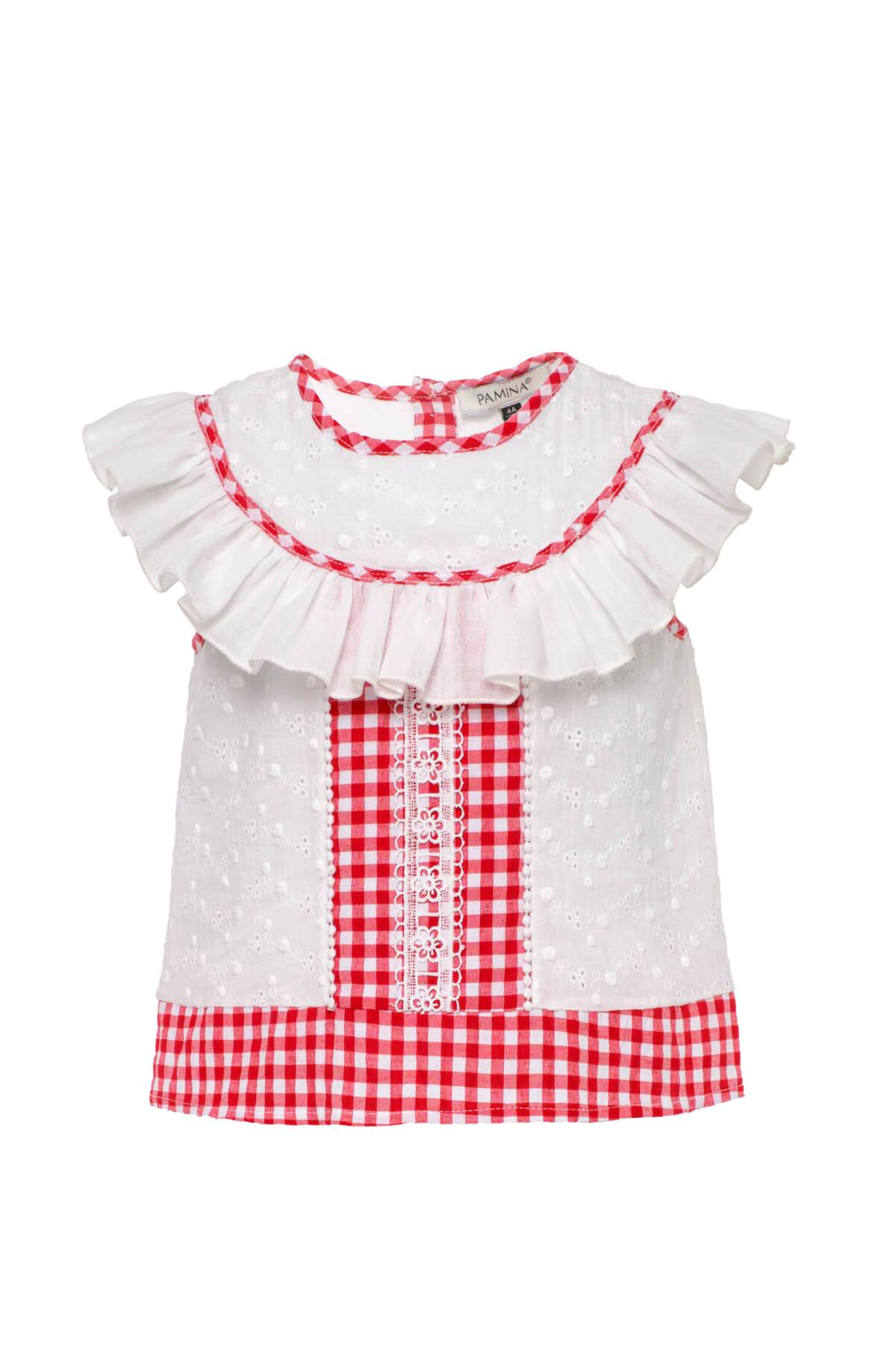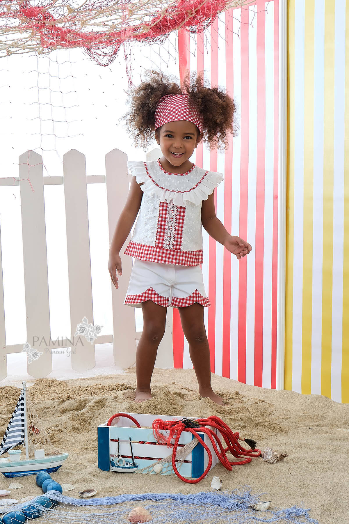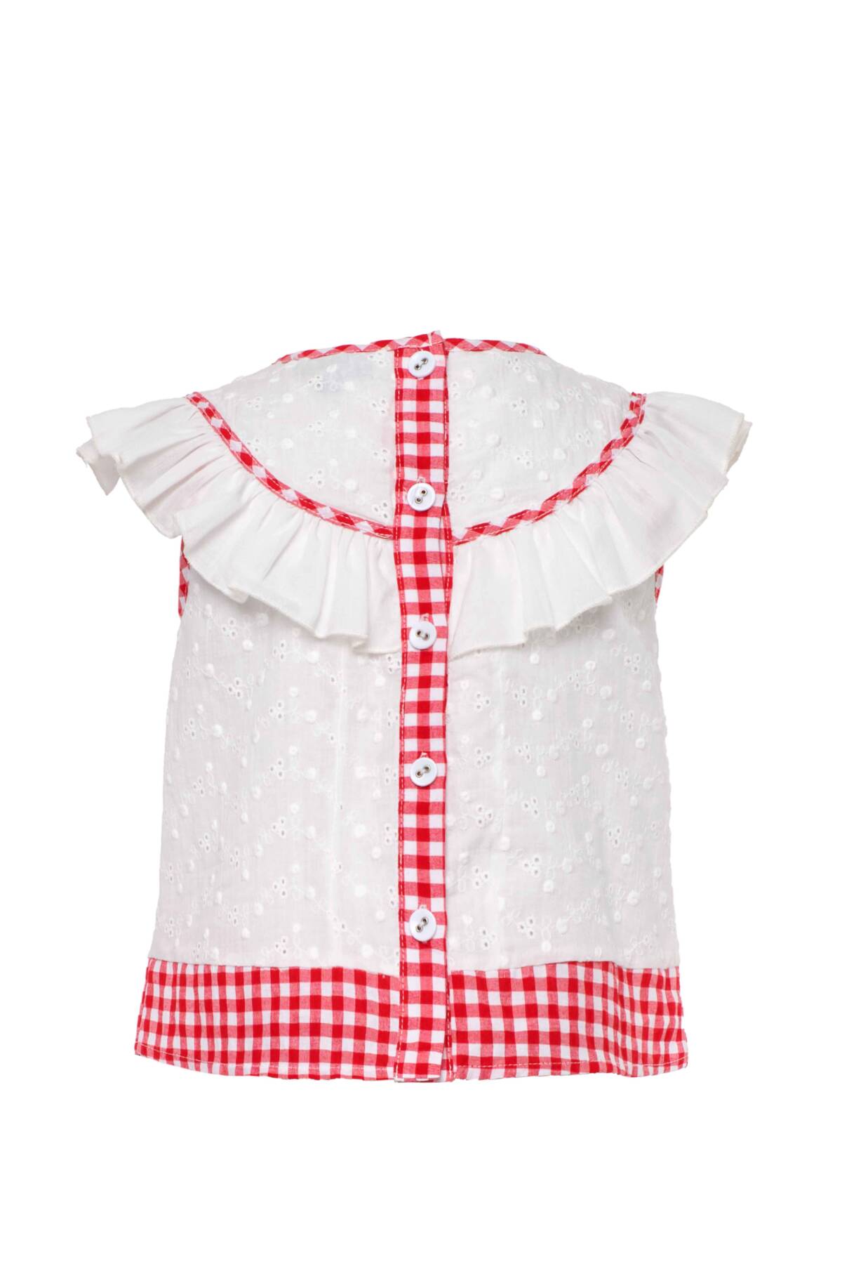 "Cotton lining is used on the upper portion for extra comfort. Our blouse has lace ribbon accessory and frill details. The back placket has a row button detail. Our shorts have an adjustable elastic waist and the cuff has plaid fabric detail. Gentle hand washing is required. Should be ironed with steam or at low heat."