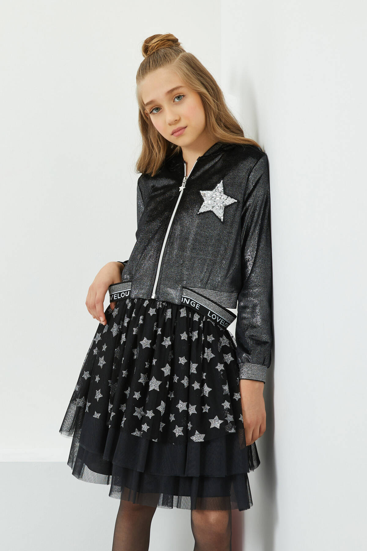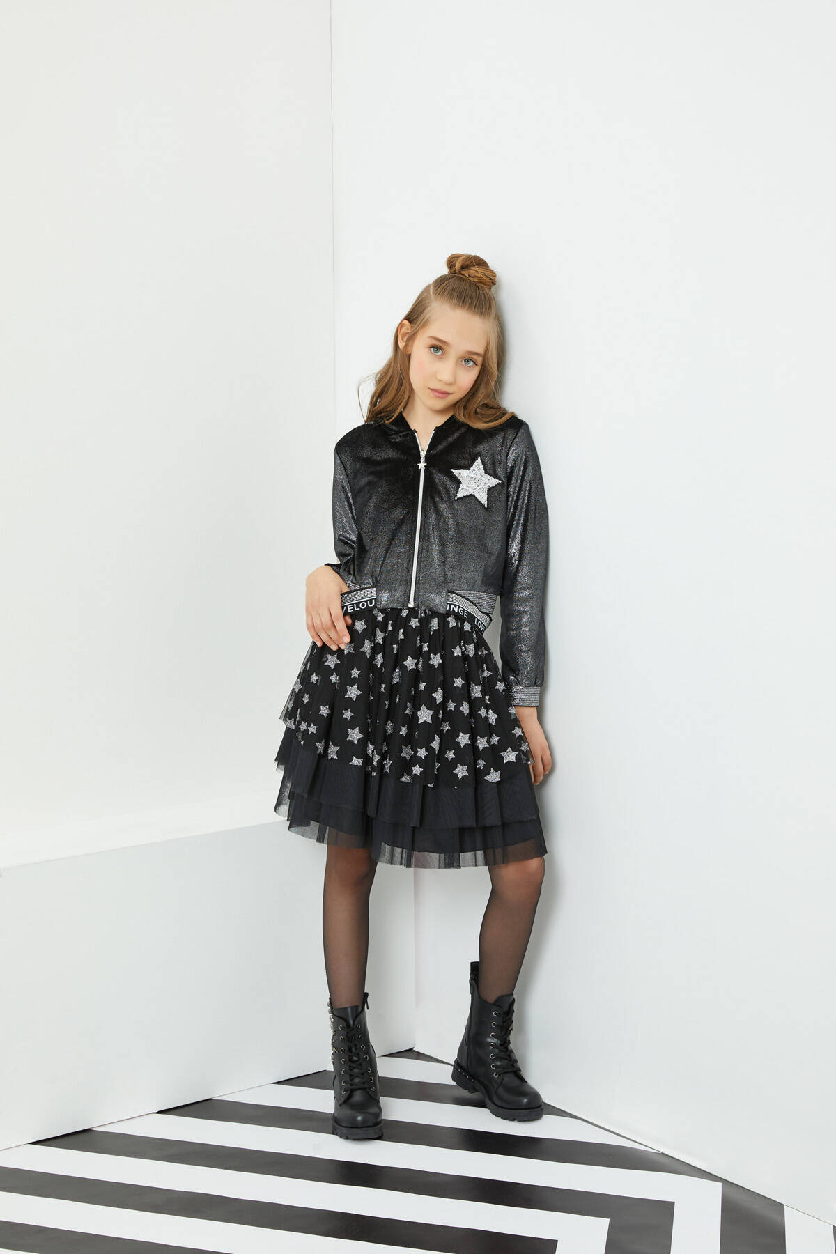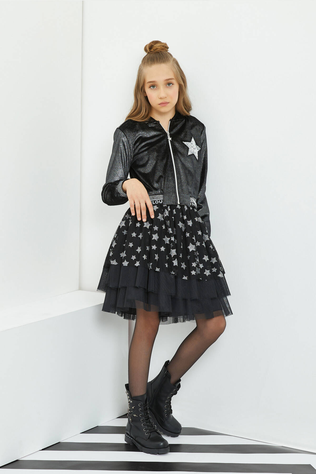 "Pamina style for bomber jackets! The glittery and star appliqué bomber jacket looks like it will make the sky jealous with its star-print skirts made of layers of tulle. A great choice that can be combined with sports and classic."