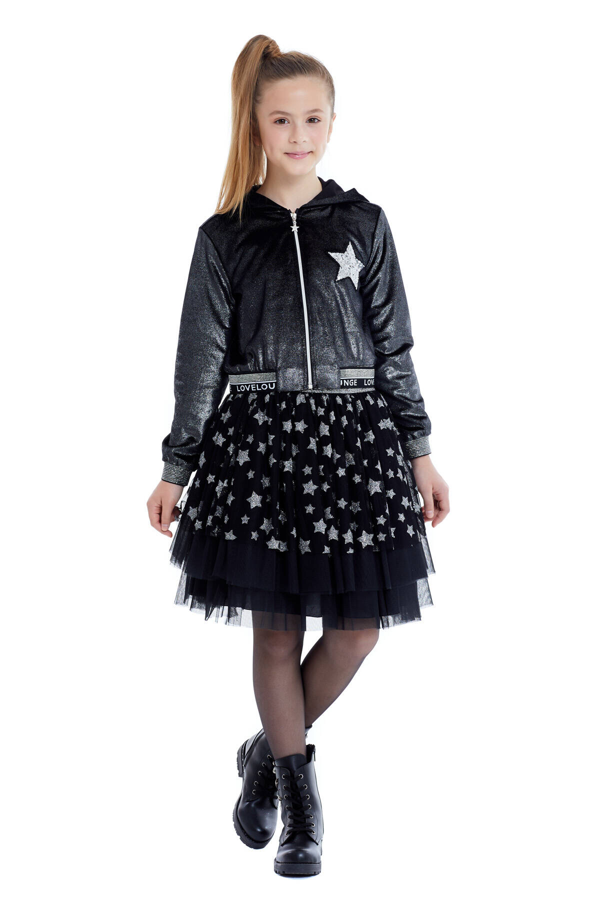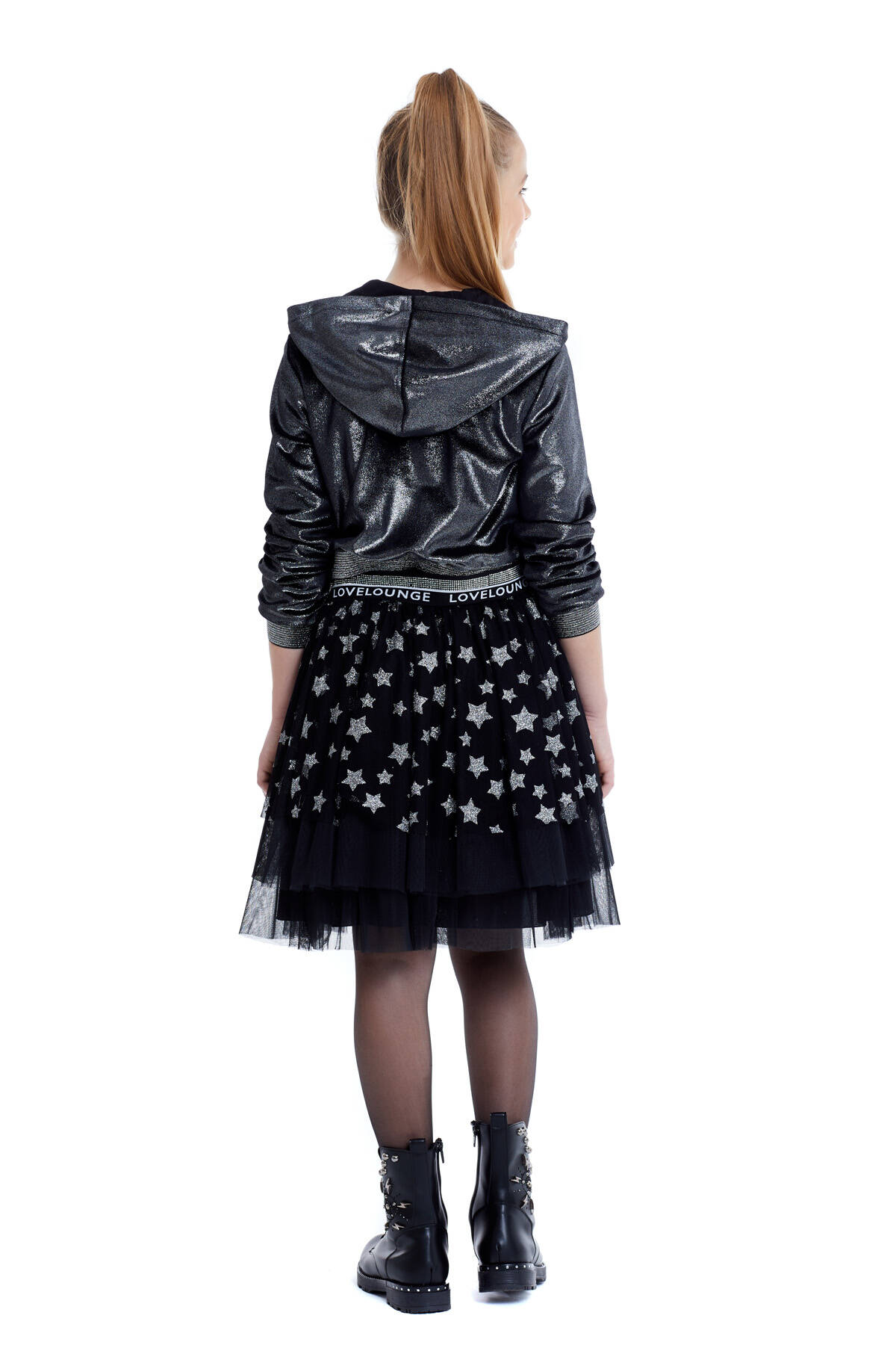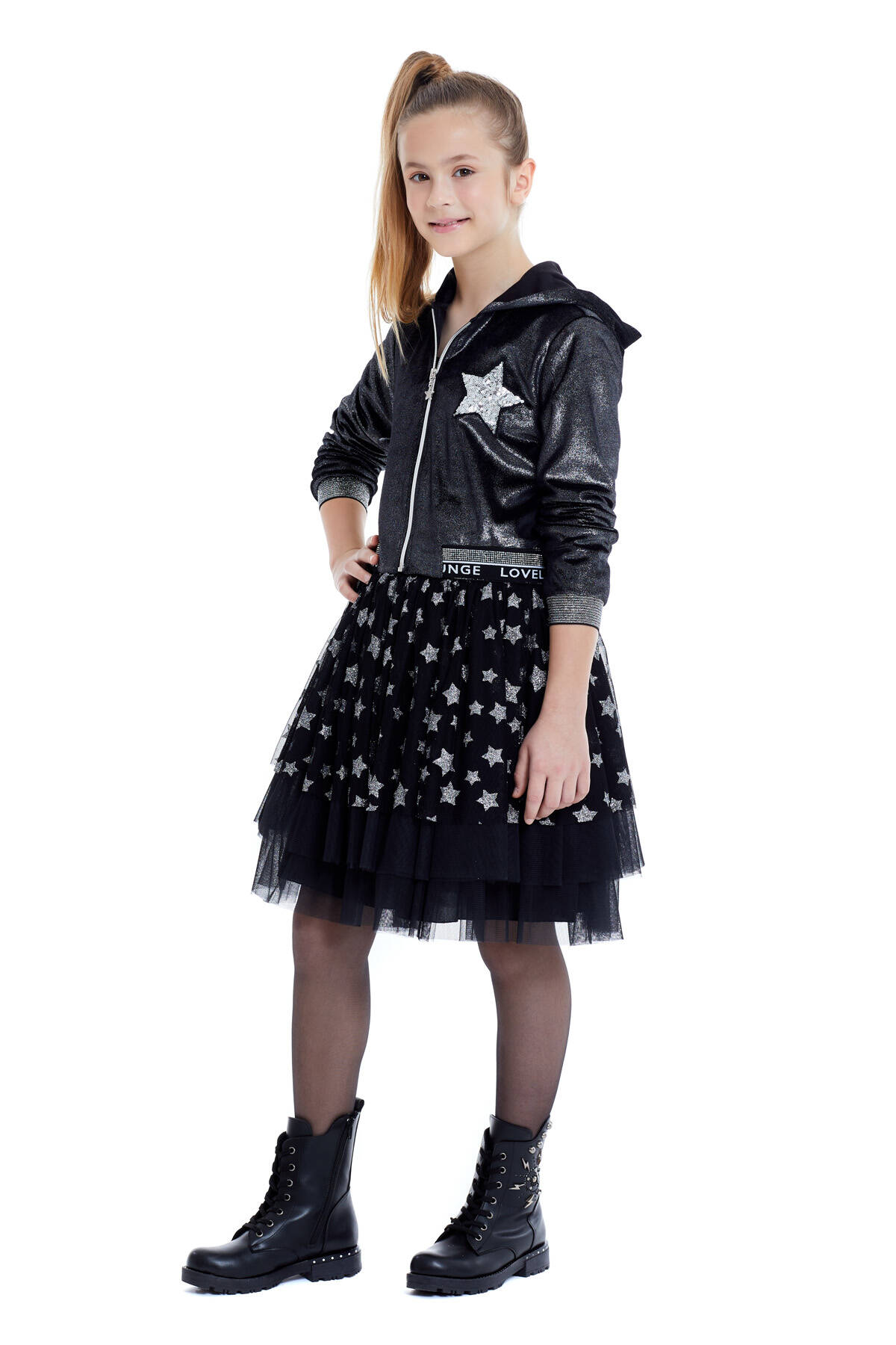 "Pamina style for bomber jackets! The glittery and star appliqué bomber jacket looks like it will make the sky jealous with its star-print skirts made of layers of tulle. A great choice that can be combined with sports and classic."