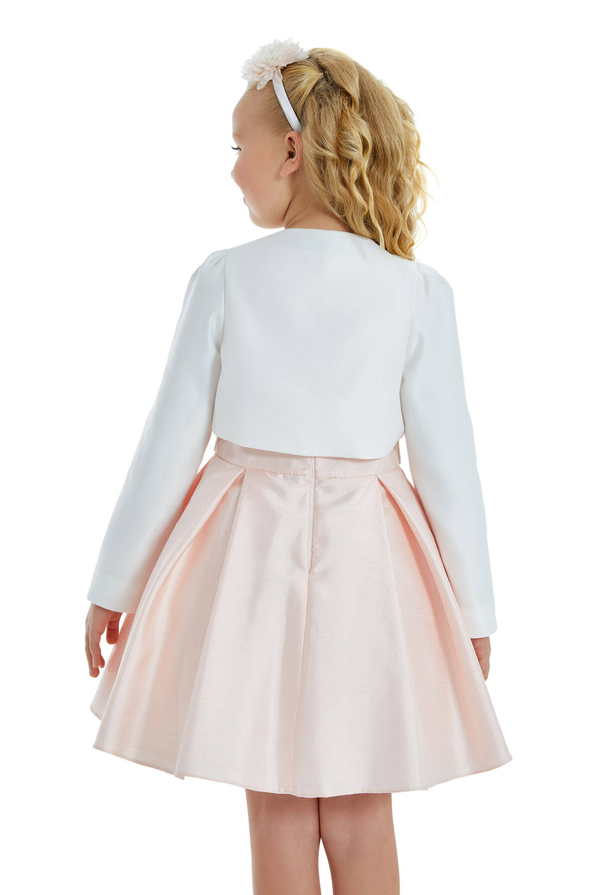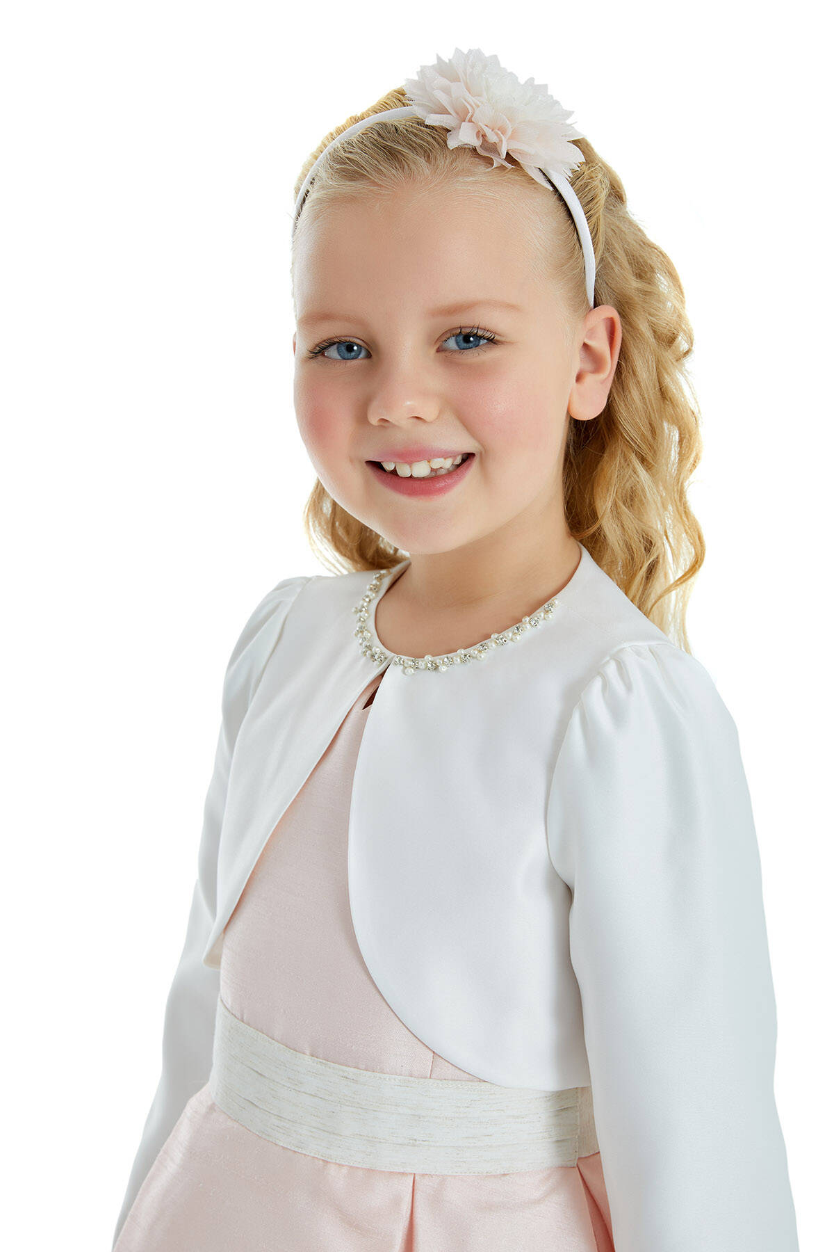 "The saviour of stylish invitations on summer evenings is, of course, a stylish bolero. Tiny princesses will complement the elegance of their strapless or sleeveless dresses with pearl and stone embroidered satin bolero. It is available in two colors, ecru and pink."