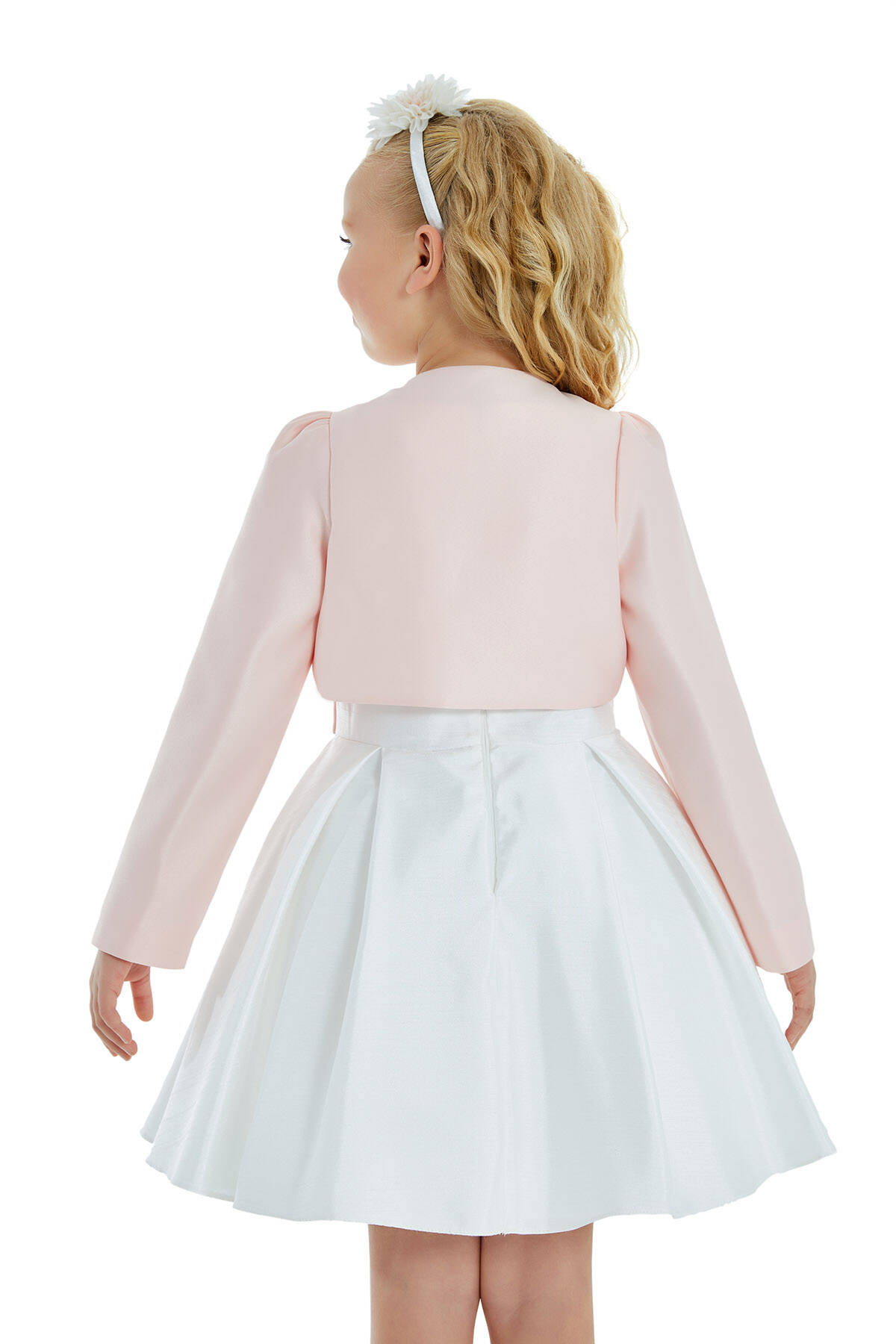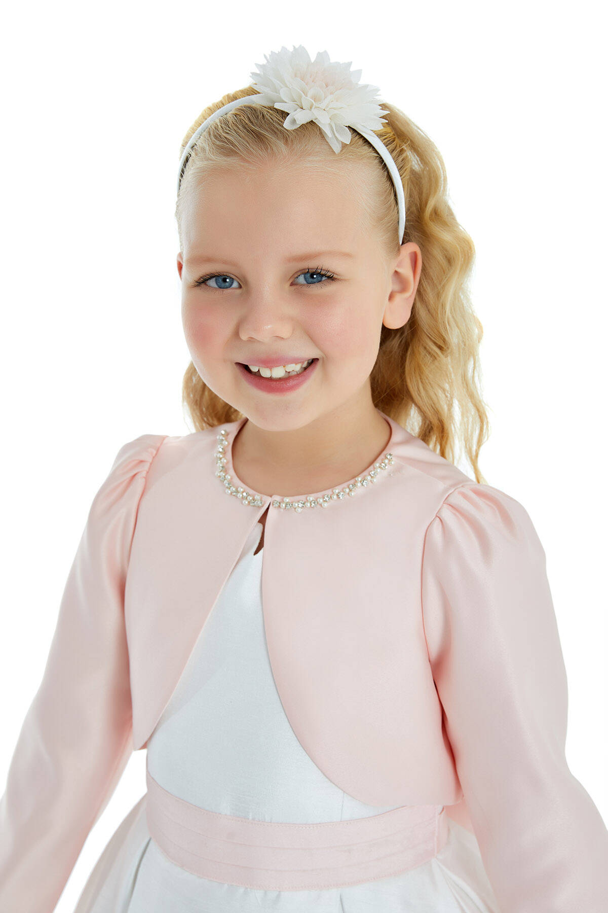 "The saviour of stylish invitations on summer evenings is, of course, a stylish bolero. Tiny princesses will complement the elegance of their strapless or sleeveless dresses with pearl and stone embroidered satin bolero. It is available in two colors, ecru and pink."