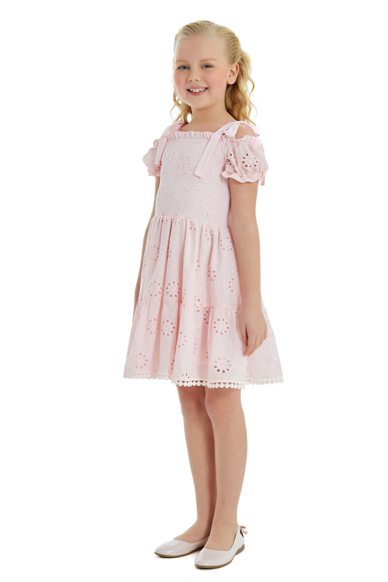 "Let's introduce casual clothing to the most comfortable dress of the spring summer season. The low-shouldered dress, with a rubber top and a strappy over the shoulder, consists of brode fabric. It offers complete wear-and-go comfort. The part of the dress that touches the skin is comfortable and healthy with its cotton fabric. Girls will love this dress with pink and ecru color options."
