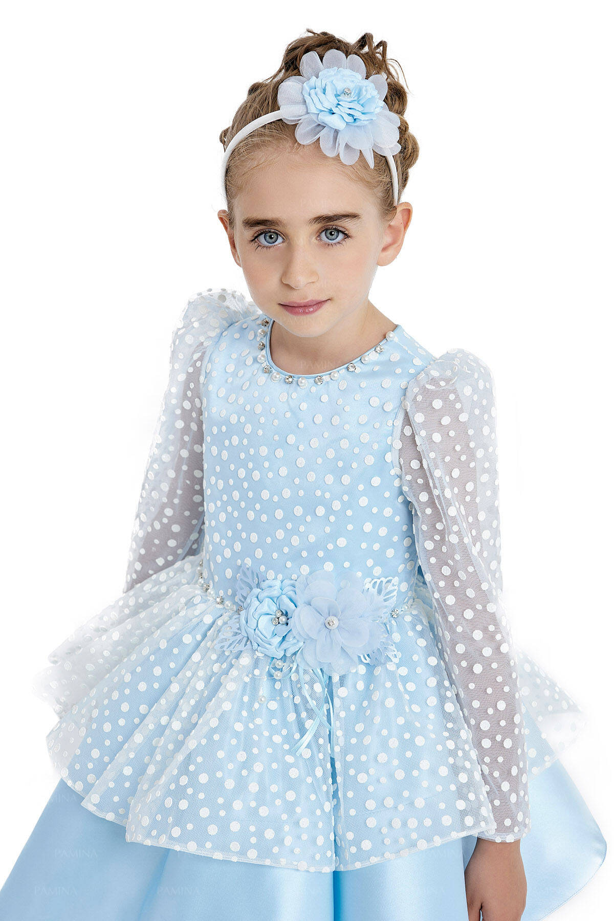 "It is a glamorous kids dress with its every detail for invitations. The dress that its empiecement is designed with glitter spotted tulle fabric has spectacular arms. Crew-necked and long-sleeved dress' collar and waist has pearl and stone embroidery. It has a fluffy form with satin skirt and flounce. Flower embroideries on its waist and crown are special design. It is an elegant choice as birthday dress, party dress, or special day dress."