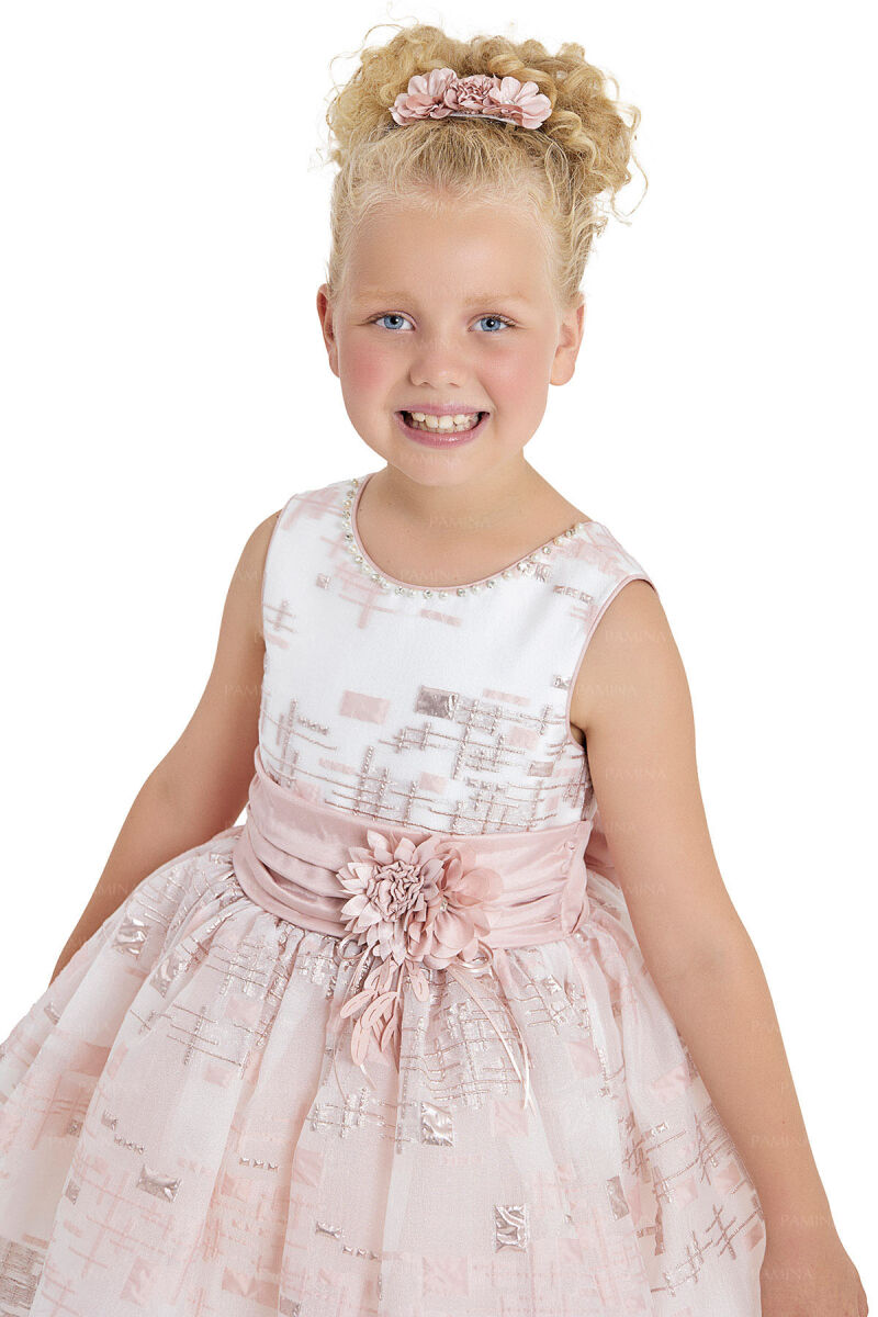 "Geometrical patterned sleeveless dress was designed with jacquard weaved organza fabric. Its collar has details of pearl and stone. There is a ruched satin belt and it is very egant with flower accessories. Bottom skirt of organza dress has a fluffy form with tulle fabric. There are a cute bow and V-detail on the back of dress. Girls are ready for invitations with flowery buckle. It is an elegant choice as birthday dress, party dress, or special day dress. "