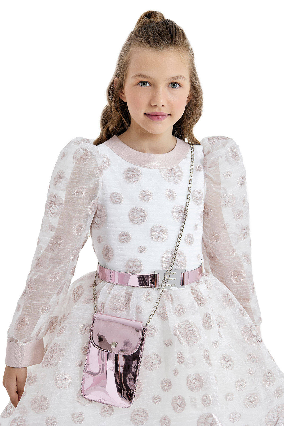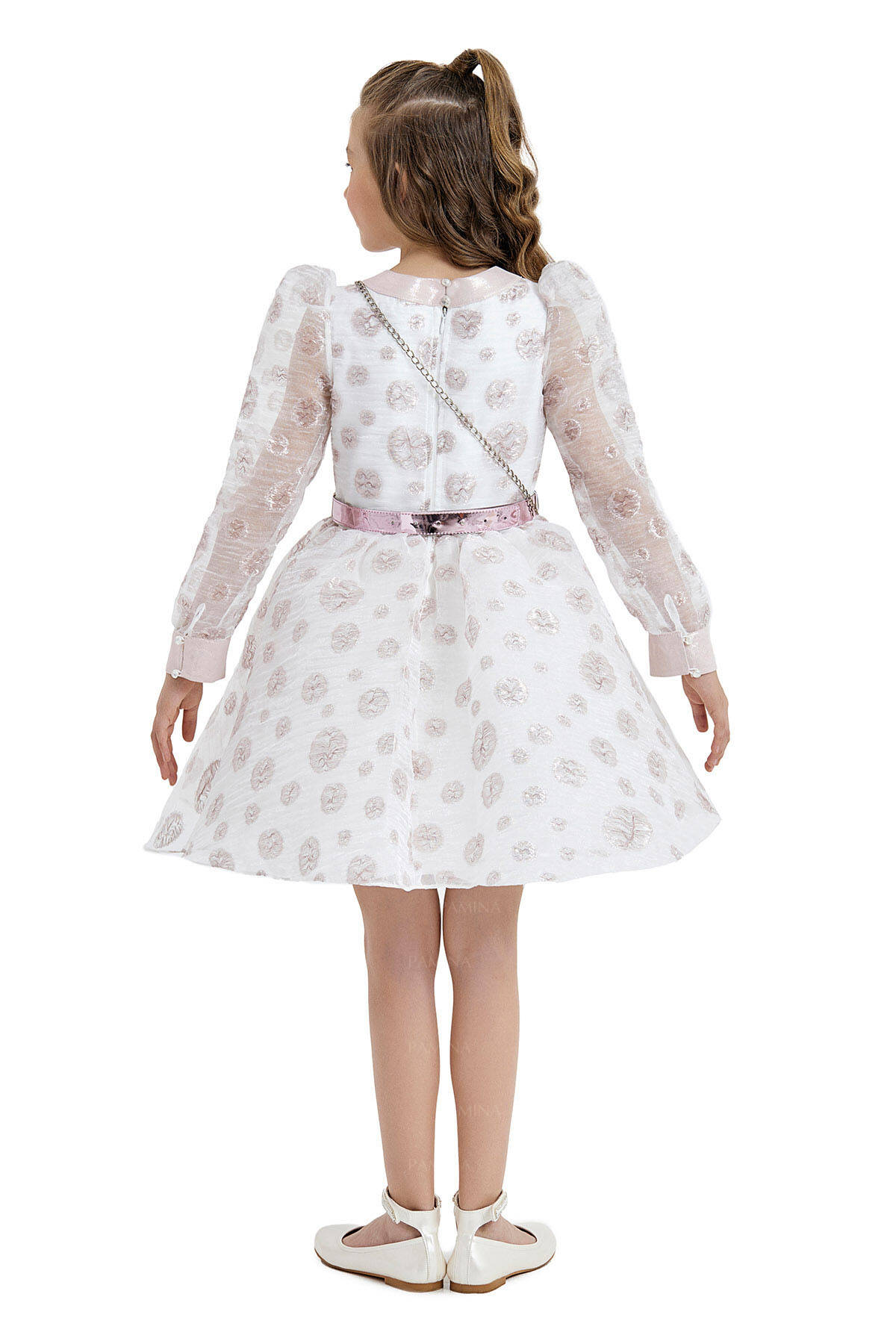 "Collar of dress which is produced from silvery spotted organza fabric is sparkling with silvery band. It is glamorous with its long balloon-sleeved cutting and fluffy form. Sleeve cuff details on its arm are popular trend of new season. Leather belt of balloon-sleeved dress is glamorous with details of stone and mirror. The girls will not leave leather bag with them. It is a great party dress for kids."