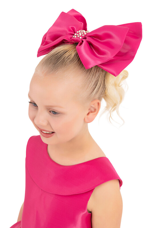 Sleeveless cutting girl dress is from eye-catching designs of the season with its different collar design. The upper part of the dress has a waist-shaped form. Double bow on its waist is pearl and stone embroidered. The inverted pleated skirt of the dress voluminous. It is a sparkling design with shining organza satin textured fabric. The back of the dress is very elegant with V-formed neck and big bow. Its cotton lining is soft and comfortable. It is an elegant choice to use for birthday dress,