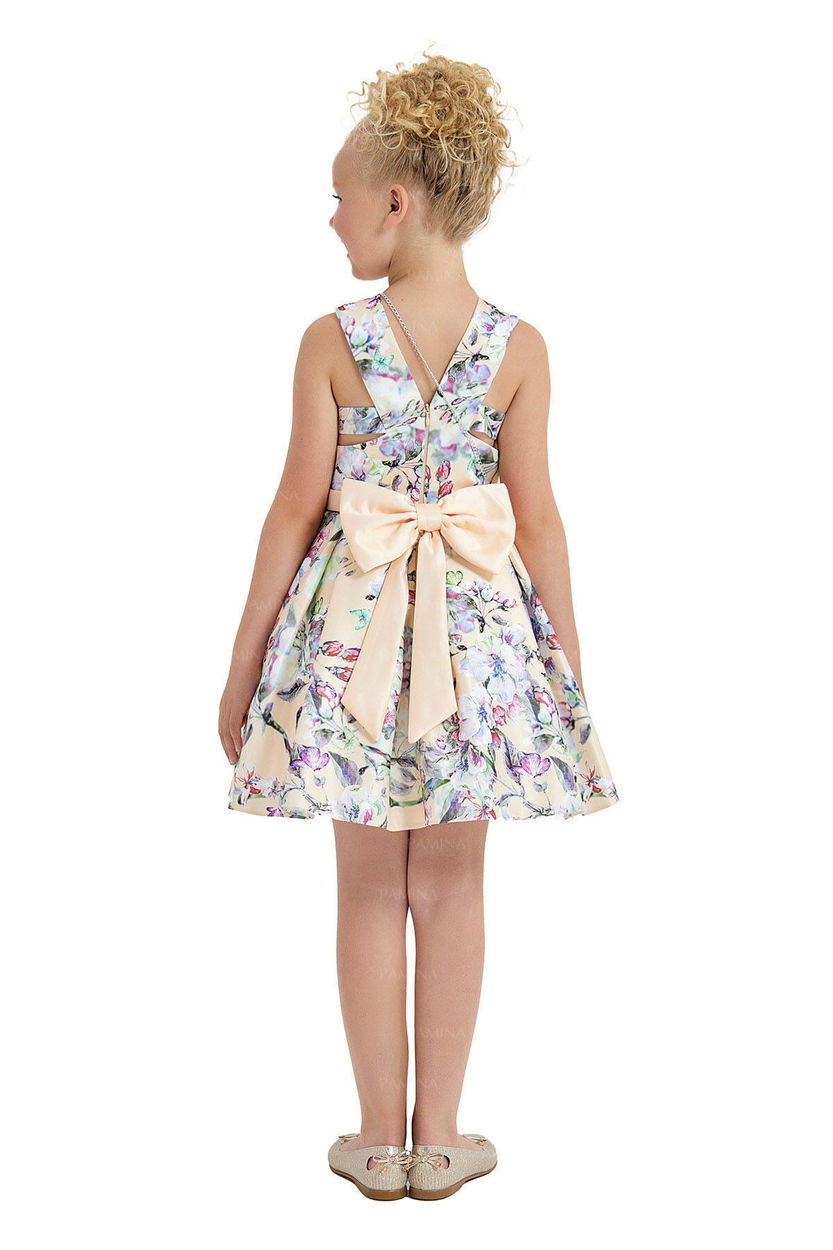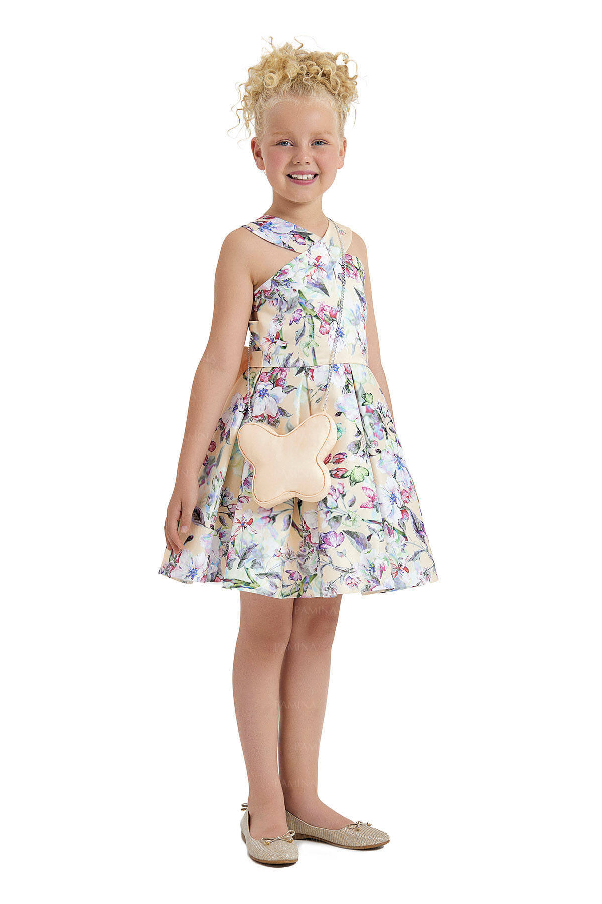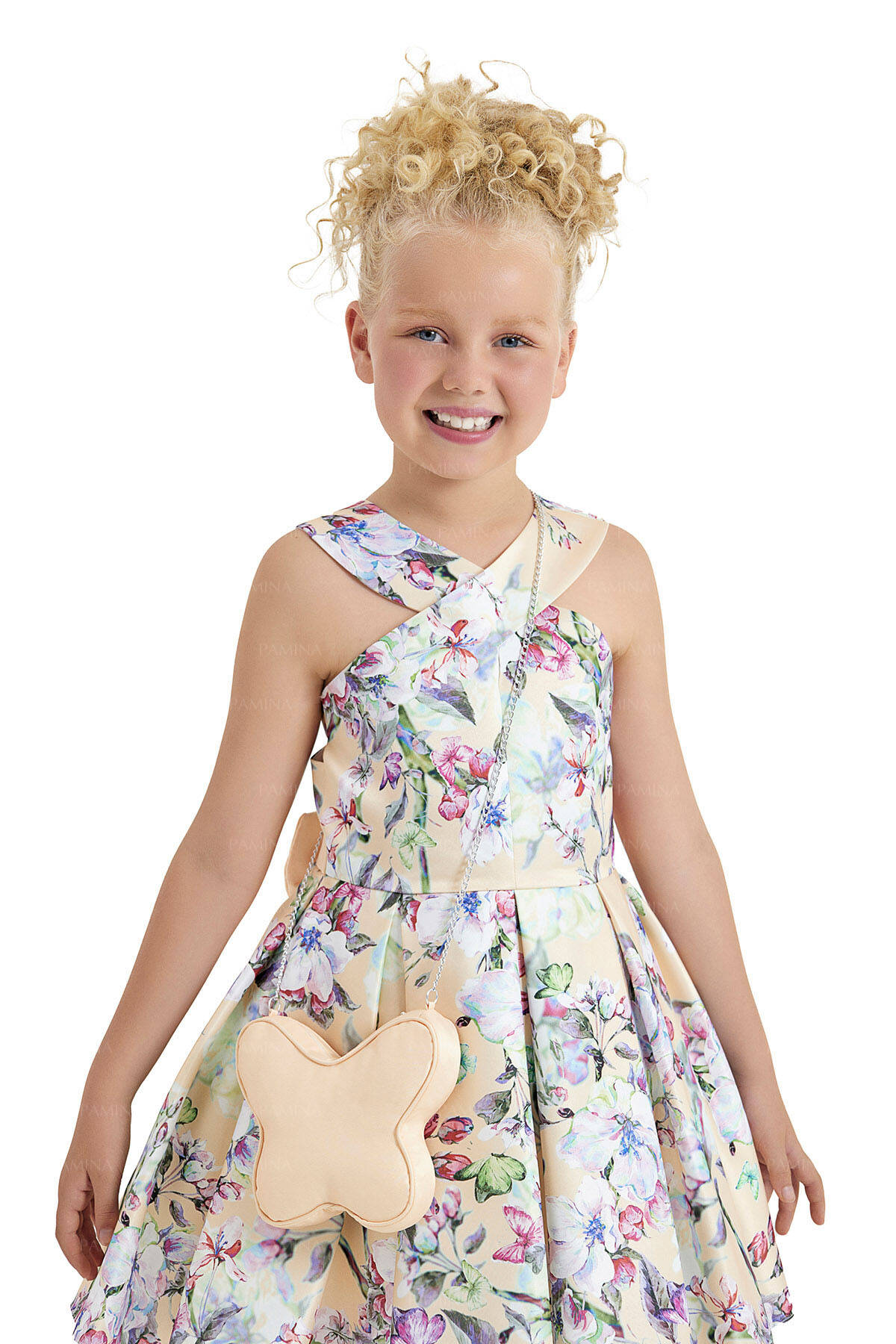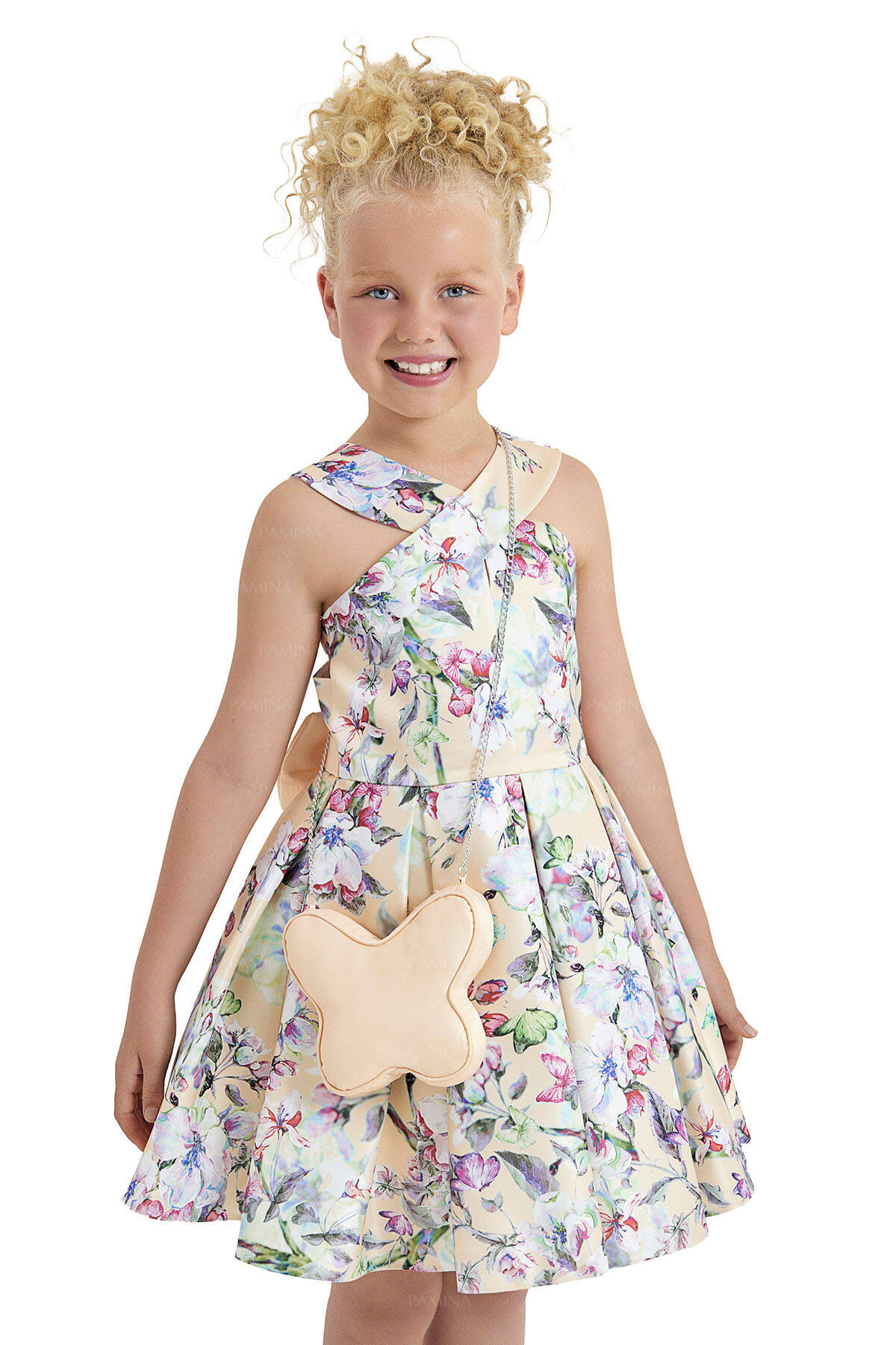 "Digital flower printed satin dress is trend of the season with cross collar. Pleated skirted dress is very cute with satin bow. It is a loveable style for kids with butterfly shaped chained bag. It is an elegant choice as birthday dress, party dress, or special day dress."