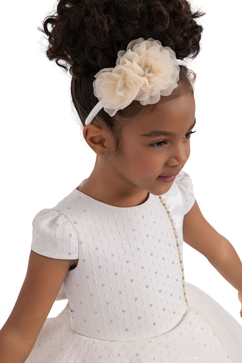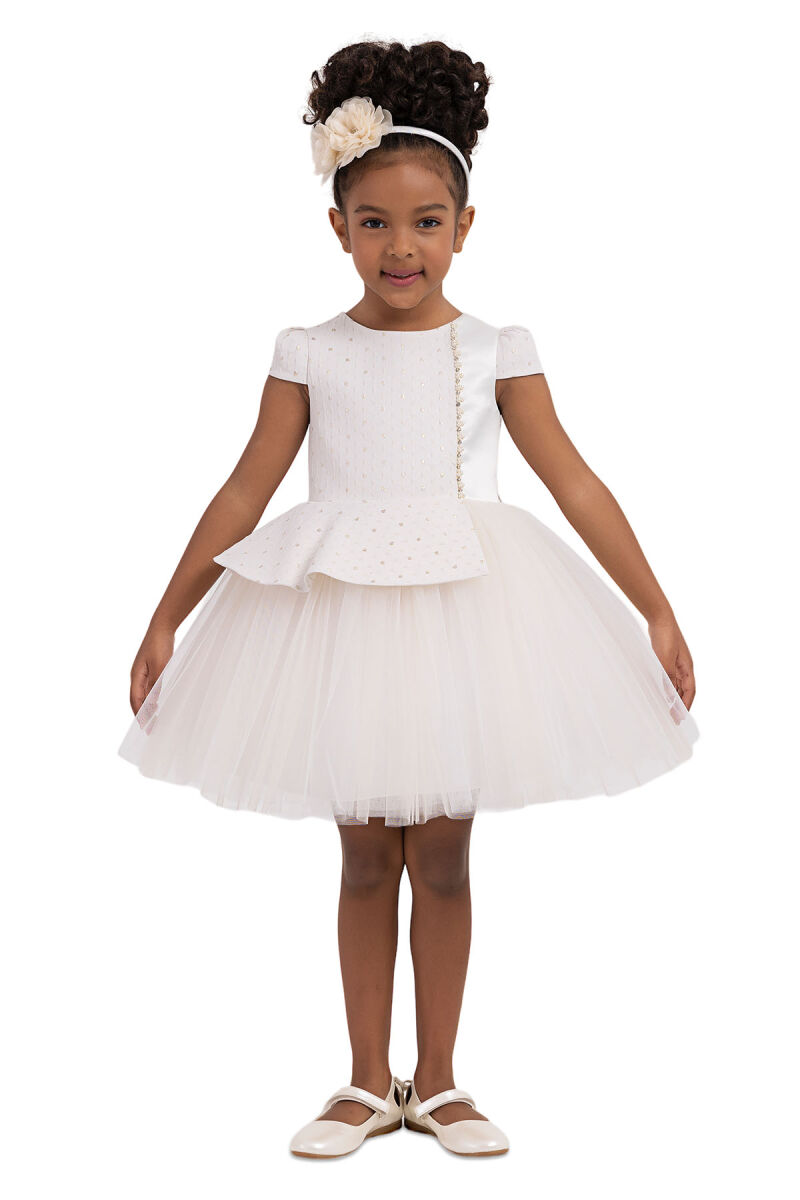 The upper part of the moon-sleeved, crew-necked girl dress was designed with textured jacquard fabric and satin fabric. The dress with pearl and stone embroideries that come down to its waist from its neck has an elegant shining. The skirt has very eye-catching design with its attractive flounces on its waist. Tutu skirt of the dress has a fluffy form with laminated tulle. It is comfortable and healthy with cotton lining. The nice bow behind it is the most loveable of the PAMINA's designs.