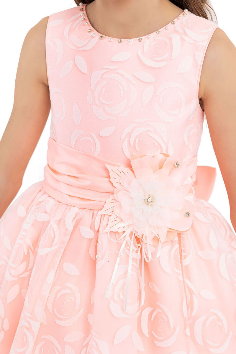 Sleeveless cutting girl dress was designed with organza textured fabric. Its crew-neck is adorned with pearl and stone embroideries. The dress with rose motive meets with an elegant flower on its waist. waist-shirring skirt is voluminous with soft tulle in it. The dress has a big and nice bow behind it. The huge flowery crown accessory will be felt special to the kids. Its cotton lining is comfortable and healthy for kids. It is an elegant choice to use as birthday dress, party dress.