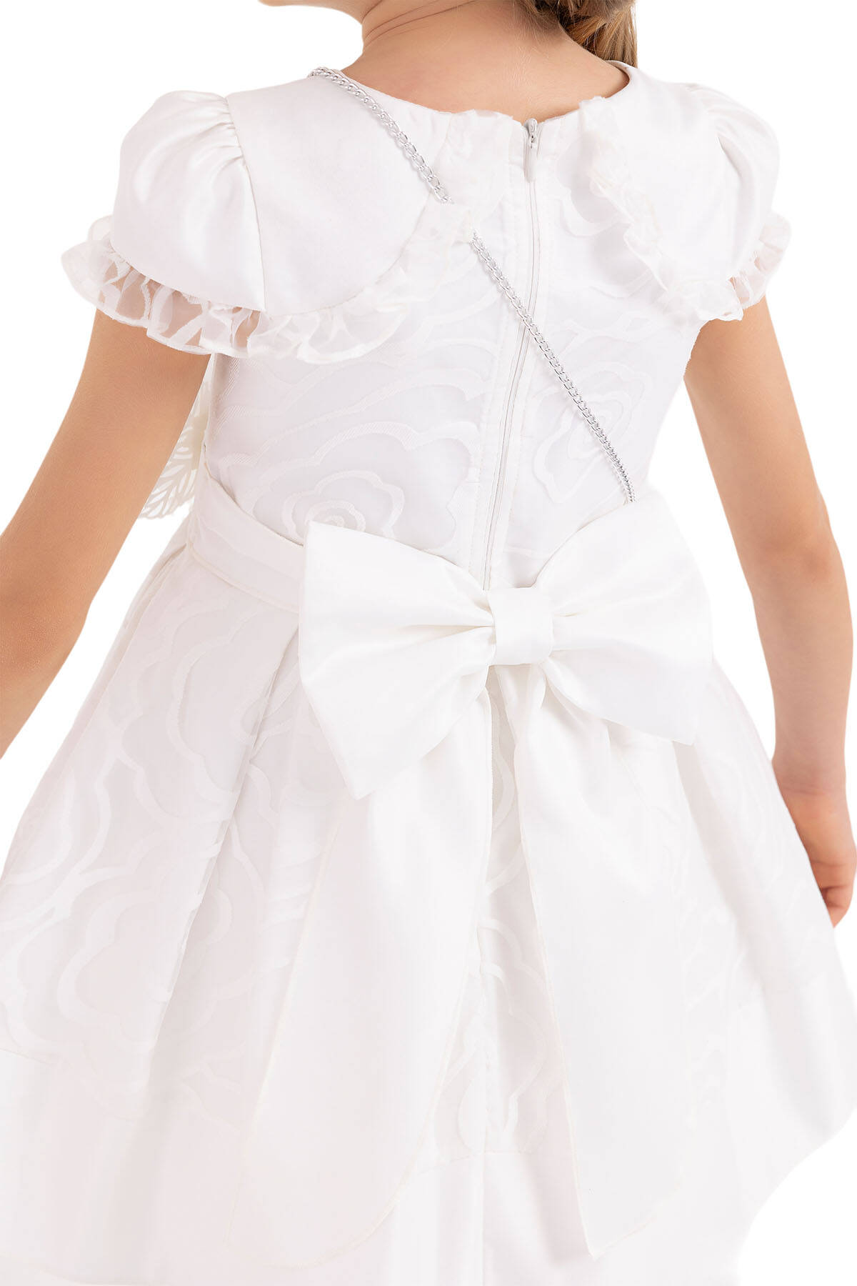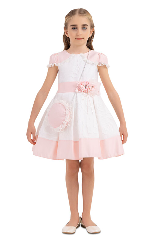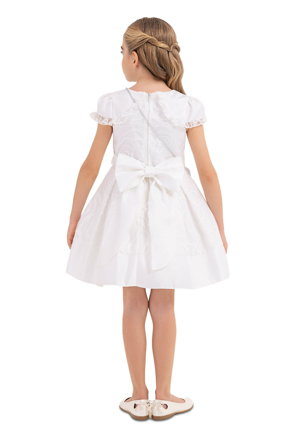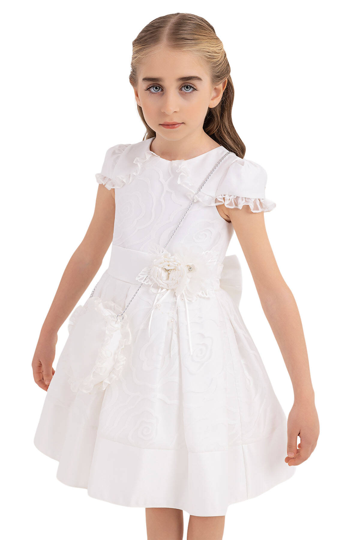 The shoulder cup, is reaching from the neck to the arm, of the moon-sleeved girl dress is ruffled. Its shoulder, belt, and hemline bands are with contrast colour and matte satin fabric. The skirt of the organza and self-patterned with flower dress was designed as inverted pleated. The skirt is voluminous with soft tulle embossing in it. Its cotton lining is soft and comfortable. The kids will crazy about the round bag is surrounded with ruffles. It is an elegant choice to use as birthday dress