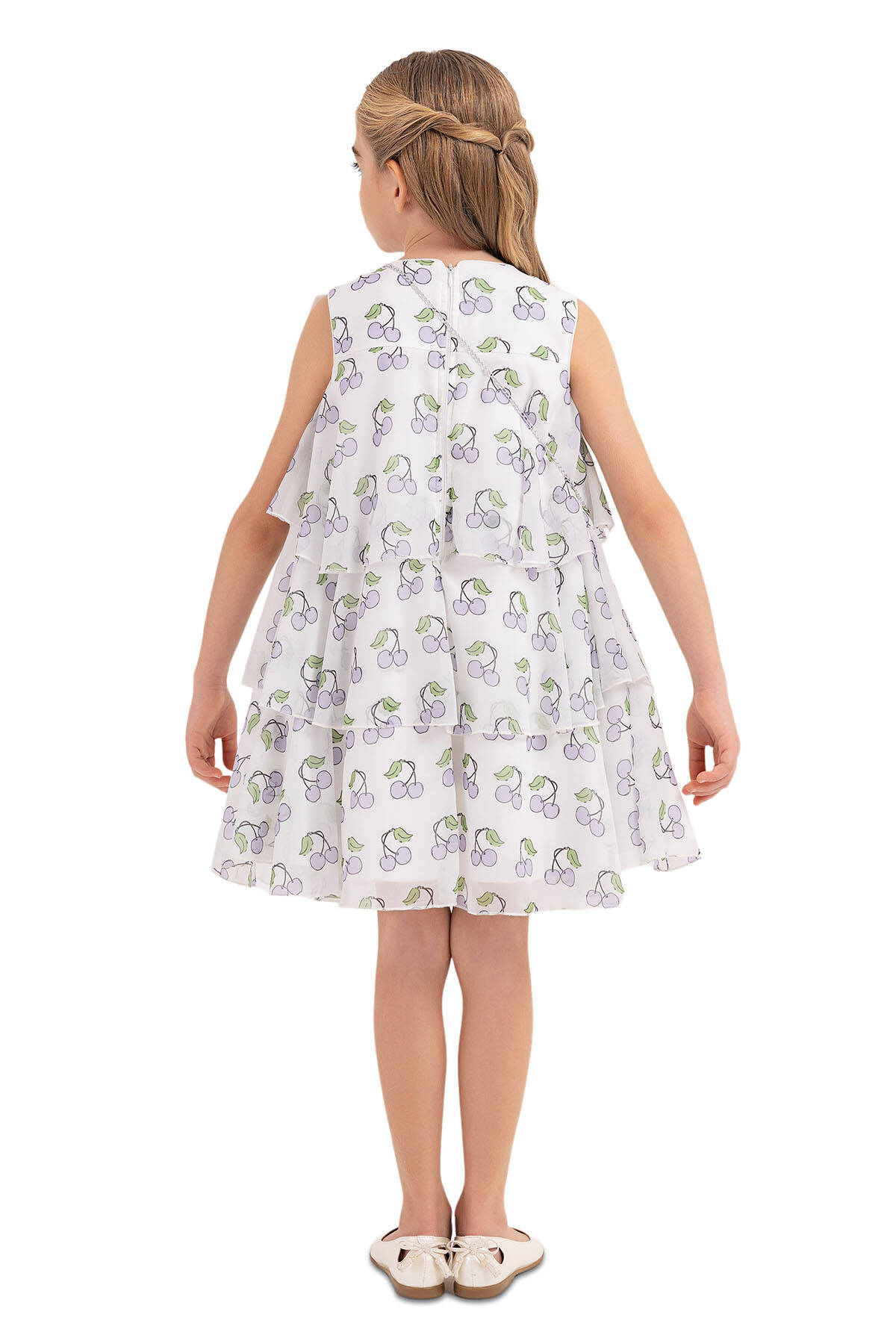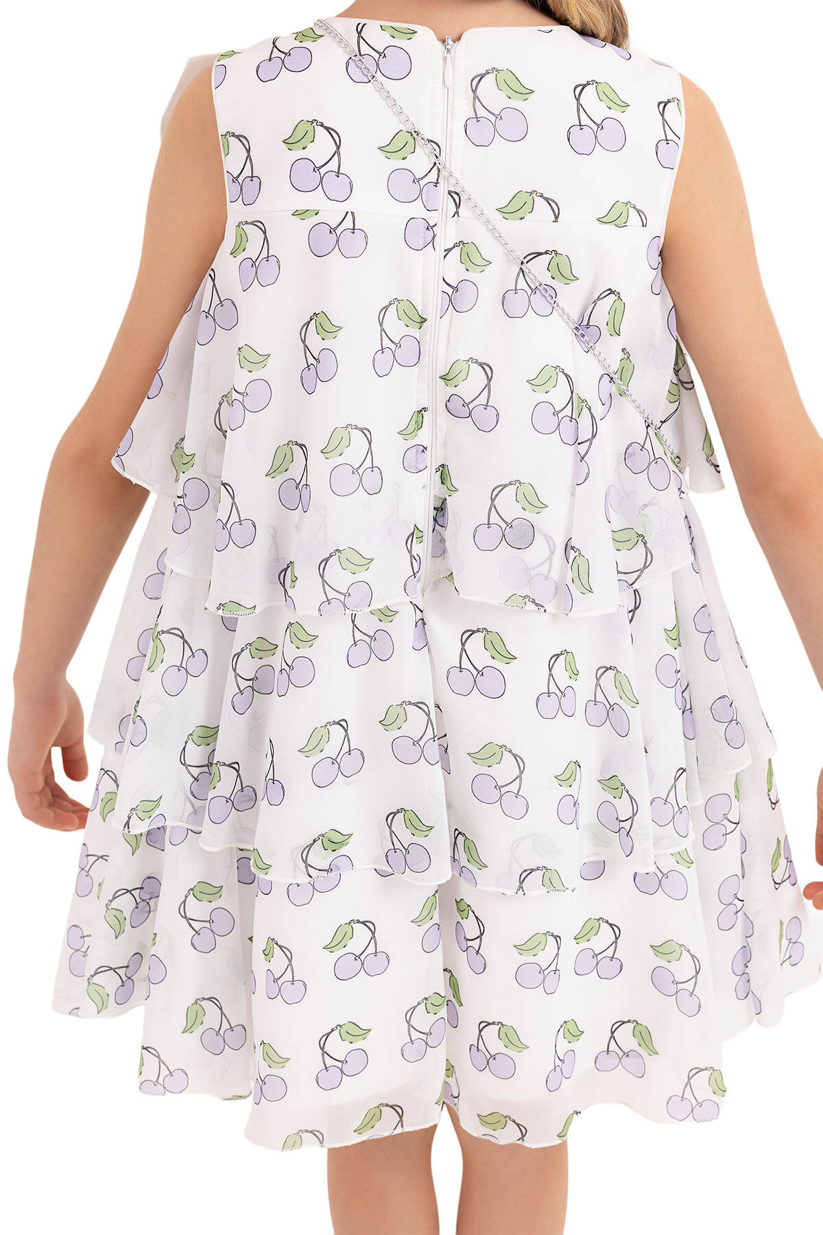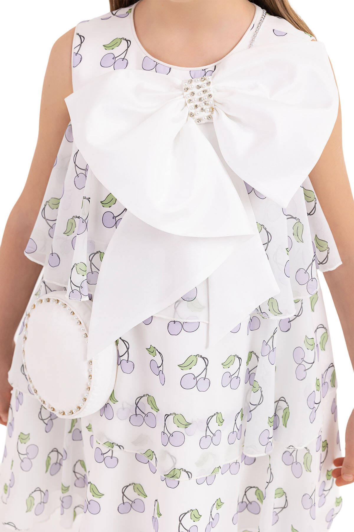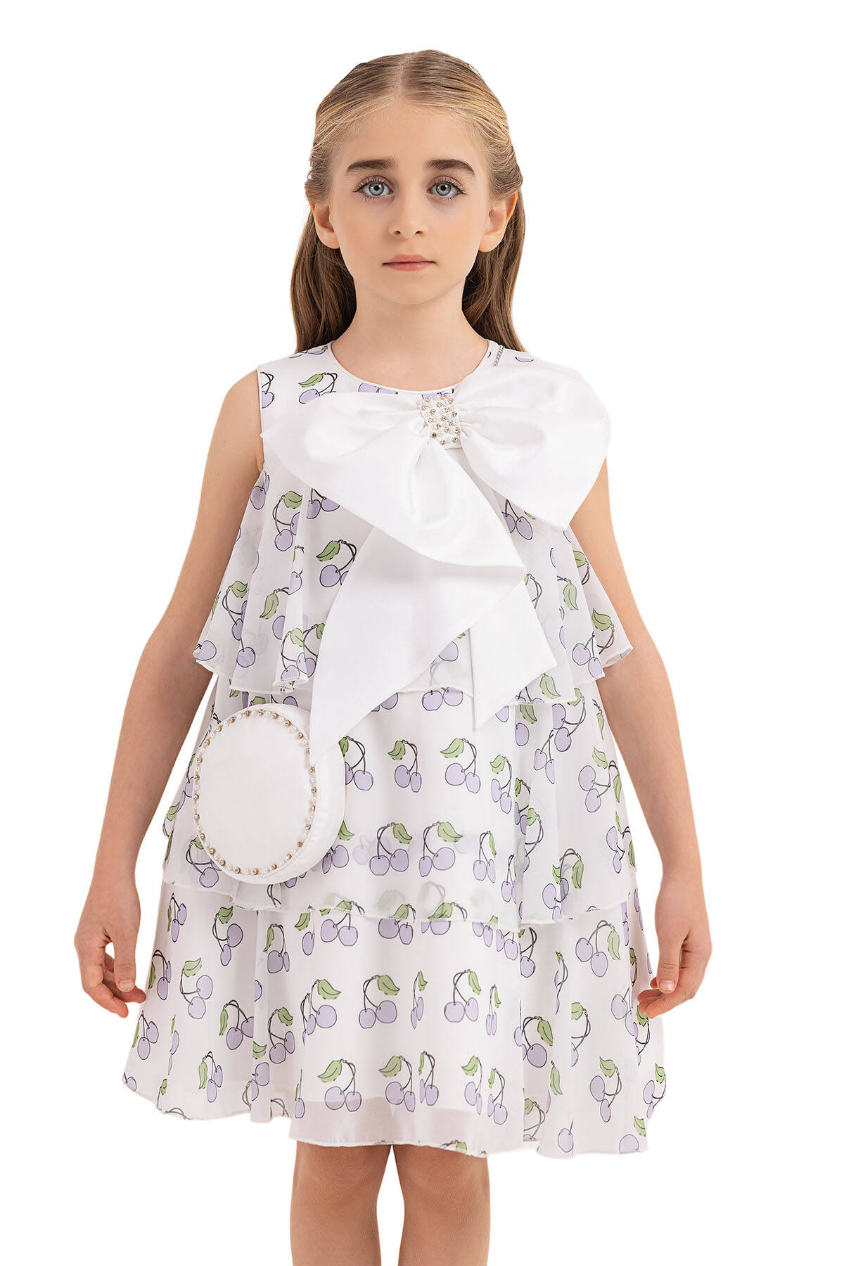 Cherry printed chiffon dress is on the form of bell-shaped. Sleeveless girl dress is very eye-catching with its pearl and stone embroidered bow on its neck. The skirt of the cherry printed chiffon dress is layered and bulged. The dress with cherry is ready for the summer with its pearl and stone embroidered round bag. Its cotton lining is soft and comfortable. It is an elegant choice to use for birthday dress, party dress, or special day dress.