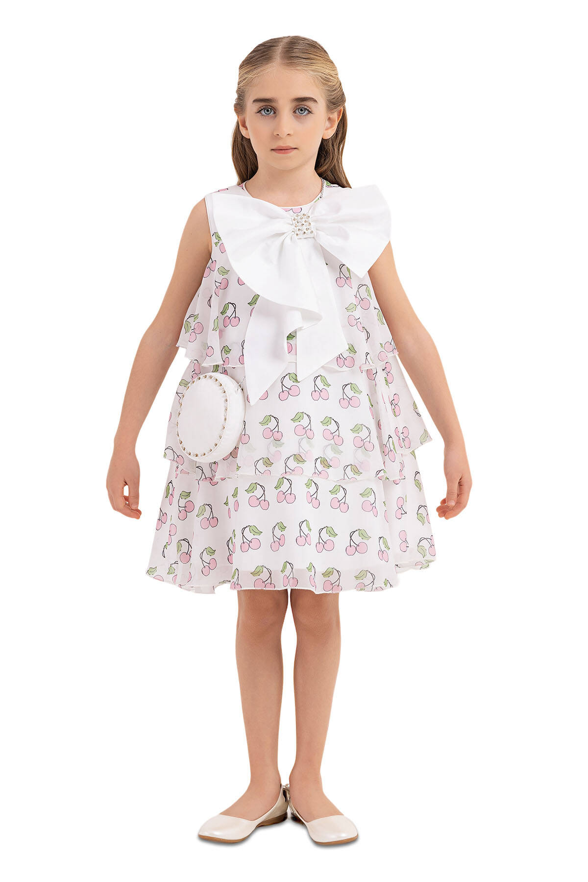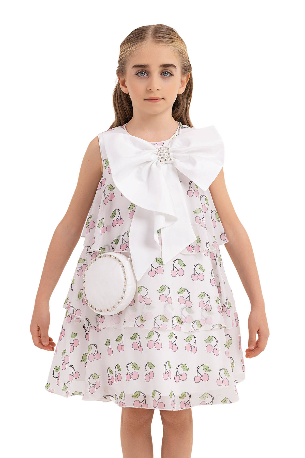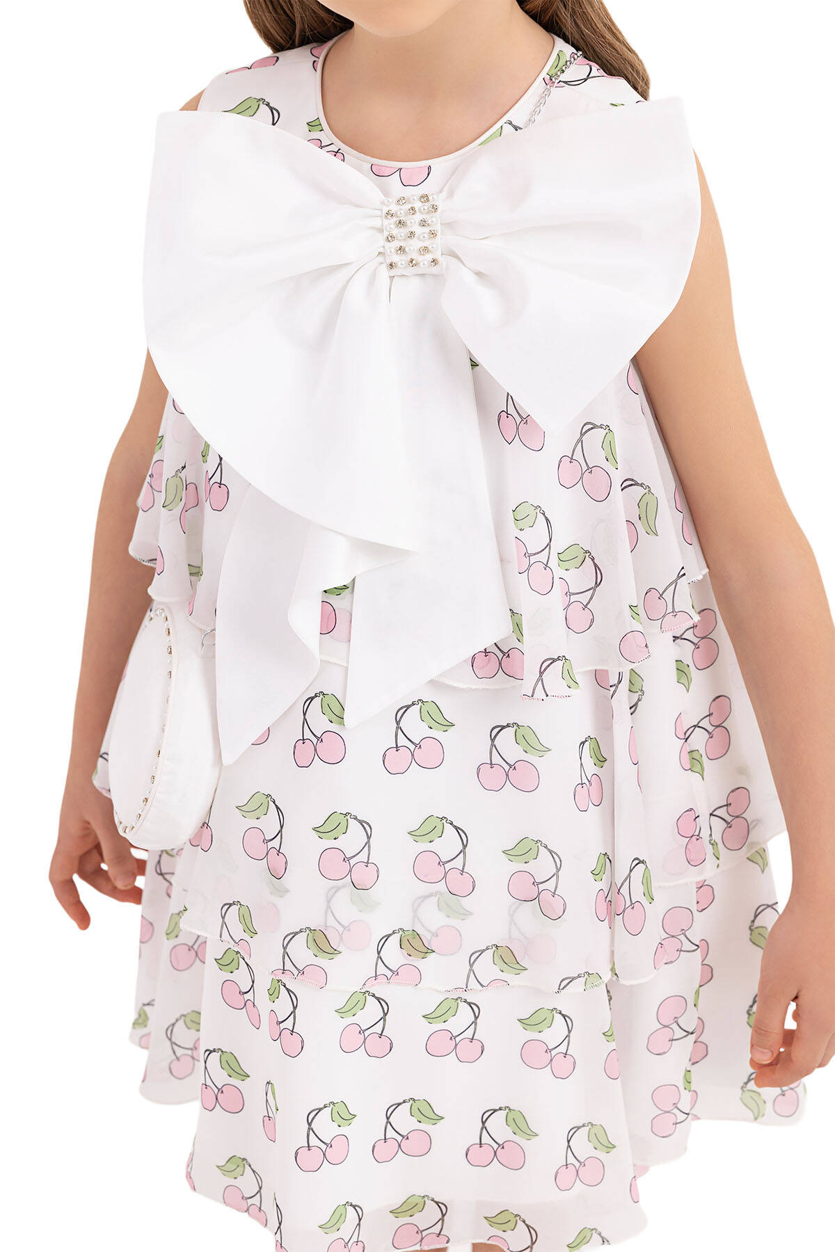 Cherry printed chiffon dress is on the form of bell-shaped. Sleeveless girl dress is very eye-catching with its pearl and stone embroidered bow on its neck. The skirt of the cherry printed chiffon dress is layered and bulged. The dress with cherry is ready for the summer with its pearl and stone embroidered round bag. Its cotton lining is soft and comfortable. It is an elegant choice to use for birthday dress, party dress, or special day dress.