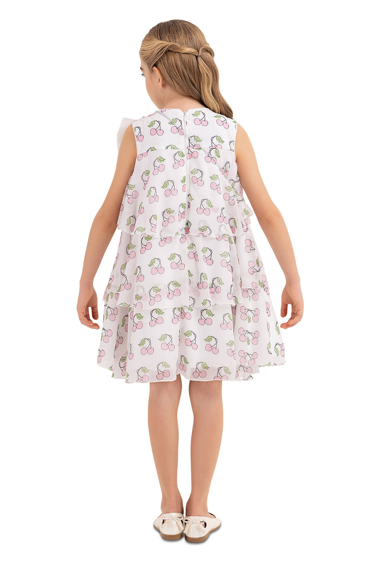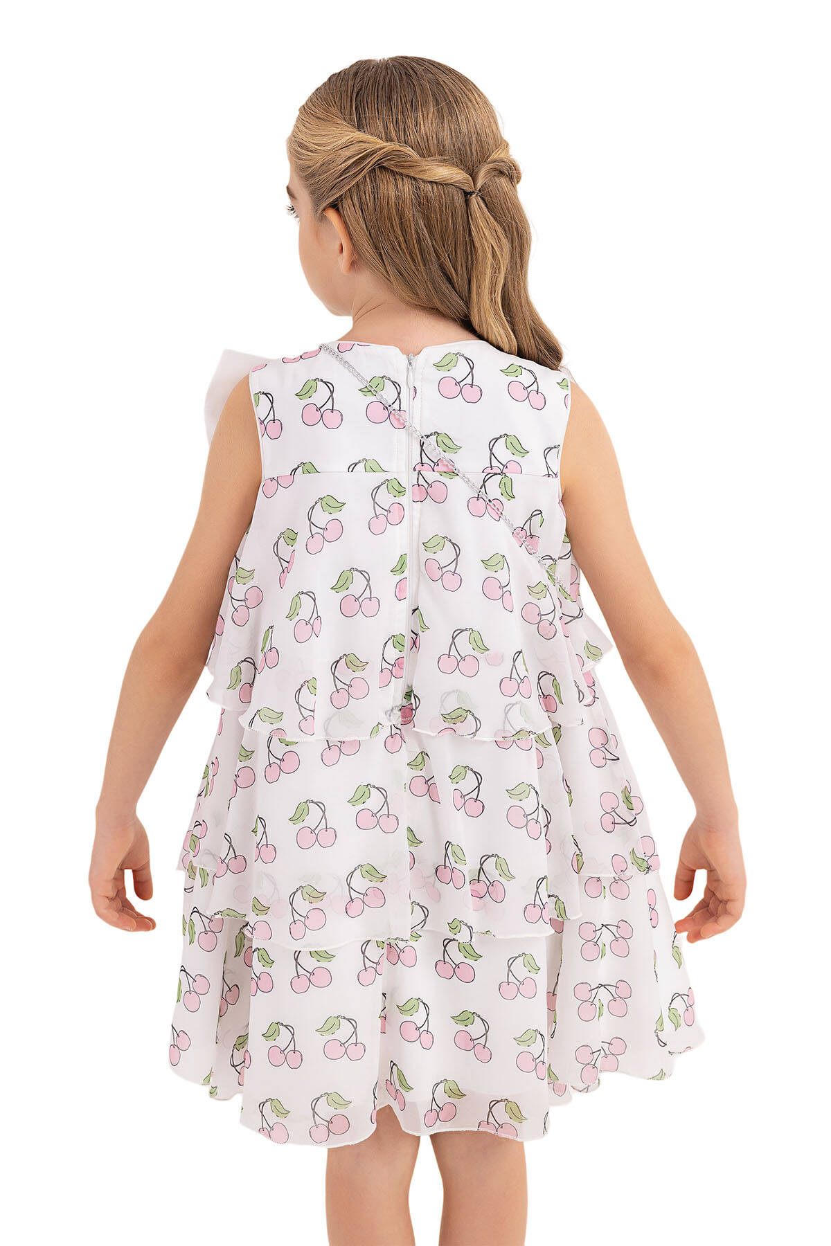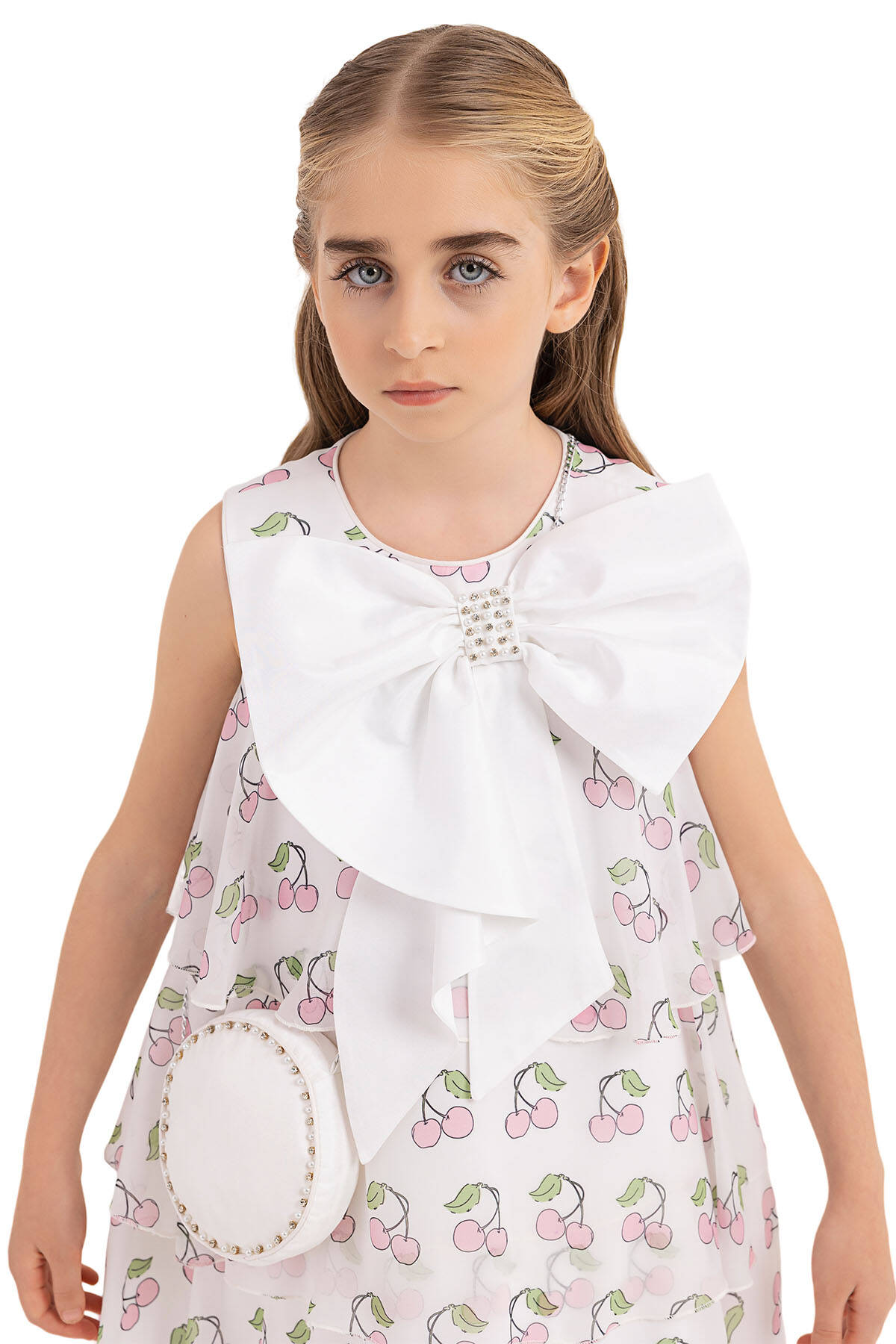 Cherry printed chiffon dress is on the form of bell-shaped. Sleeveless girl dress is very eye-catching with its pearl and stone embroidered bow on its neck. The skirt of the cherry printed chiffon dress is layered and bulged. The dress with cherry is ready for the summer with its pearl and stone embroidered round bag. Its cotton lining is soft and comfortable. It is an elegant choice to use for birthday dress, party dress, or special day dress.