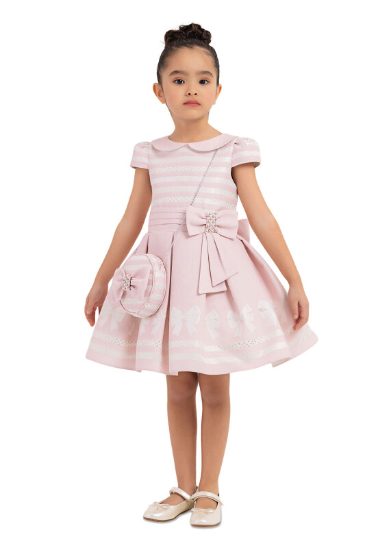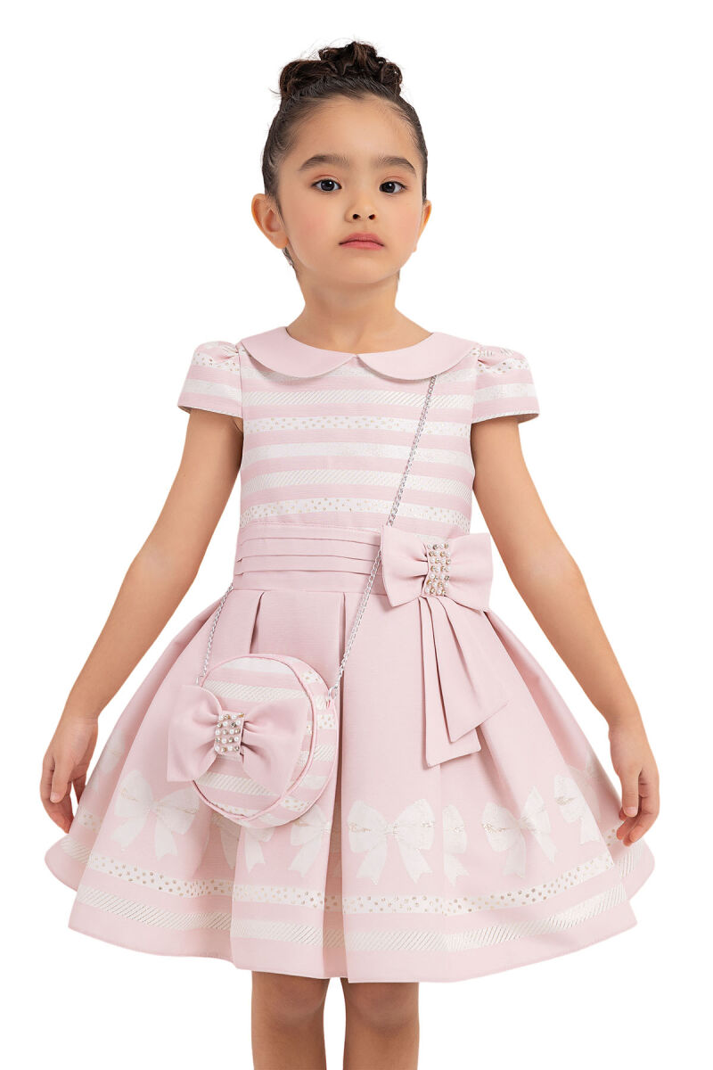 The yoke of the moon-sleeved and baby-collar dress was designed with stripy jacquard fabric. Pleated belt gives elegance to the dress with pearl and stone embroidered bow. The skirt of inverted pleated dress is very cute with bow motives. The skirt is voluminous with soft tulles in it. The big bow on the back of it is from the most loveable details by kids. The bag with chain is special design of PAMINA for kids. Its cotton lining is soft and comfortable. It is an elegant choice to use for