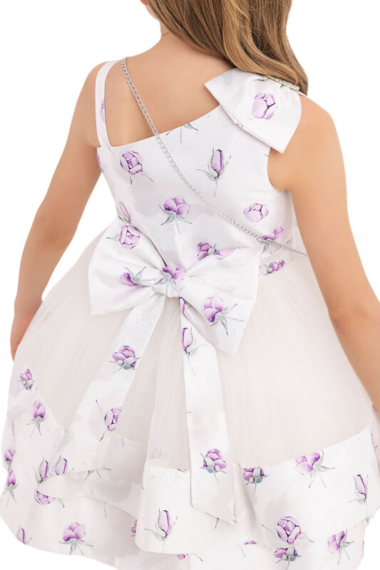 It is a girl dress with layered skirt that its right shoulder is with bow and the left shoulder has a detail of band strap. Flower printed tulle dress is from the most loveable designs by kids. Its layered skirt adds dynamism with its bands from flowery jacquard to the dress. waist-shirred layered tulle skirt has a fluffy form with soft tulle in it. Its round bag is from the sparkling designs of this summer with its stony clap. Its cotton lining is soft and comfortable. It is an elegant choice