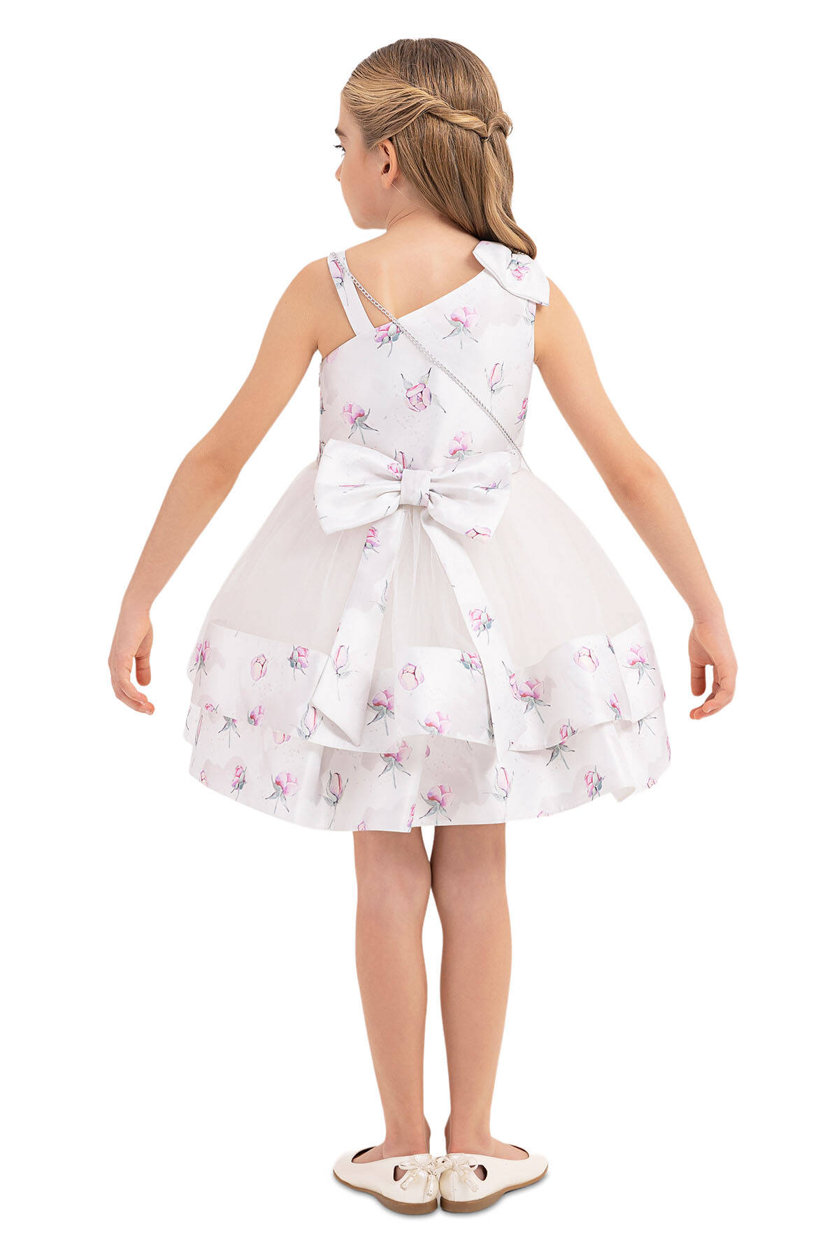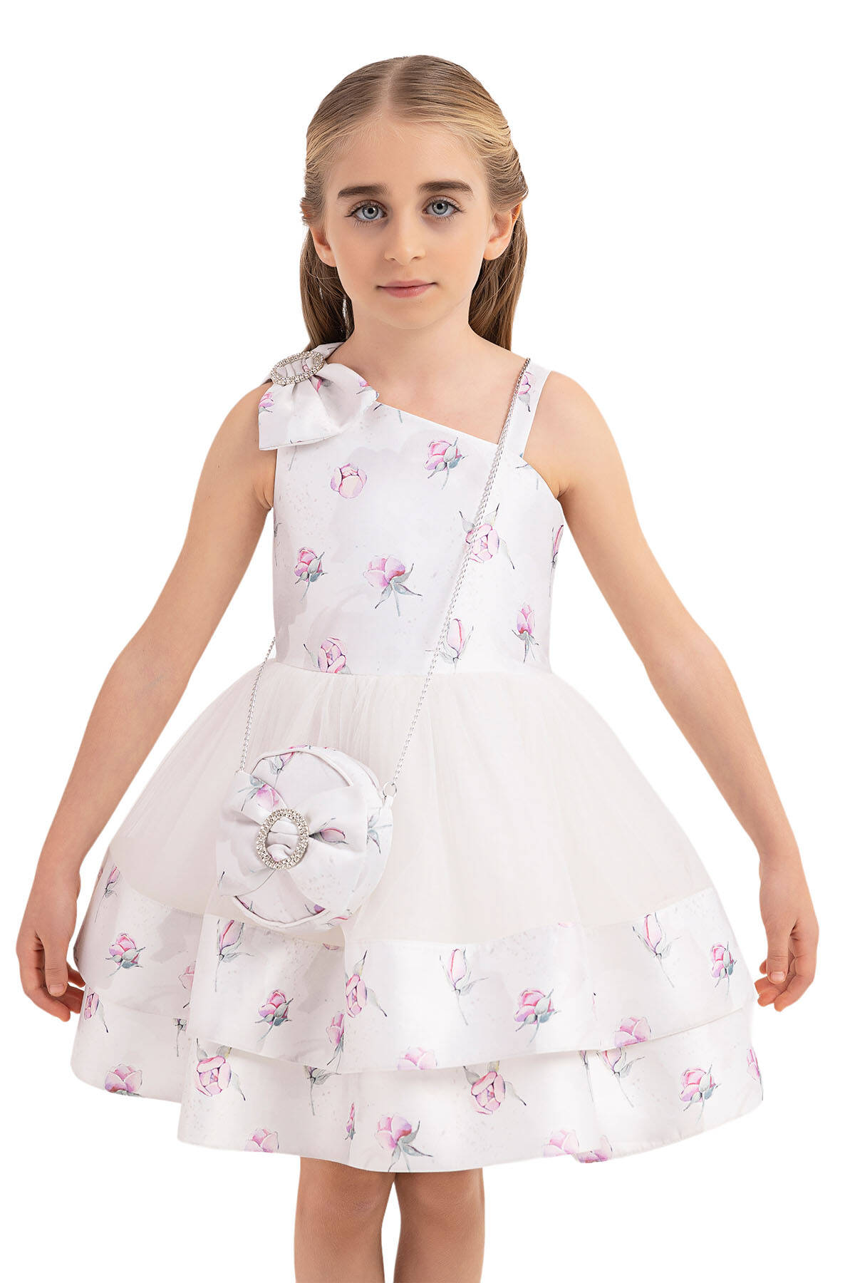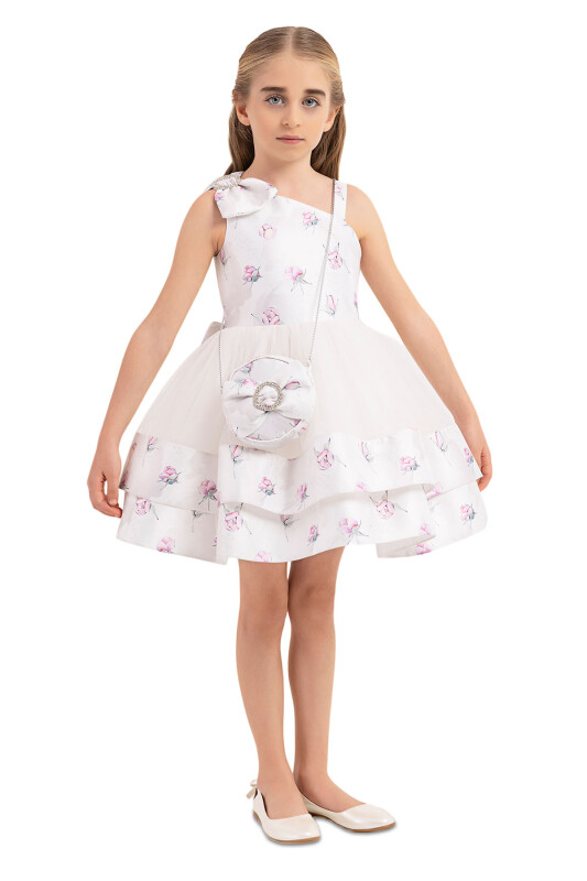 It is a girl dress with layered skirt that its right shoulder is with bow and the left shoulder has a detail of band strap. Flower printed tulle dress is from the most loveable designs by kids. Its layered skirt adds dynamism with its bands from flowery jacquard to the dress. waist-shirred layered tulle skirt has a fluffy form with soft tulle in it. Its round bag is from the sparkling designs of this summer with its stony clap. Its cotton lining is soft and comfortable. It is an elegant choice
