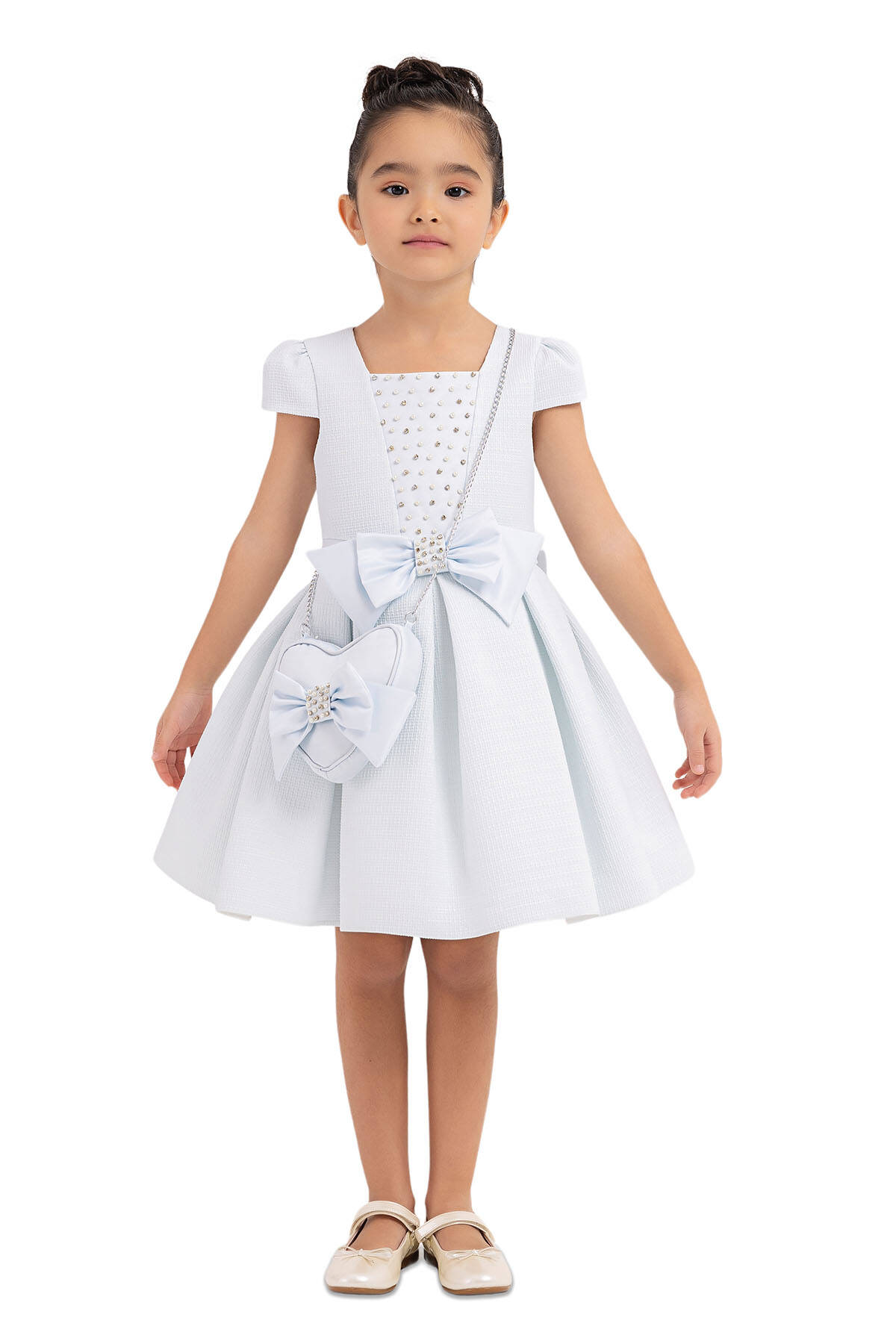 The front yoke of the girl dress has a nice design with pearl and stone embroidered V-detail on matte satin fabric. Moon-sleeved girl dress is sparkling with pearl and stone embroidered bow accessory. The skirt of the dress that was designed with textured jacquard fabric is inverted pleated. The skirt is voluminous. It has a big and cool bow on the back of it. Heart-shaped bag is special design of PAMINA for girls. Its cotton lining is soft and comfortable. It is an elegant choice to use