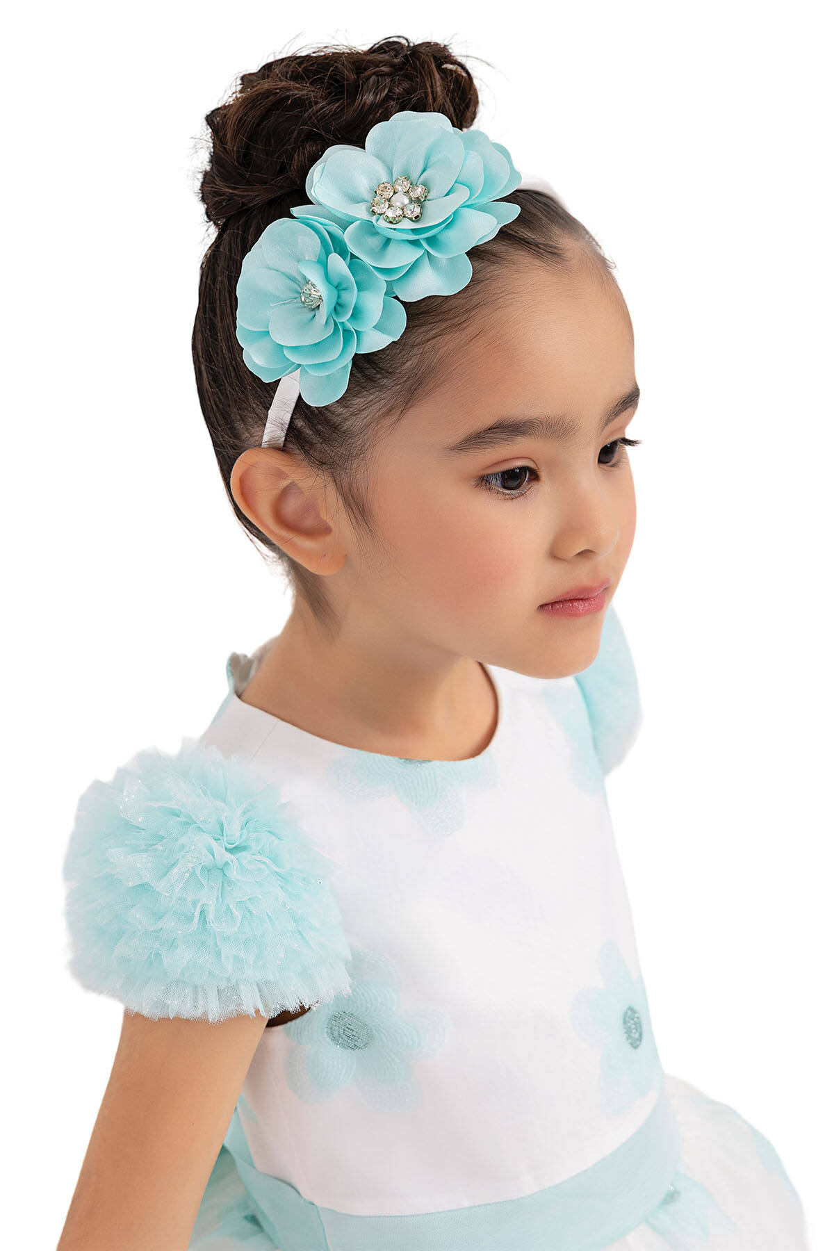 Strappy girl dress is very cute with scallop detail on its yoke. The dress was designed with organza fabric with flower motives and its straps, yoke, belt, and bow are covered with lycra tulle on satin fabric. The skirt of the flowery dress is waist-shirring. The skirt has a fluffy form. It is a cute summer dress with flower patterns. The girl dress has a big and cool bow on the back of it. Flowery crown accessory is special design of PAMINA for girls. Its cotton lining is soft and comfortable.