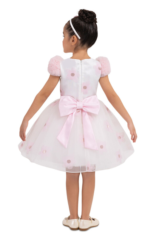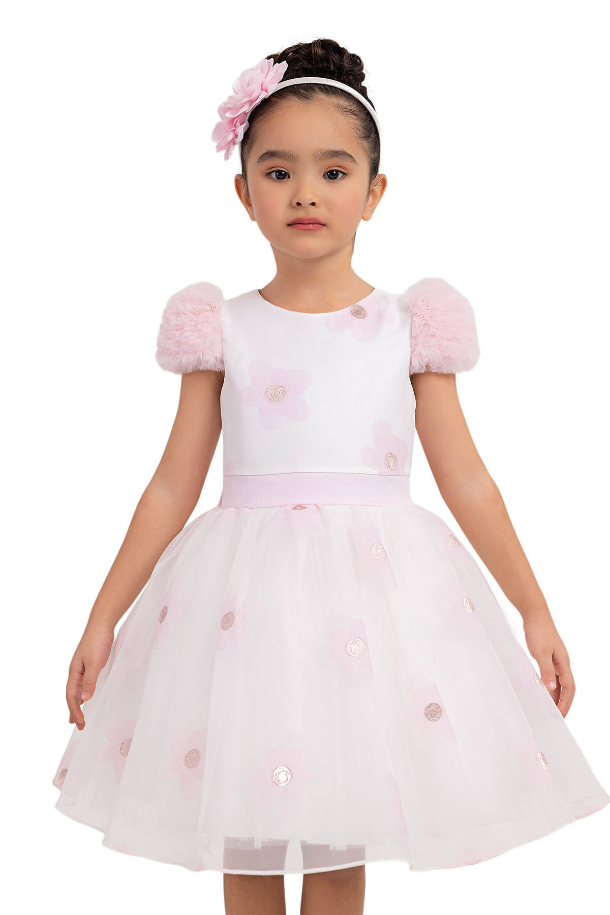 Strappy girl dress is very cute with scallop detail on its yoke. The dress was designed with organza fabric with flower motives and its straps, yoke, belt, and bow are covered with lycra tulle on satin fabric. The skirt of the flowery dress is waist-shirring. The skirt has a fluffy form. It is a cute summer dress with flower patterns. The girl dress has a big and cool bow on the back of it. Flowery crown accessory is special design of PAMINA for girls. Its cotton lining is soft and comfortable.