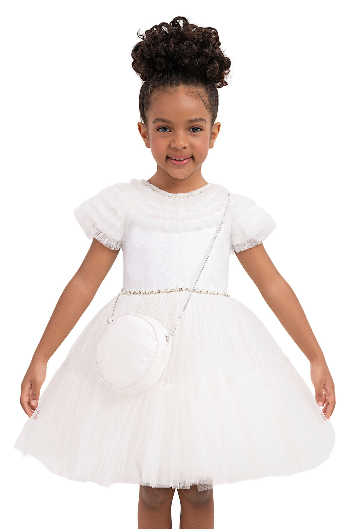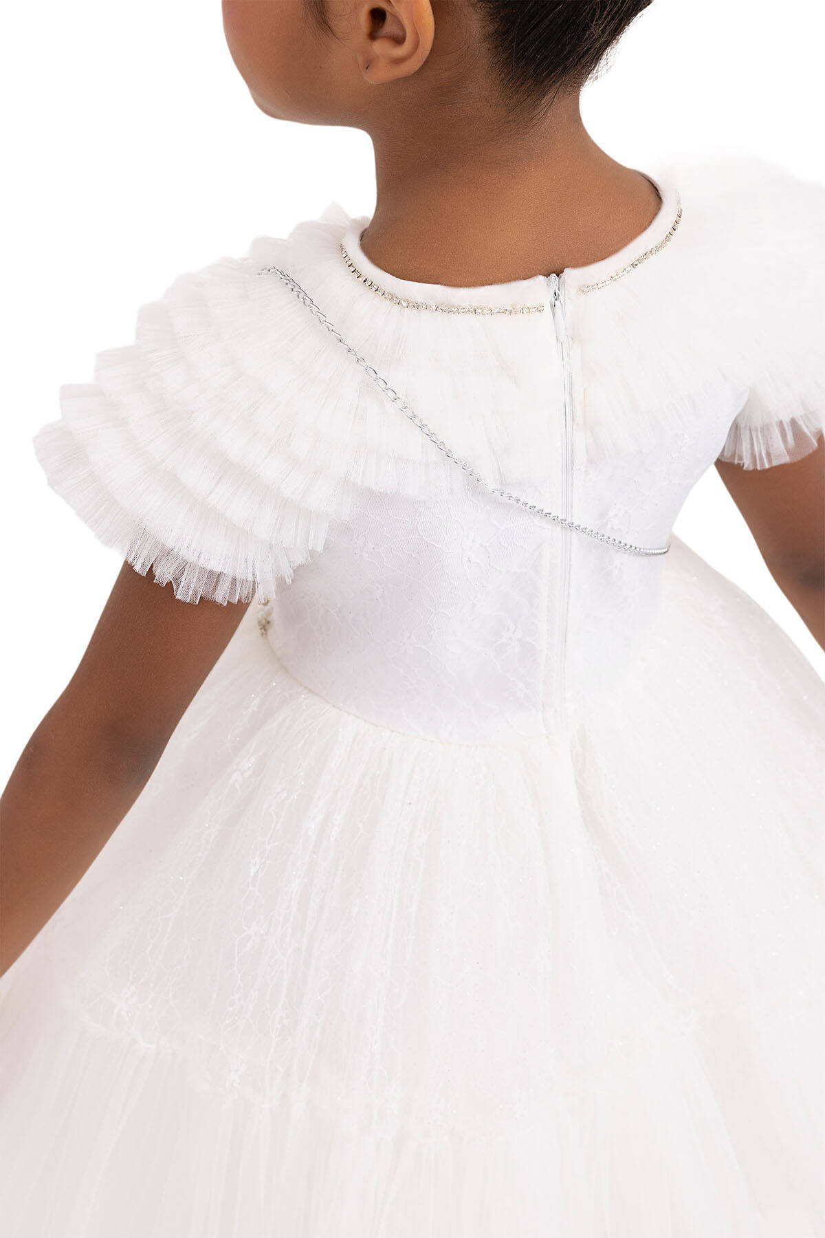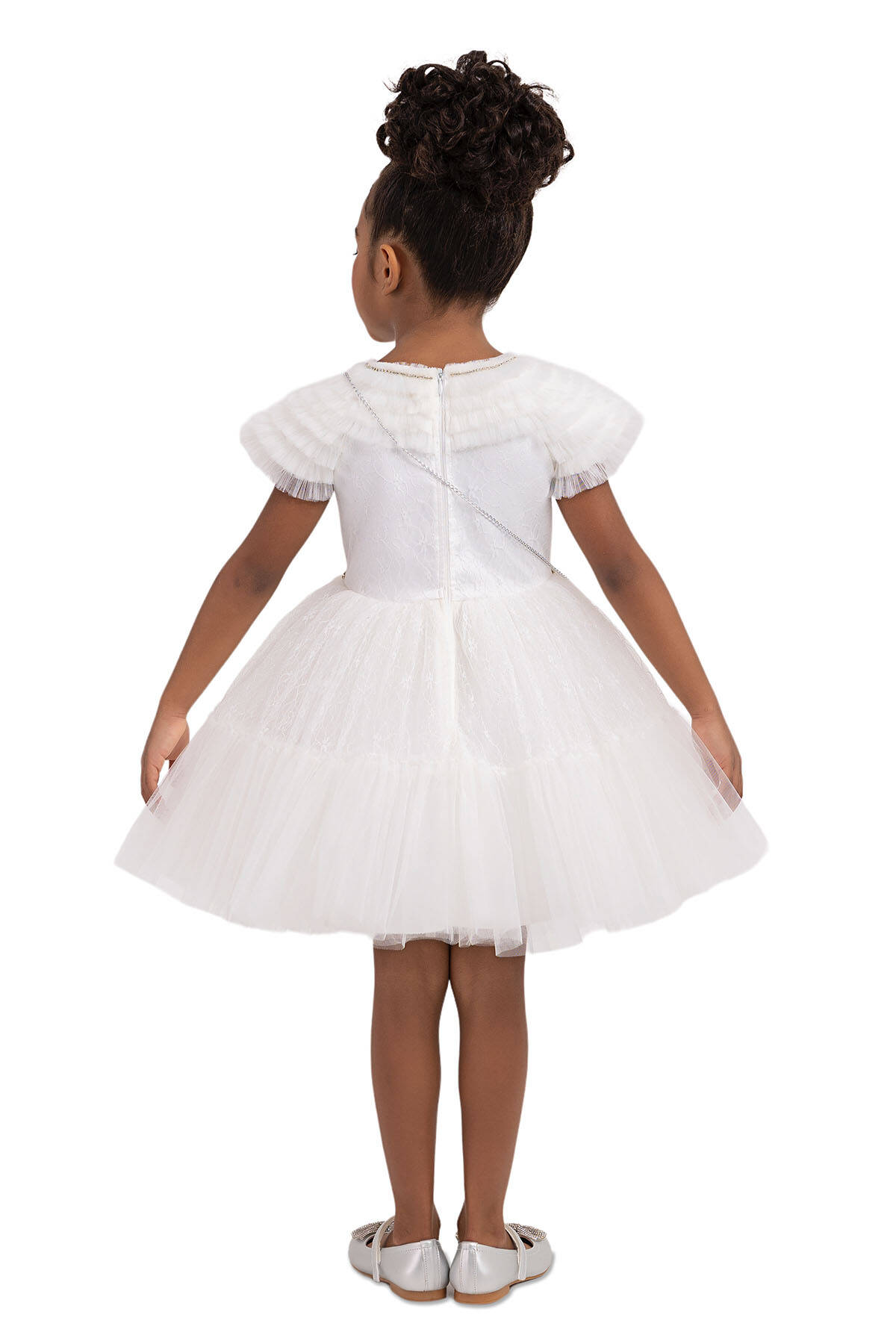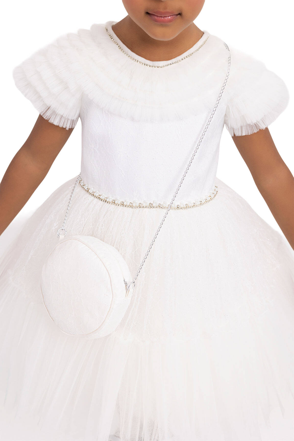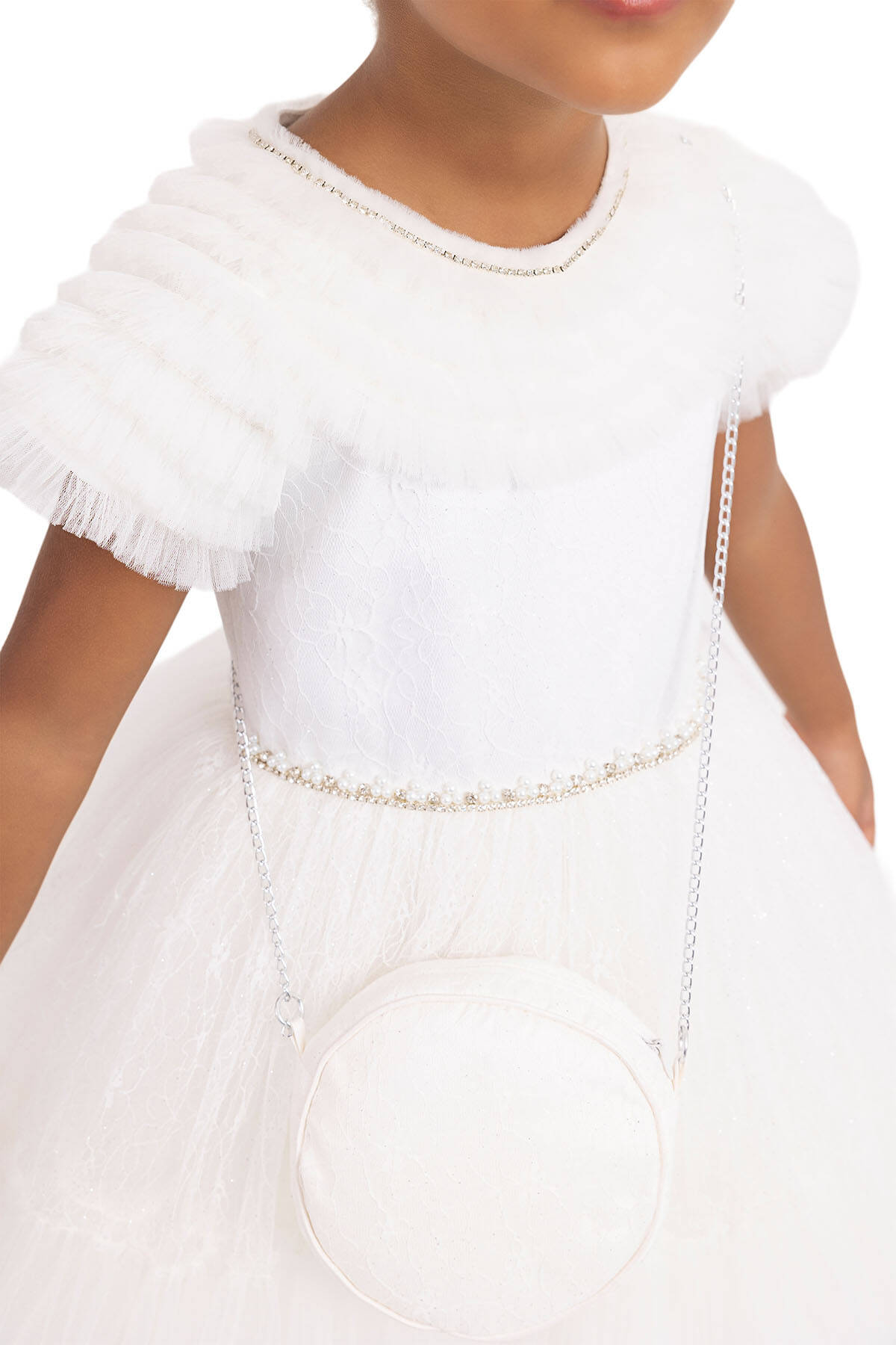 The girl dress taht its arms and upper yoke are adorned with ruffles was designed with silvery lace tulle fabric. The crew-neck of the girl dress is sparkling with pearl and stone embroideries. Its waist-shirred skirt is quite voluminous with tulles in it. The bag with chain is a great summer combine. Its cotton lining is soft and comfortable. It is an elegant choice to use for birthday dress, party dress, or special day dress.