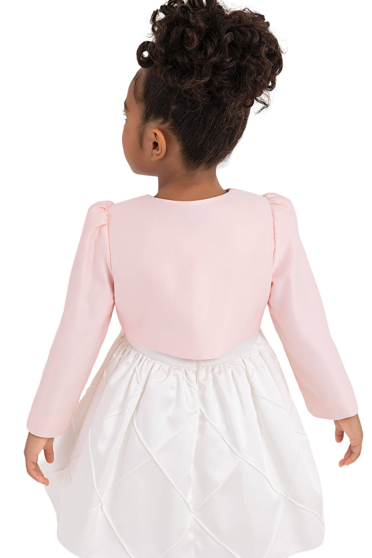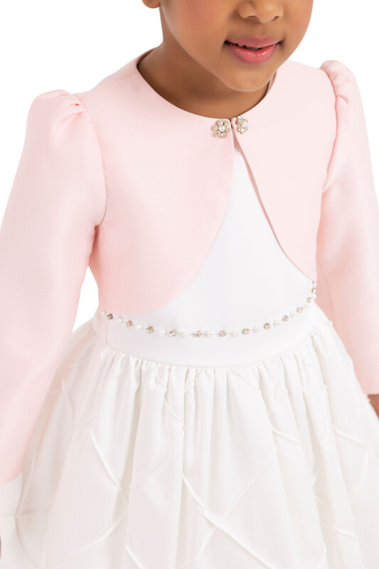 Long-sleeved and shoulder-shirred girl bolero is the most elegant complementary both on special days and for casual clothing. The bolero that its front neck is with hook and eye is sparkling with flowery shaped pearl and stone embroideries. Its cotton lining is soft and comfortable.