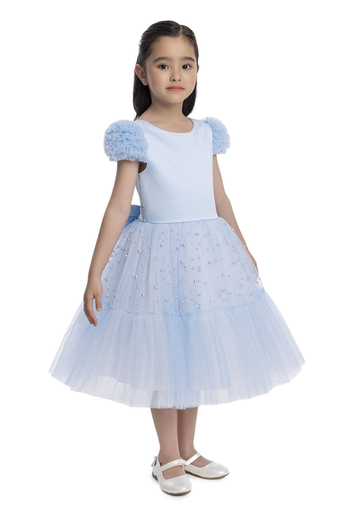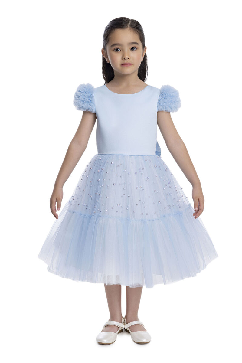 This cute dress with ruffle details is a model that kids will love. The upper bodice of the girl's dress is made of matte satin fabric, simple and elegant. The midi-length tulle skirt is adorned with pearls, giving the dress a fluttery shape that shines in any setting. The stylish girl's dress is ready to dazzle with its beautiful V-neck cut at the back and its satin sash with a bow. It is voluminous with soft tulle embossments on the inside and comfortable with its cotton lining. It's a great choice for birthdays, graduation parties, and special occasions.