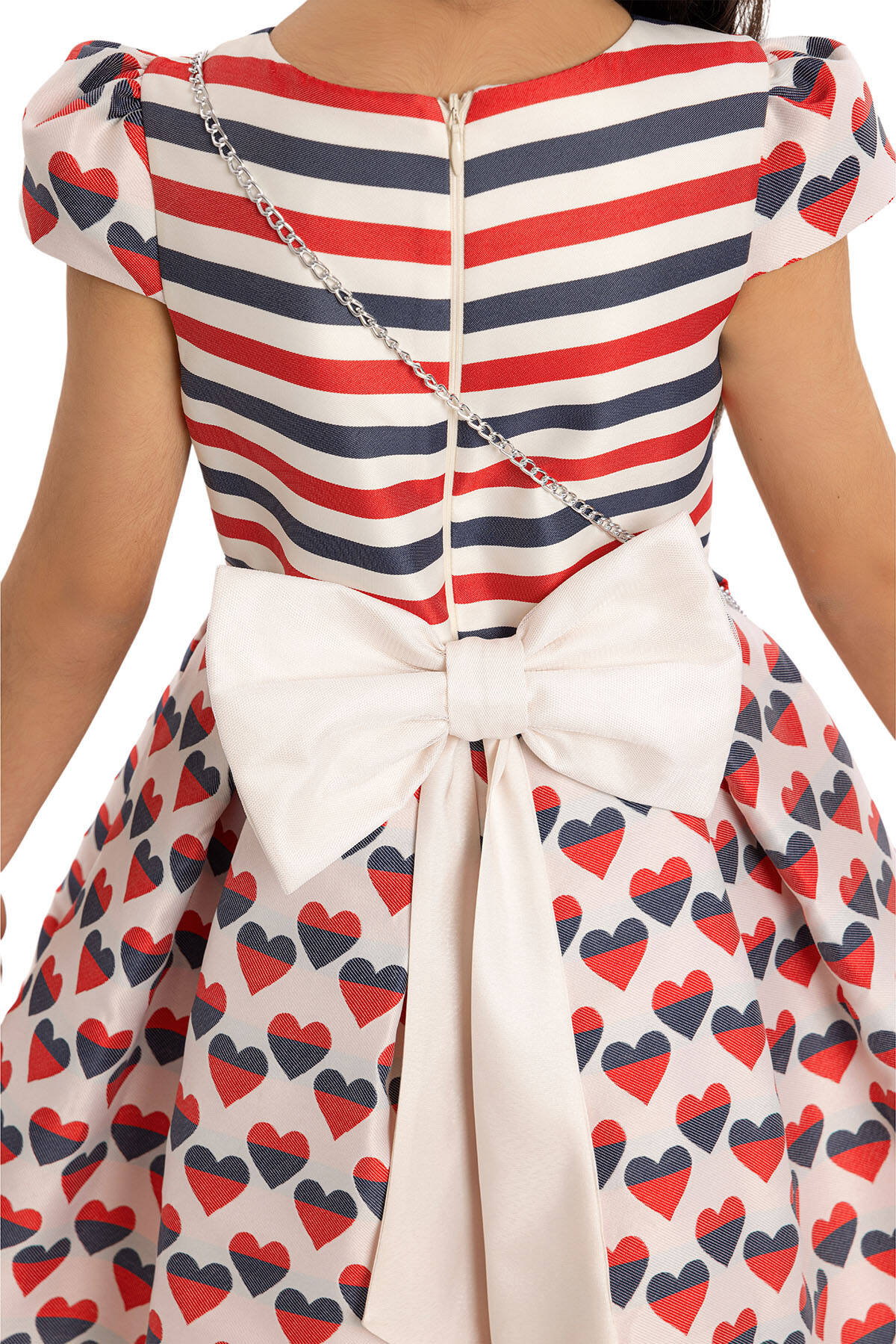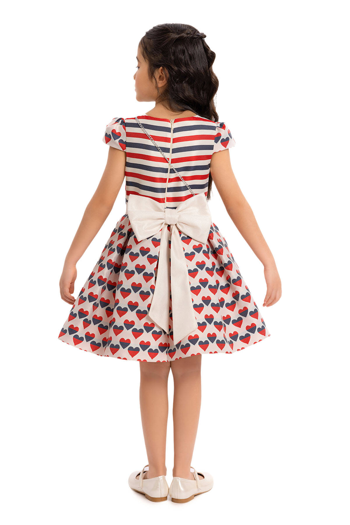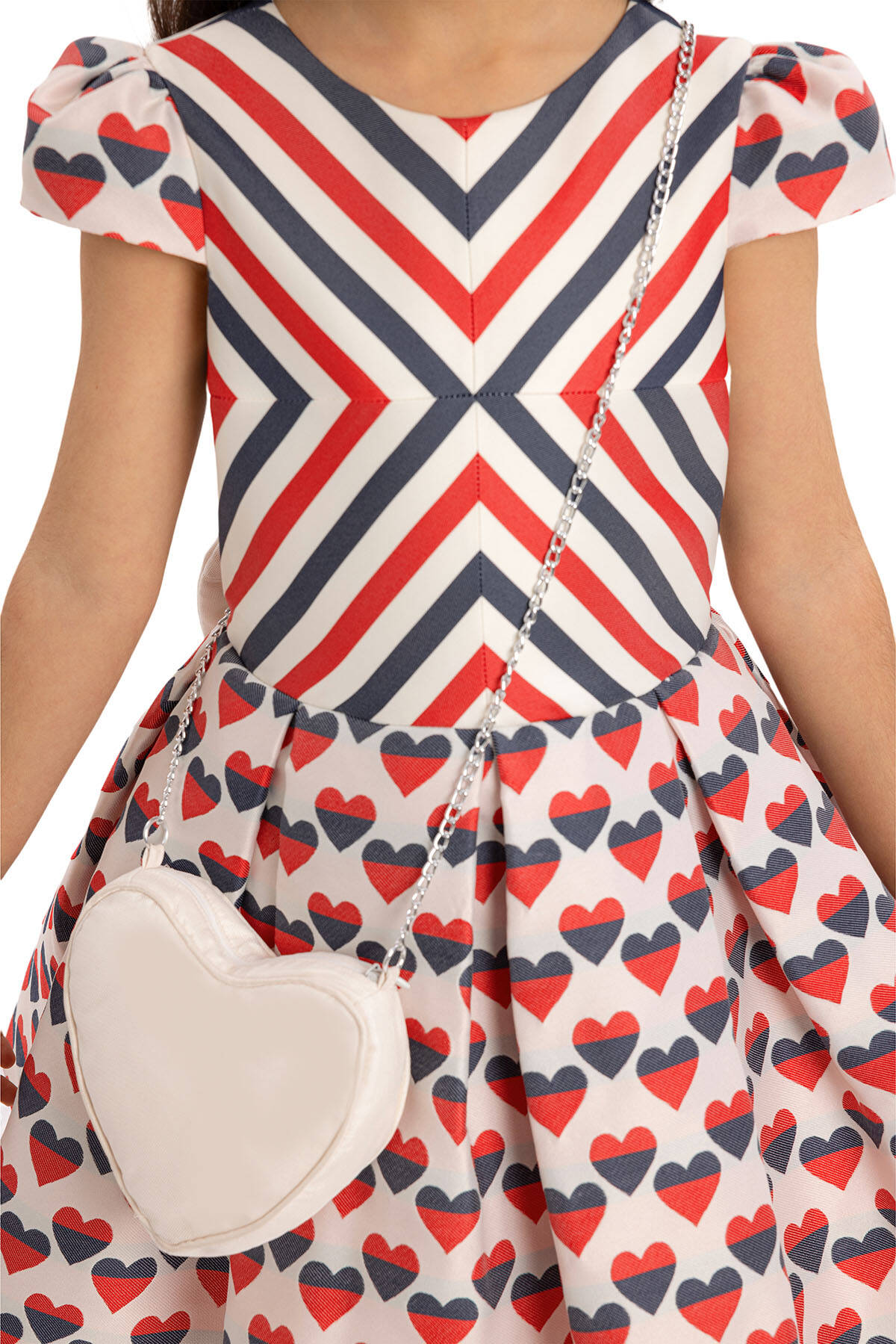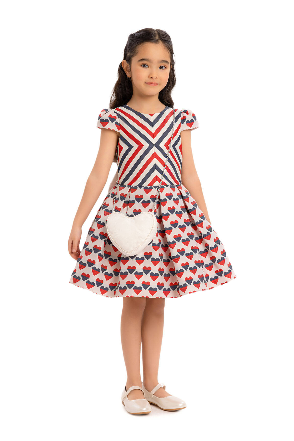 This special dress offers your child a stylish look with its moon-sleeved details. The upper body rosette features a striped fabric and a bias-cut detail for a unique touch. The pleated skirts are designed with heart-patterned fabric, creating a design that children will adore. This cute dress is perfectly complemented by a heart-shaped bag accessory. Make space in your summer wardrobe for this heart-patterned dress. The dress provides comfort and health with its 100% cotton lining. It's a chic choice for a birthday dress, party dress, or any special occasion.