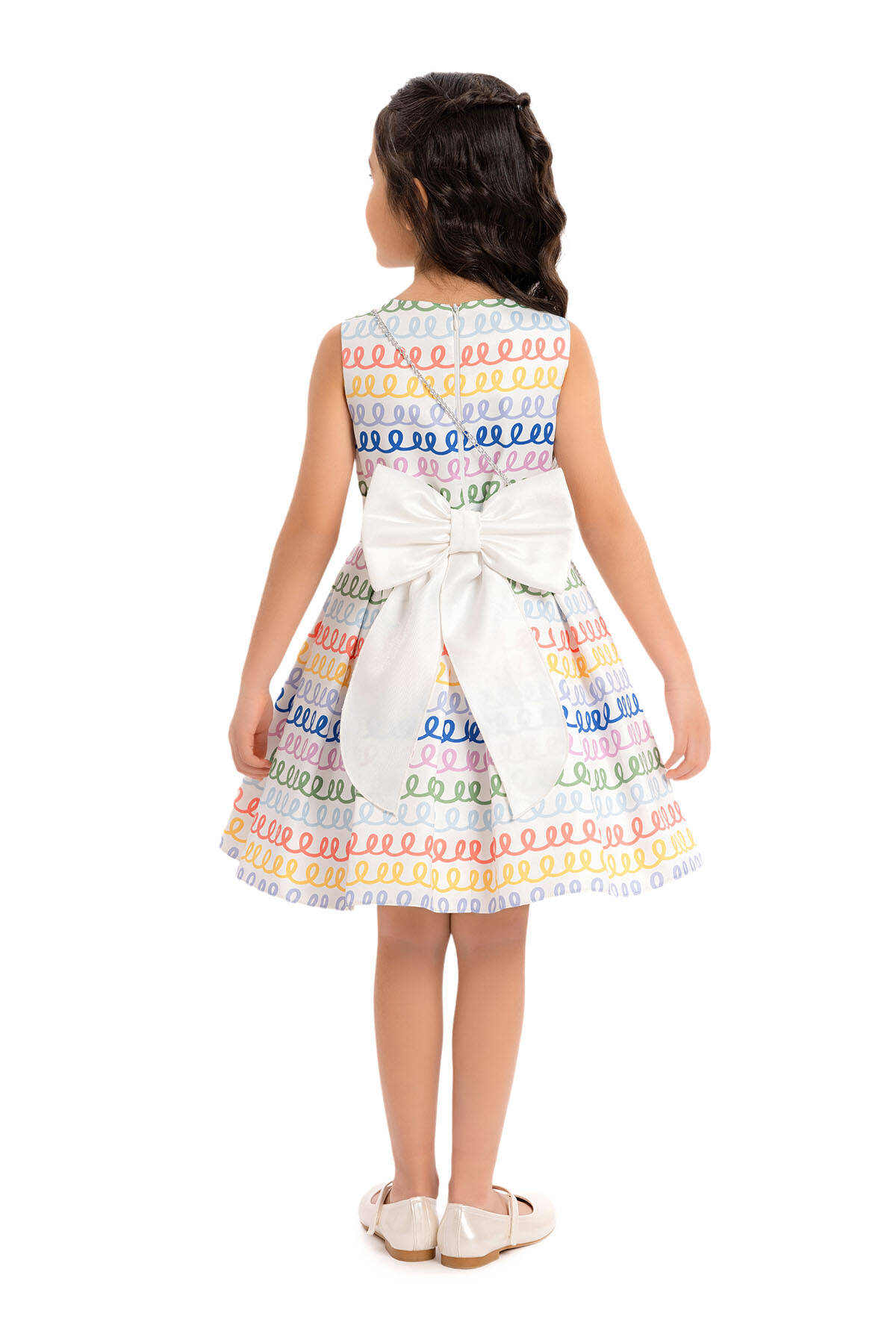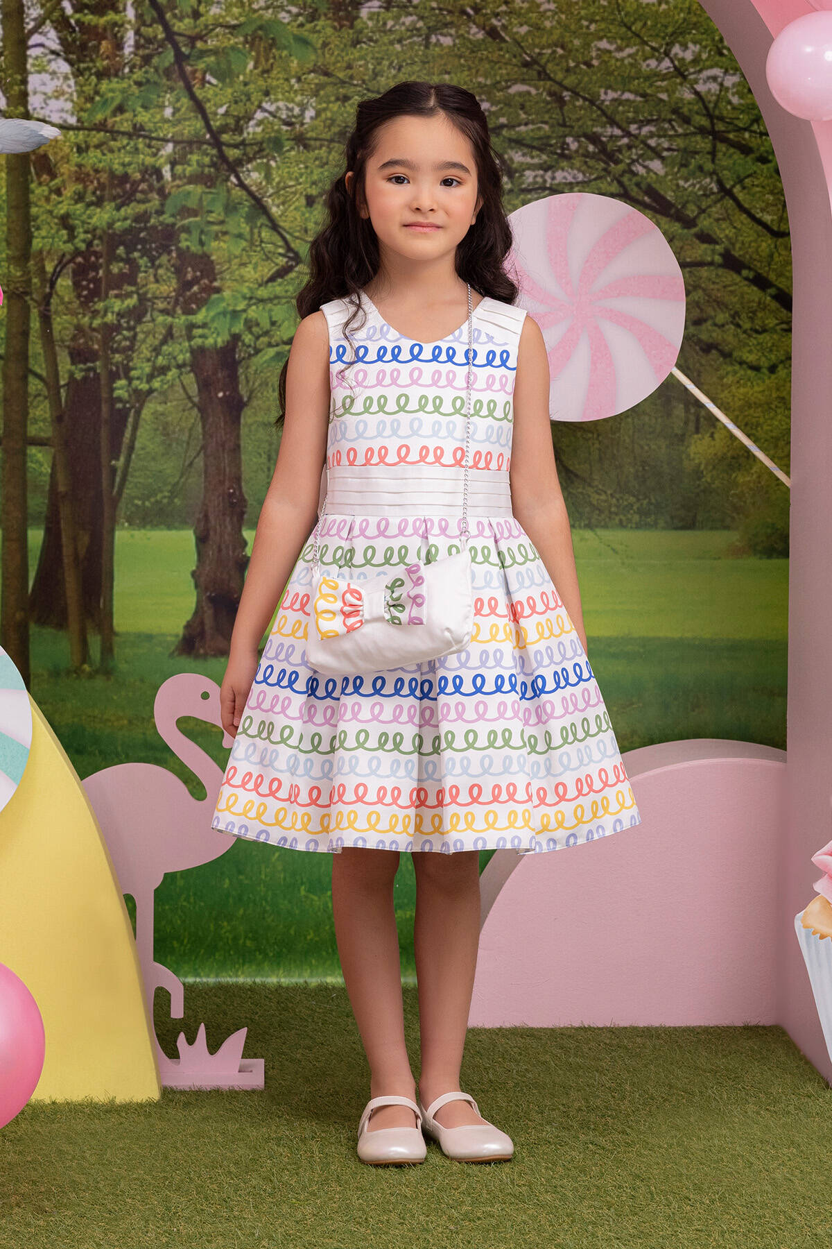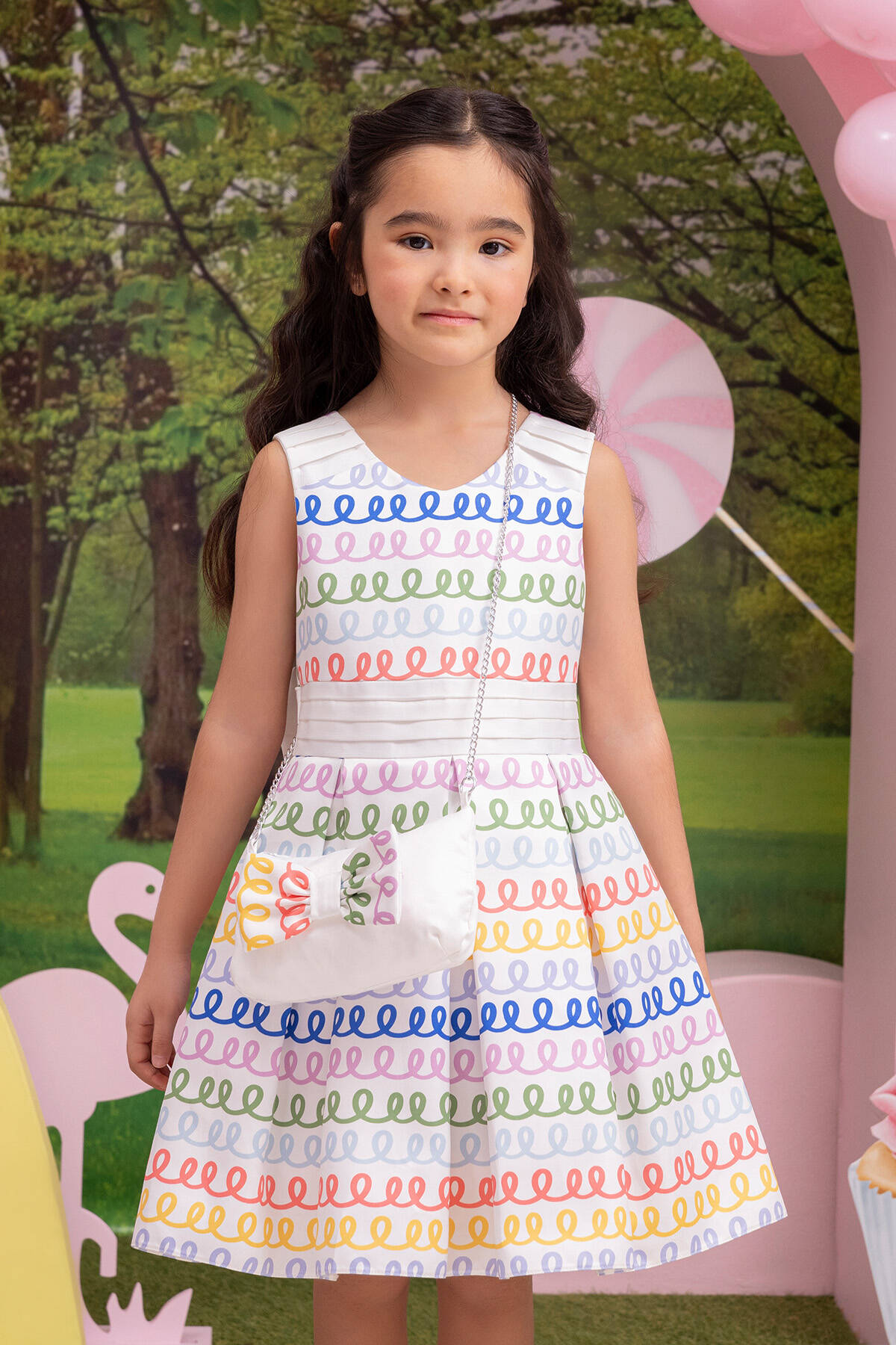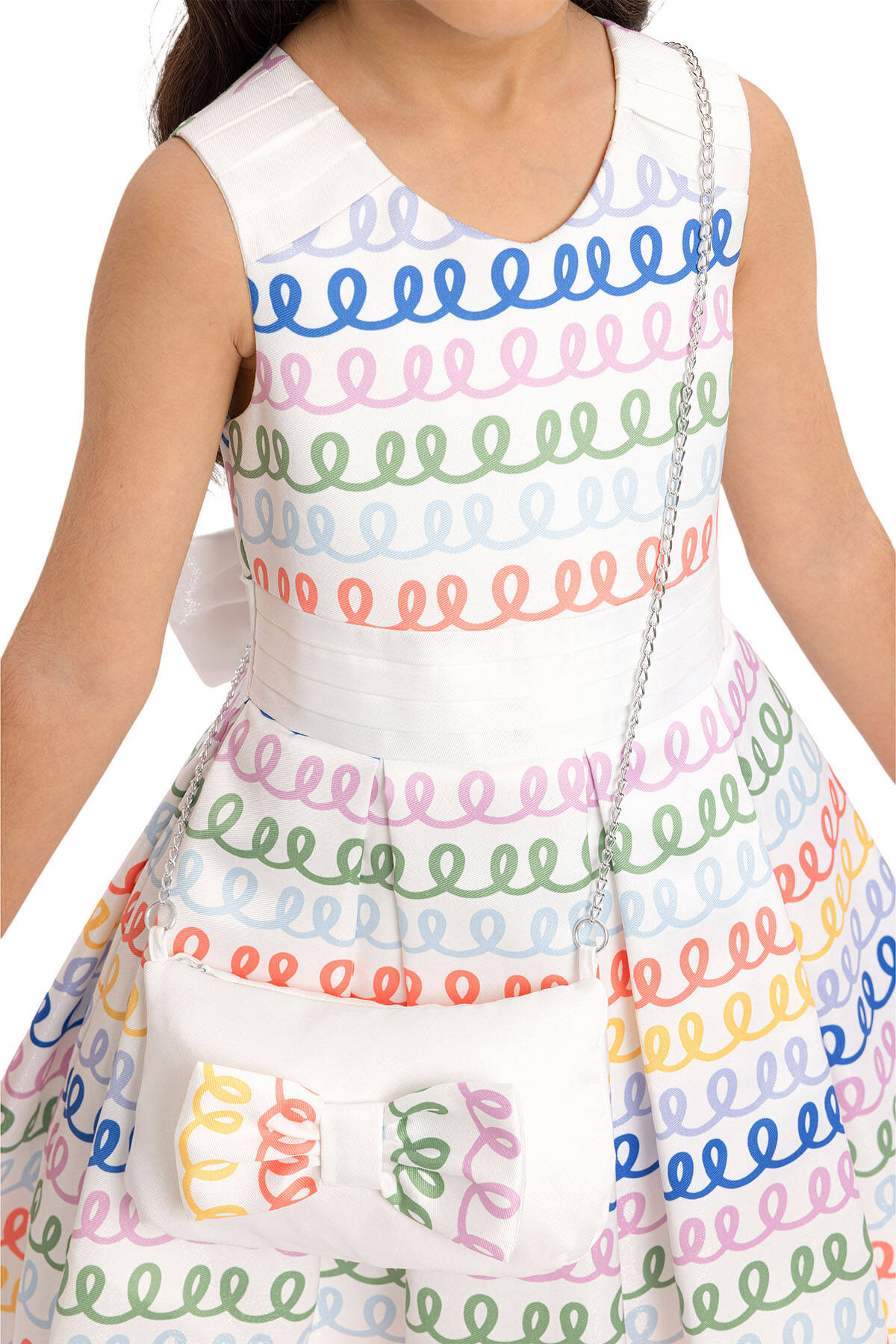 We've designed a Colorful dress for girls to feel the energy of the summer season. This comfortable sleeveless dress for girls features elegant pleat details on the shoulders and waist. The fun digitally printed dress is stylish with its pleated design on the skirts. The large bow at the back of the dress and the chain strap bag make it the star of every place this summer. The dress is comfortable and healthy with its 100% cotton lining. A stylish choice that can be used as a birthday dress, party dress, or special occasion attire.