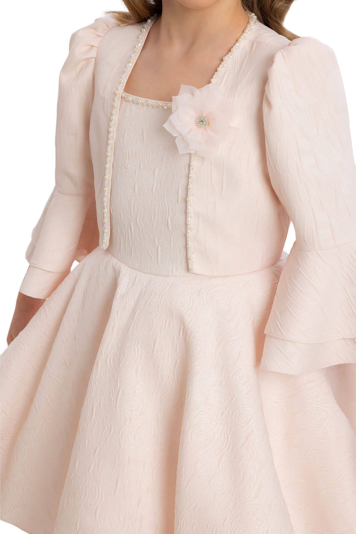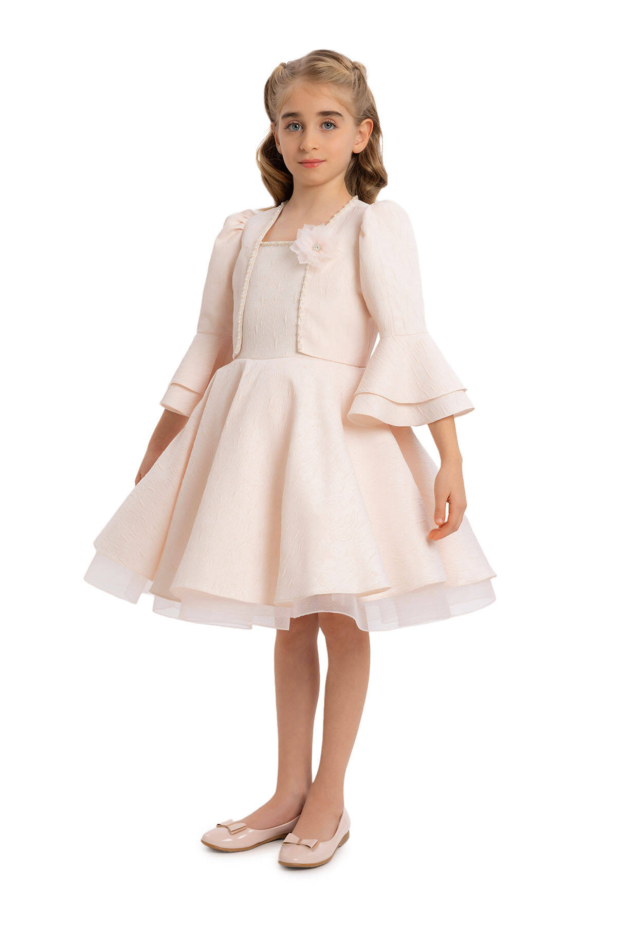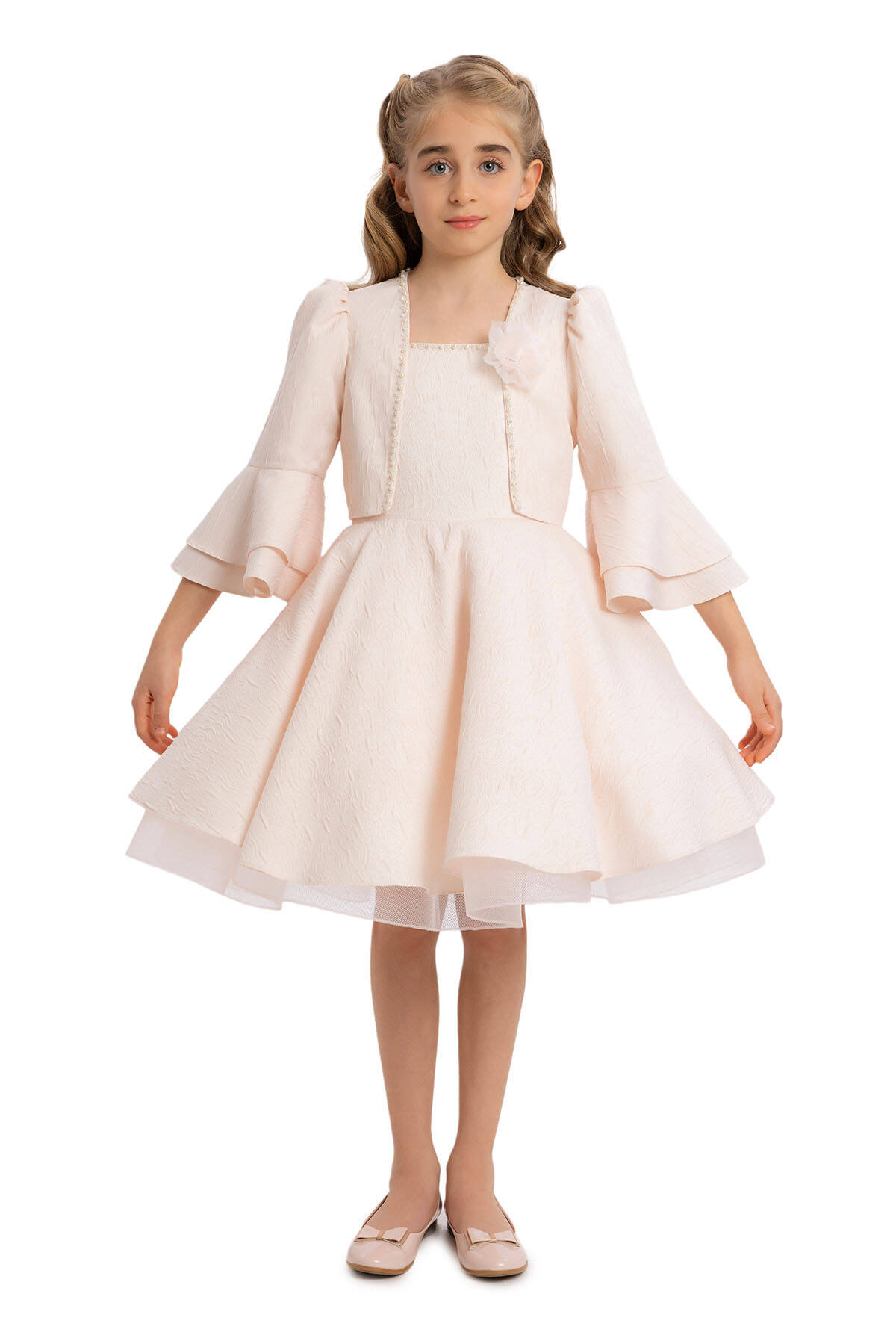 Designed with patterned jacquard fabric, this bolero offers an original style with bead detailing and flower accessories on the chest. With ruched and capped sleeves, this bolero gains a lively look with double-layered ruffle details at the sleeve ends. Standing out with its elegant details, the bolero adds sophistication to any outfit.This dress set, featuring patterned jacquard fabric with shoulder straps, stands out with bead detailing on the dress collar, making the set unique. Enriched with ruffle details on the skirts and tulle gren accessories on the lower hems, the dress has an original style. The dress is comfortable and healthy with its 100% cotton lining. A dazzling choice for every child's special occasions, this set can be comfortably chosen. Offering wholesale opportunities worldwide, we bring quality and elegance everywhere. Pamina's collection provides grace and style to every girl of all ages.