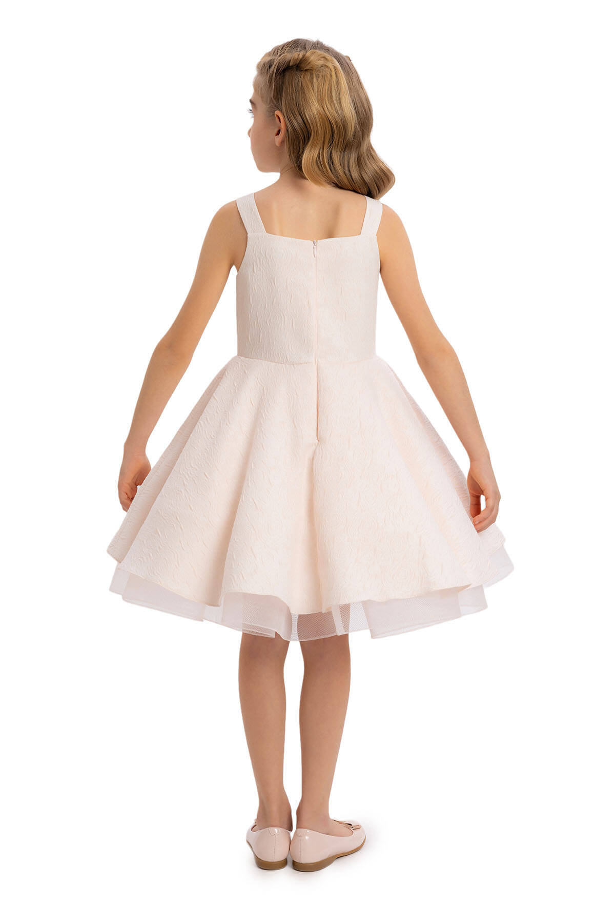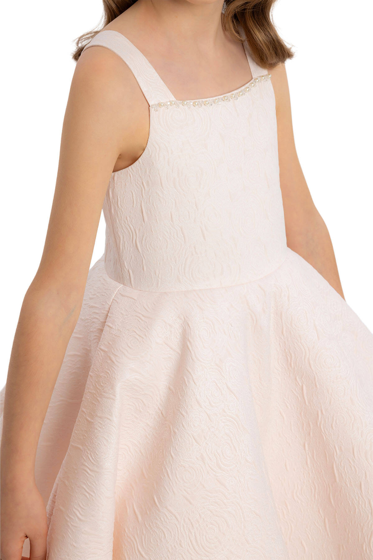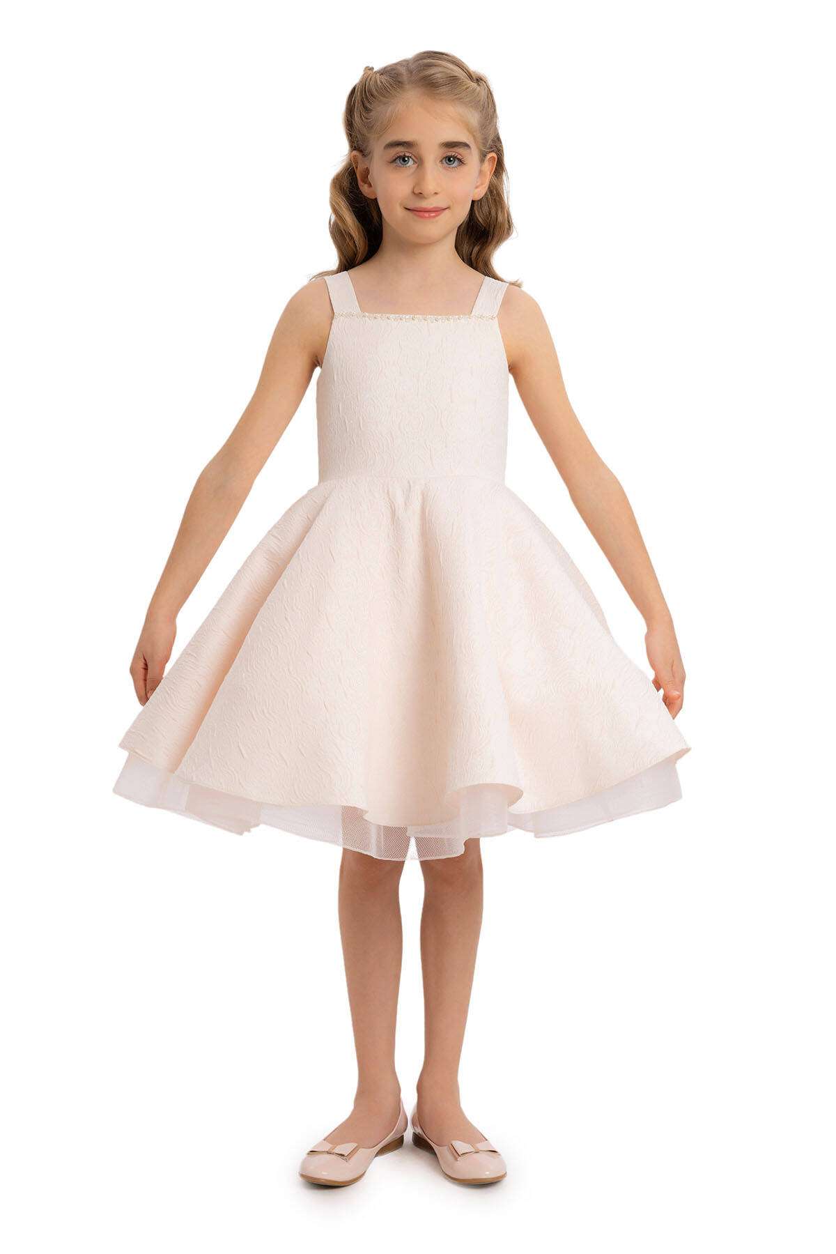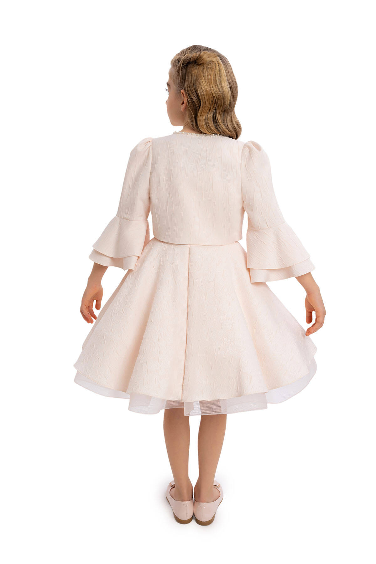 Designed with patterned jacquard fabric, this bolero offers an original style with bead detailing and flower accessories on the chest. With ruched and capped sleeves, this bolero gains a lively look with double-layered ruffle details at the sleeve ends. Standing out with its elegant details, the bolero adds sophistication to any outfit.This dress set, featuring patterned jacquard fabric with shoulder straps, stands out with bead detailing on the dress collar, making the set unique. Enriched with ruffle details on the skirts and tulle gren accessories on the lower hems, the dress has an original style. The dress is comfortable and healthy with its 100% cotton lining. A dazzling choice for every child's special occasions, this set can be comfortably chosen. Offering wholesale opportunities worldwide, we bring quality and elegance everywhere. Pamina's collection provides grace and style to every girl of all ages.