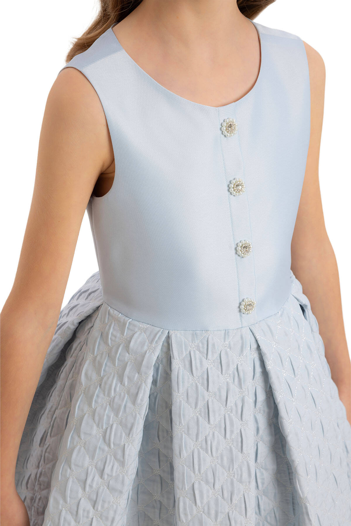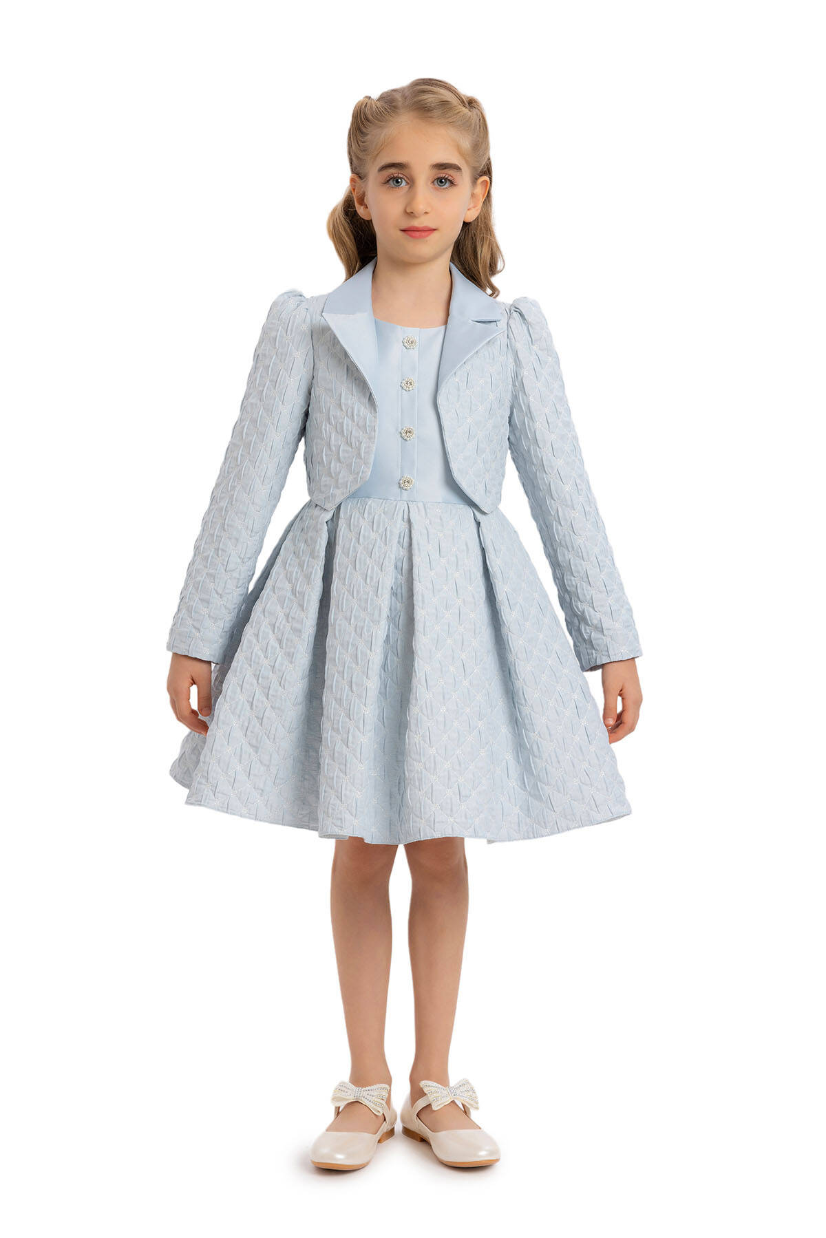 Minik papatyalı kapitone jakar kumaştan tasarlanan kız çocuk ceketinin yakası düz kumaşla hoş bir geçişe sahiptir. Kol tepelerindeki büzgüler uzun kollu cekete dikkat çekici bir hava katıyor. Takımın elbise robası düz saten kumaşla tasarlanmıştır. Ön robasındaki düğme işlemeleriyle elbise sade bir ışıltıya sahip oluyor. Kolsuz kesim elbisenin pilikaşeli etekleri, minik papatyalı kapitone jakar kumaşı sayesinde ceketiyle harika bir uyum içinde. Elbise % 100 pamuk astarıyla rahat ve sağlıklı. Doğum günü elbisesi, parti elbisesi ya da özel gün elbisesi olarak kullanılabilecek şık bir seçim. Pamina, dünya genelindeki perakendecilere ve işletmelere yüksek kaliteli ve şık kız çocuk elbiseleri sunuyor. Geniş koleksiyonumuz, özenle seçilmiş el işlemeleri ve aksesuarlarla her yaşa hitap ediyor. Toptan satışta sunduğumuz imkanlarla, Pamina'nın özgün tarzını dünya genelindeki müşterilere ulaştırıyoruz.