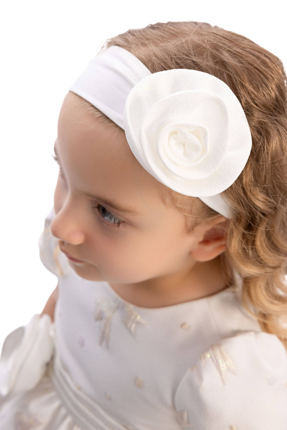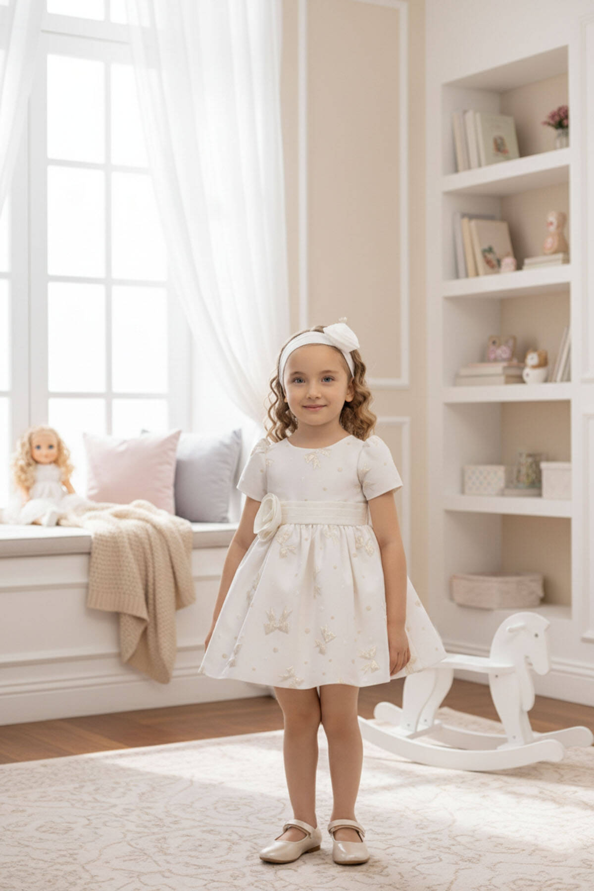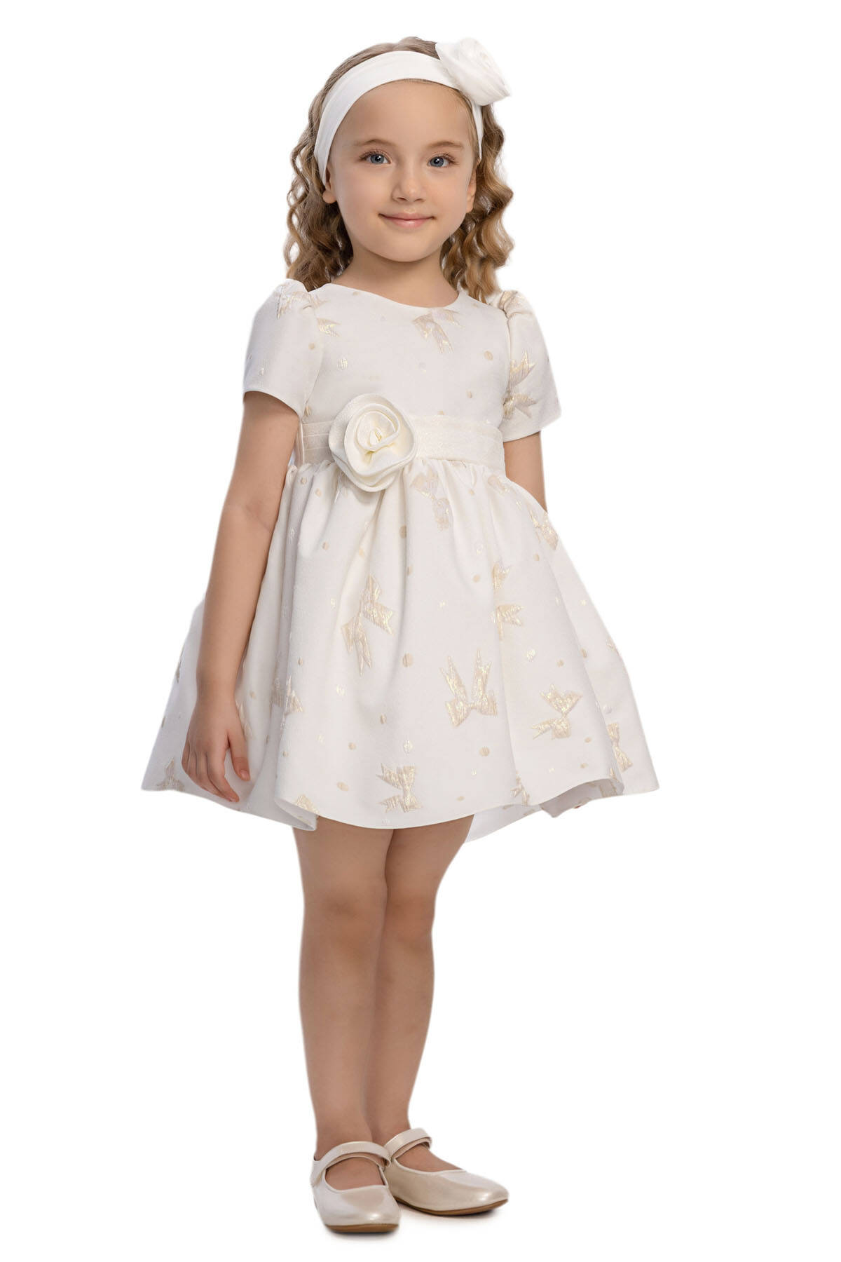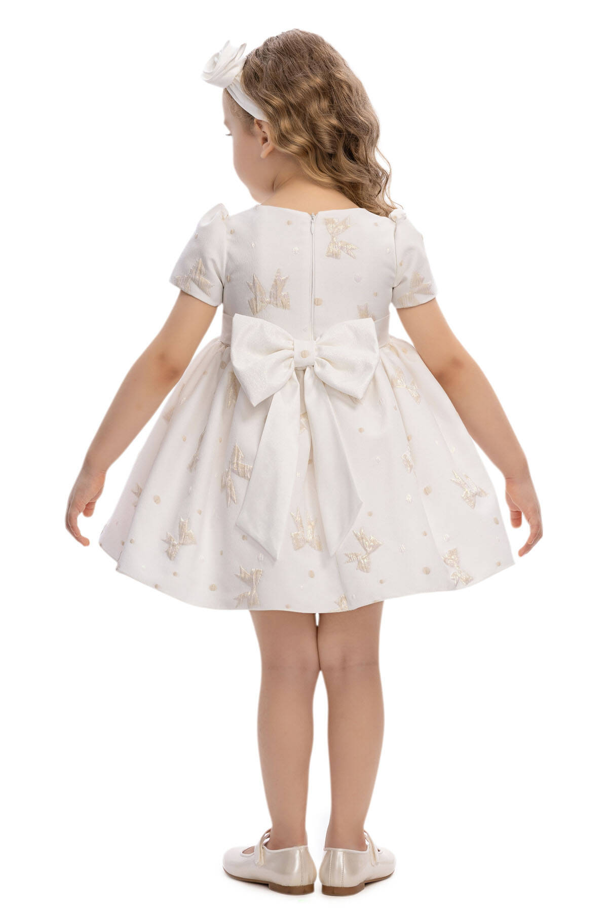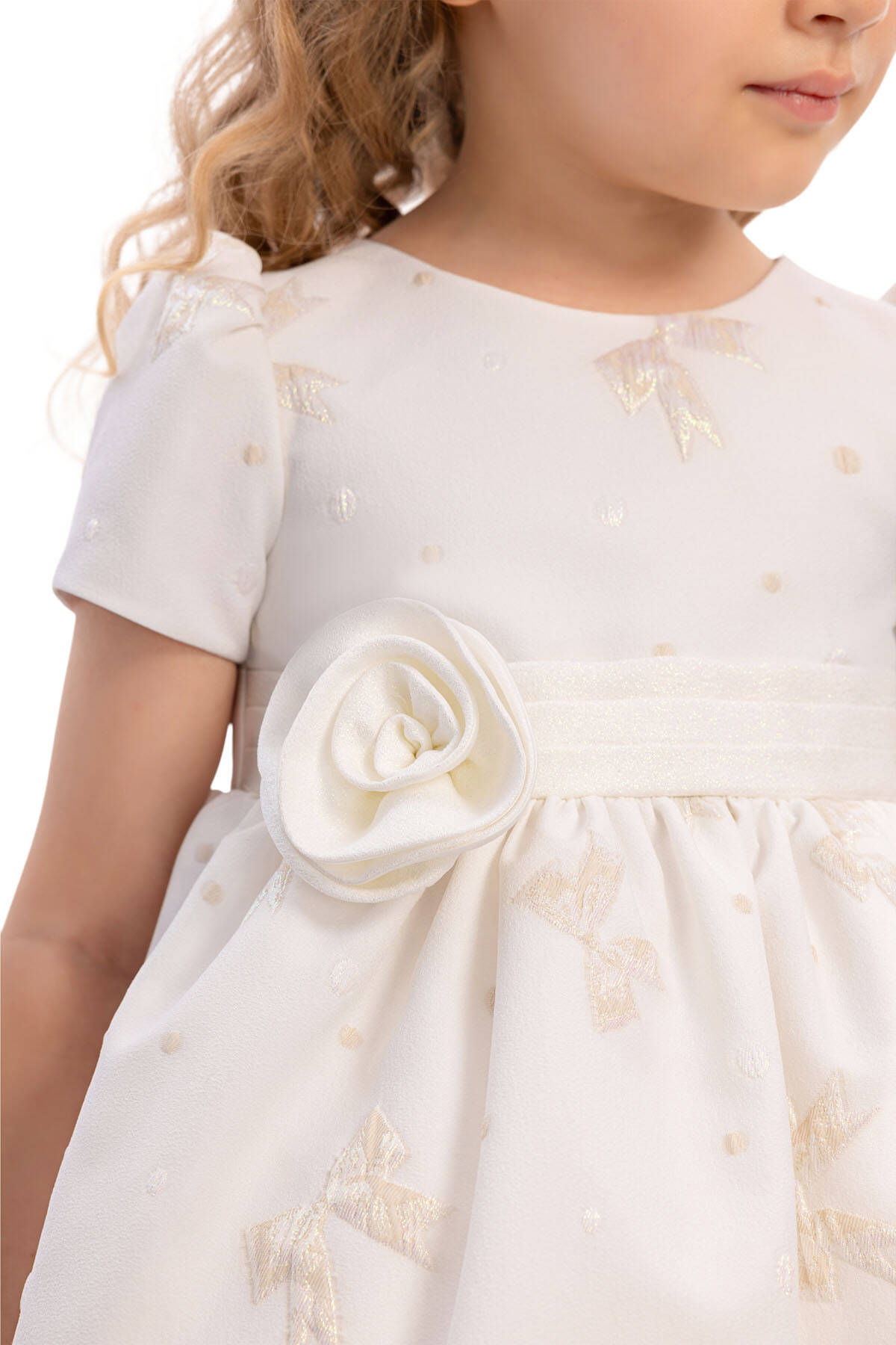 This sweet and elegant baby dress is designed for memorable occasions. The jacquard fabric is adorned with shimmering bow motifs and subtle polka dots, adding a playful yet refined texture. A wide waistband with a fabric flower appliqué highlights the waistline, while the back is finished with an oversized bow for extra charm.Short puff sleeves and a flared skirt create a timeless silhouette, while the matching headband with a coordinating flower detail completes the look. Perfect for birthdays, family gatherings, or special celebrations, this dress ensures your little one looks both stylish and comfortable.
