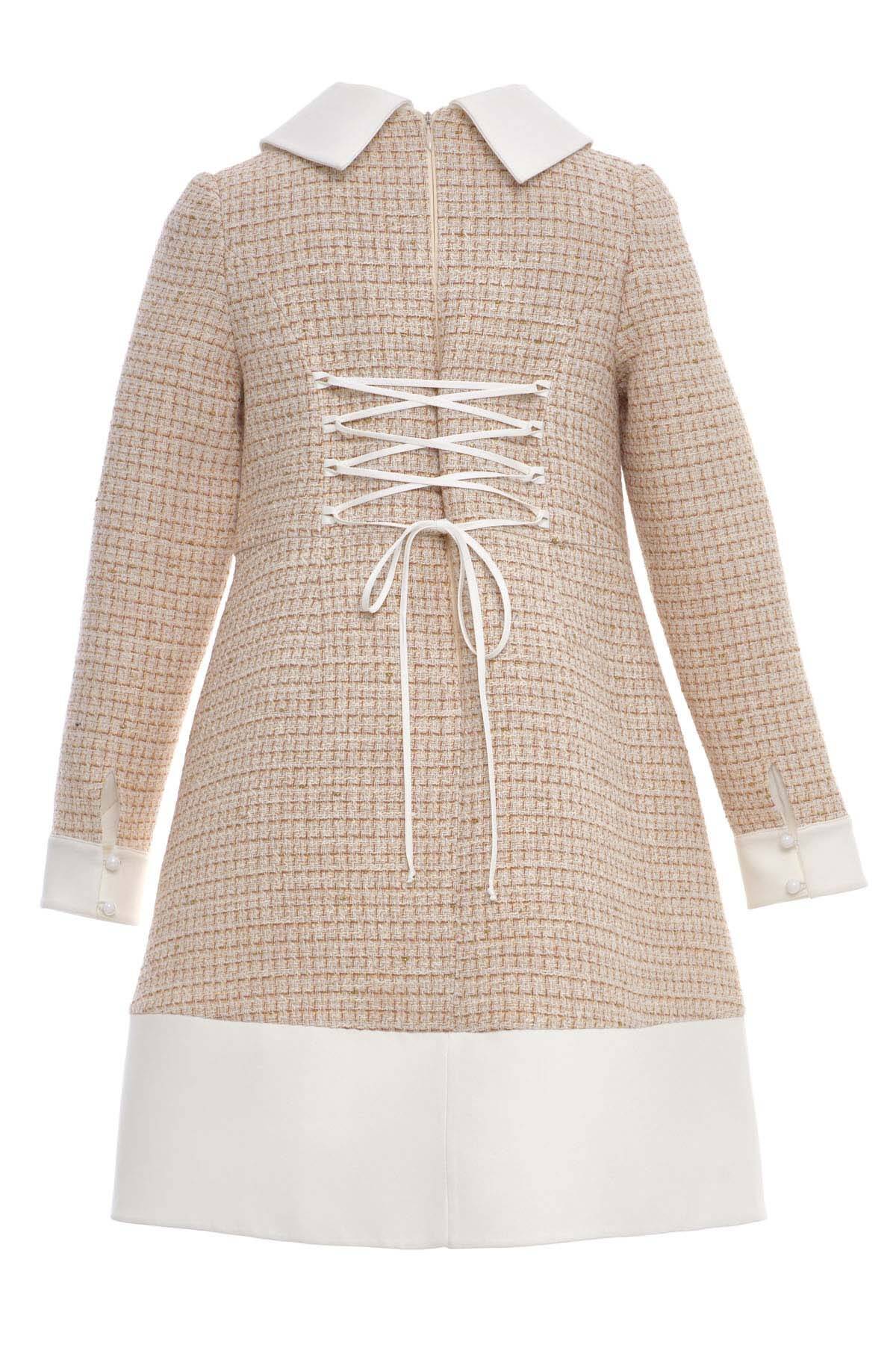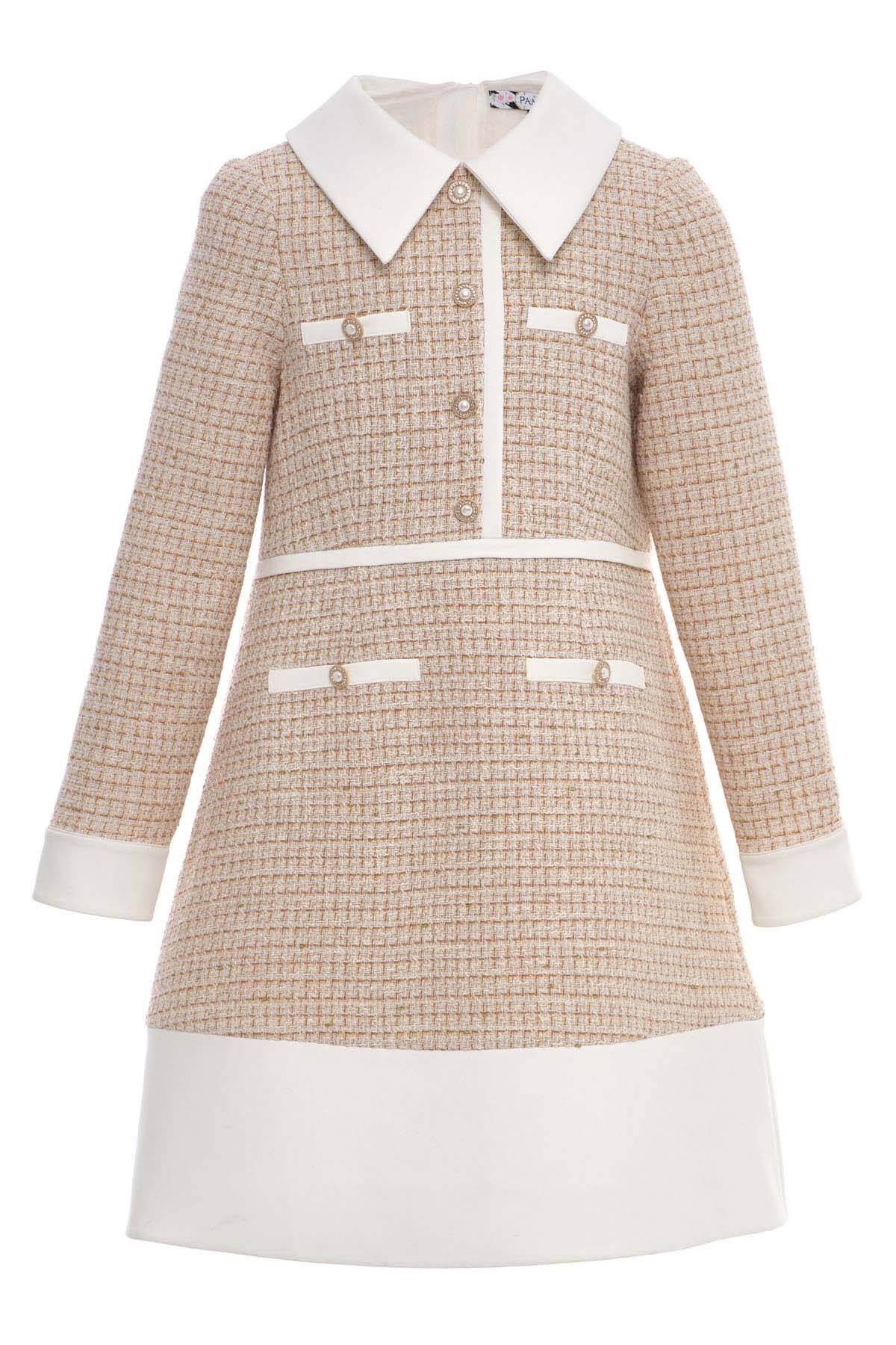 Beige Girls Classic Tweed Dress with Decorative Buttons and Satin Collar 8-15 AGE 36393PR