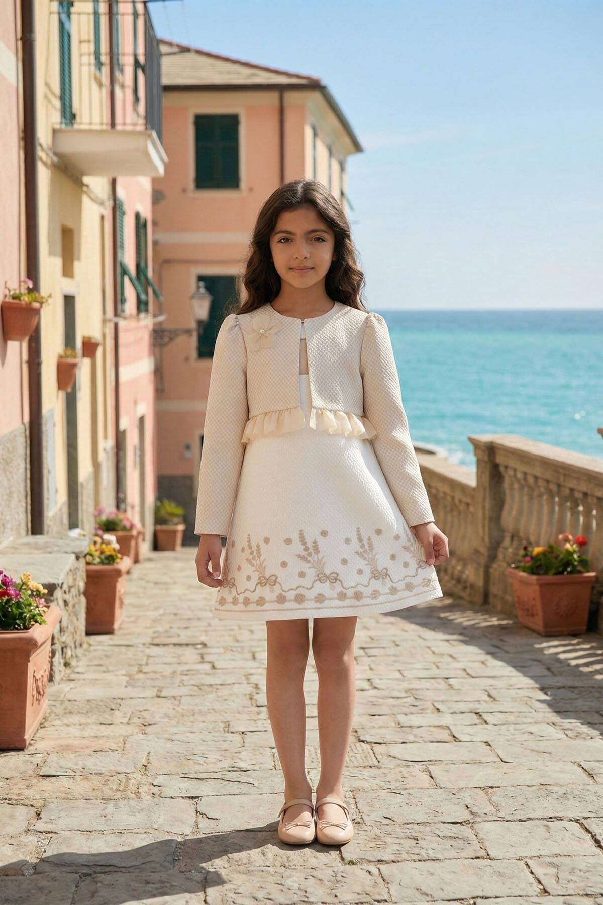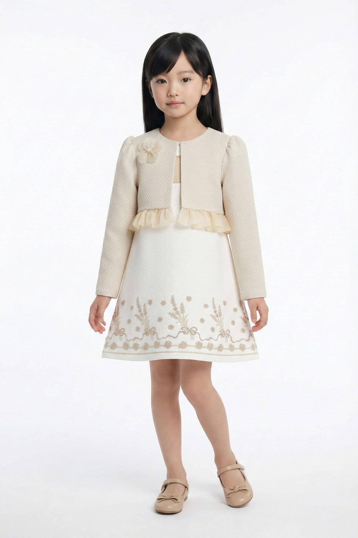 A fairy-tale ensemble for your little one’s most special moments ✨ This two-piece set features a textured A-line dress with a beautifully embroidered hemline of florals and bows, paired with a cropped long-sleeve jacket. The soft organza ruffle trim and delicate 3D flower on the jacket complete the look with grace and charm. Whether it's a spring party or a family celebration, this set delivers elegance, comfort, and timeless style.