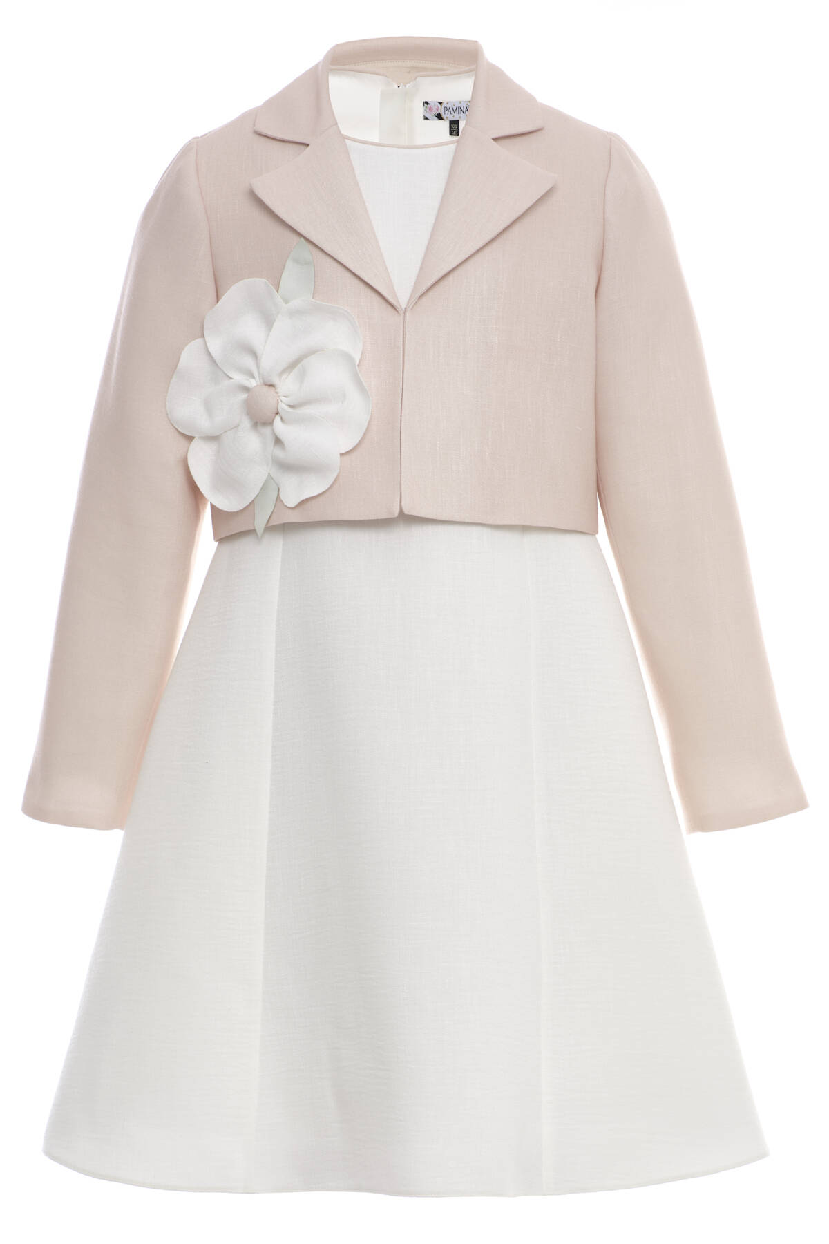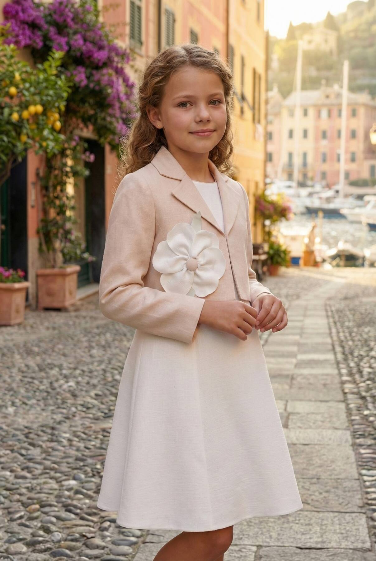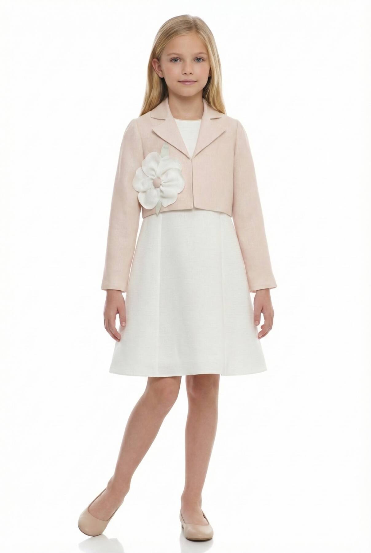 Refined, fresh, and full of charm—this two-piece set is designed for girls who love timeless style with a modern twist. The white A-line dress features clean lines and a flattering silhouette, while the cropped jacket adds sophistication with its structured cut and oversized 3D flower detail.A lace-up back adds a delicate finishing touch to the dress, making it perfect for both elegance and comfort. Whether for spring events, family celebrations, or special days out, this look stands out with effortless grace.