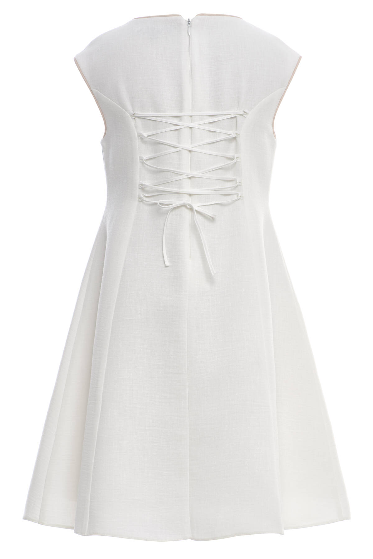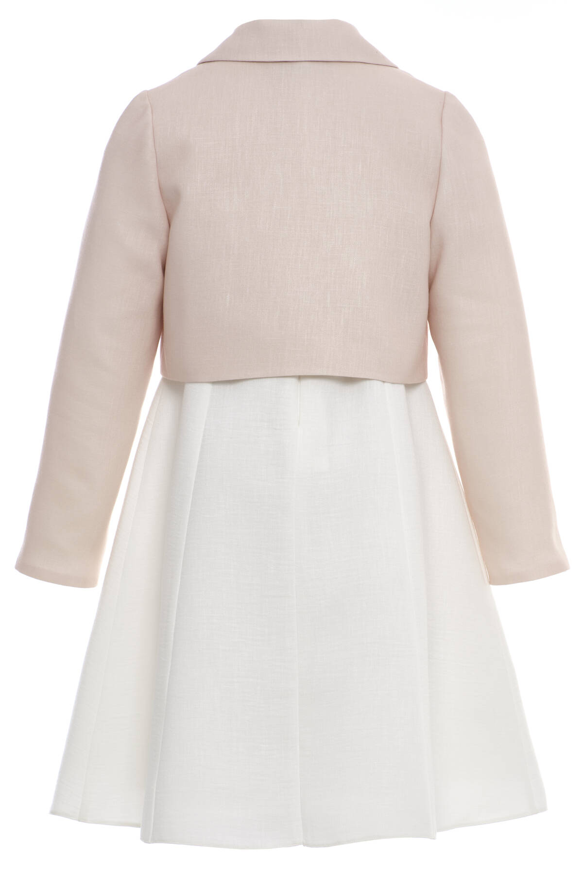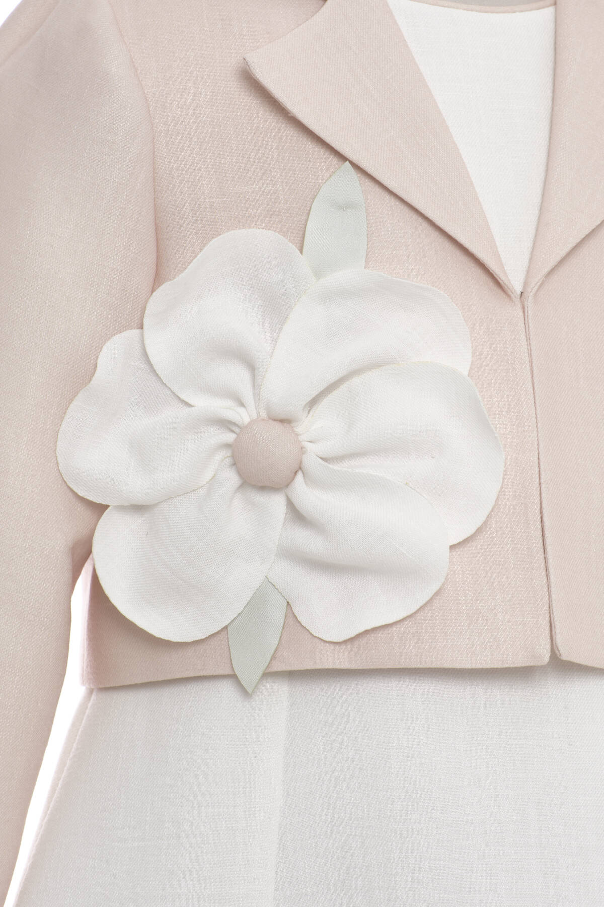 Refined, fresh, and full of charm—this two-piece set is designed for girls who love timeless style with a modern twist. The white A-line dress features clean lines and a flattering silhouette, while the cropped jacket adds sophistication with its structured cut and oversized 3D flower detail.A lace-up back adds a delicate finishing touch to the dress, making it perfect for both elegance and comfort. Whether for spring events, family celebrations, or special days out, this look stands out with effortless grace.