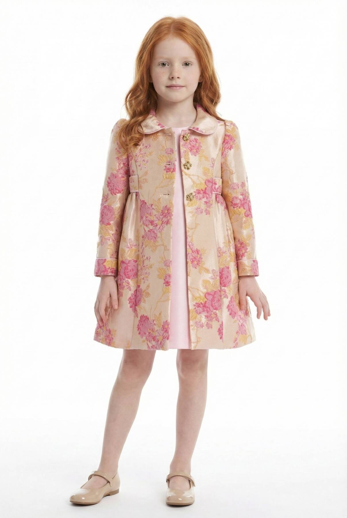 An exquisite choice for little girls who love to dress up with elegance! This sophisticated two-piece set features a soft satin A-line dress paired with a luxurious jacquard coat, detailed with blooming floral patterns in shimmering tones. The coat is fully lined and designed with a classic Peter Pan collar, structured pleats, and sparkling floral buttons for a timeless finish.Worn together, it's the perfect look for weddings, special events, or picture-perfect moments. Worn separately, both pieces add versatility to your little one’s wardrobe. Beauty, comfort, and charm—all in one set.
