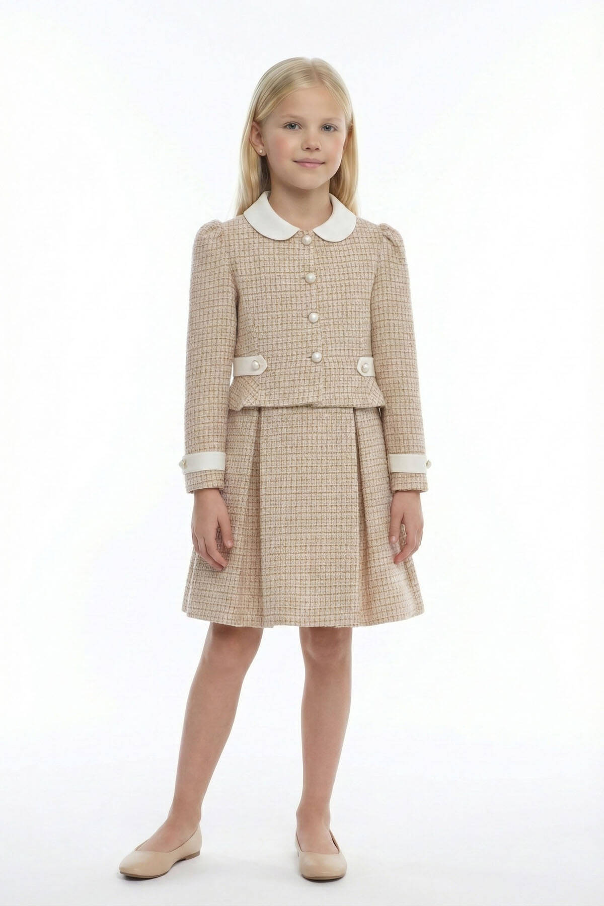 Chic, polished, and perfect for any special occasion—this elegant two-piece set brings timeless sophistication to girls' fashion. The sleeveless dress features a structured ivory bodice and a pleated tweed skirt for graceful movement and comfort. It’s paired with a coordinating tweed jacket detailed with a rounded ivory collar, pearl-accented buttons, and decorative pocket flaps.The textured fabric and thoughtful tailoring give a modern twist to a classic silhouette, making this ensemble ideal for celebrations, family gatherings, or elegant outings. A refined look that balances tradition and youthful charm.