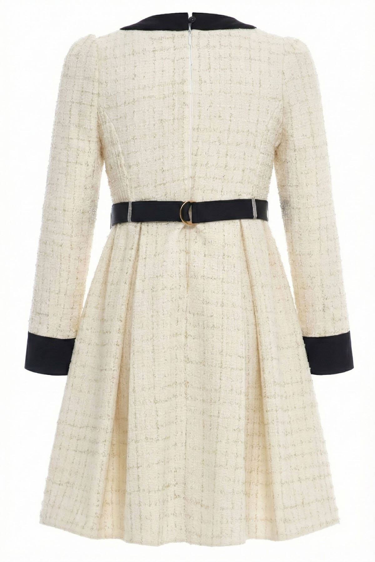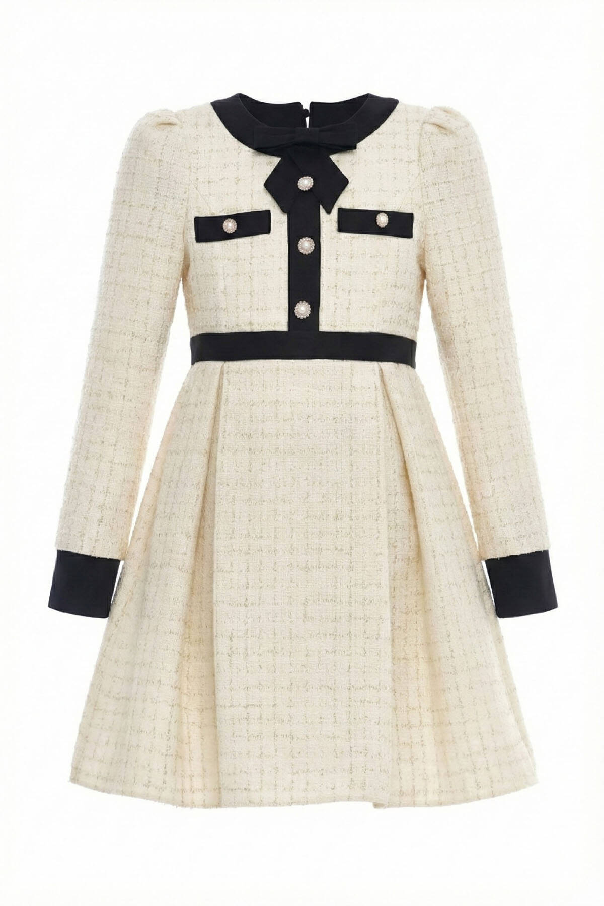 Classic Parisian charm meets modern elegance in this timeless tweed dress. Designed with a structured A-line silhouette, the dress features a soft woven texture, decorative front pockets, and shiny pearl-effect buttons. The contrast collar, cuffs, and waistband add a refined, tailored look, perfect for special occasions or stylish everyday wear.