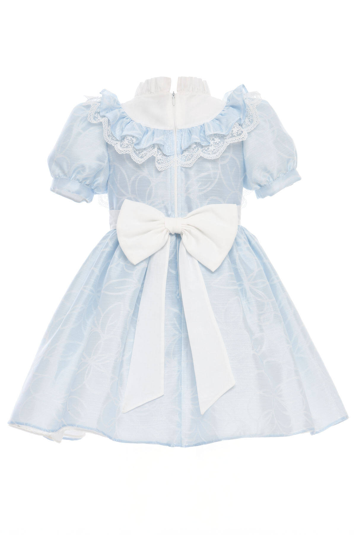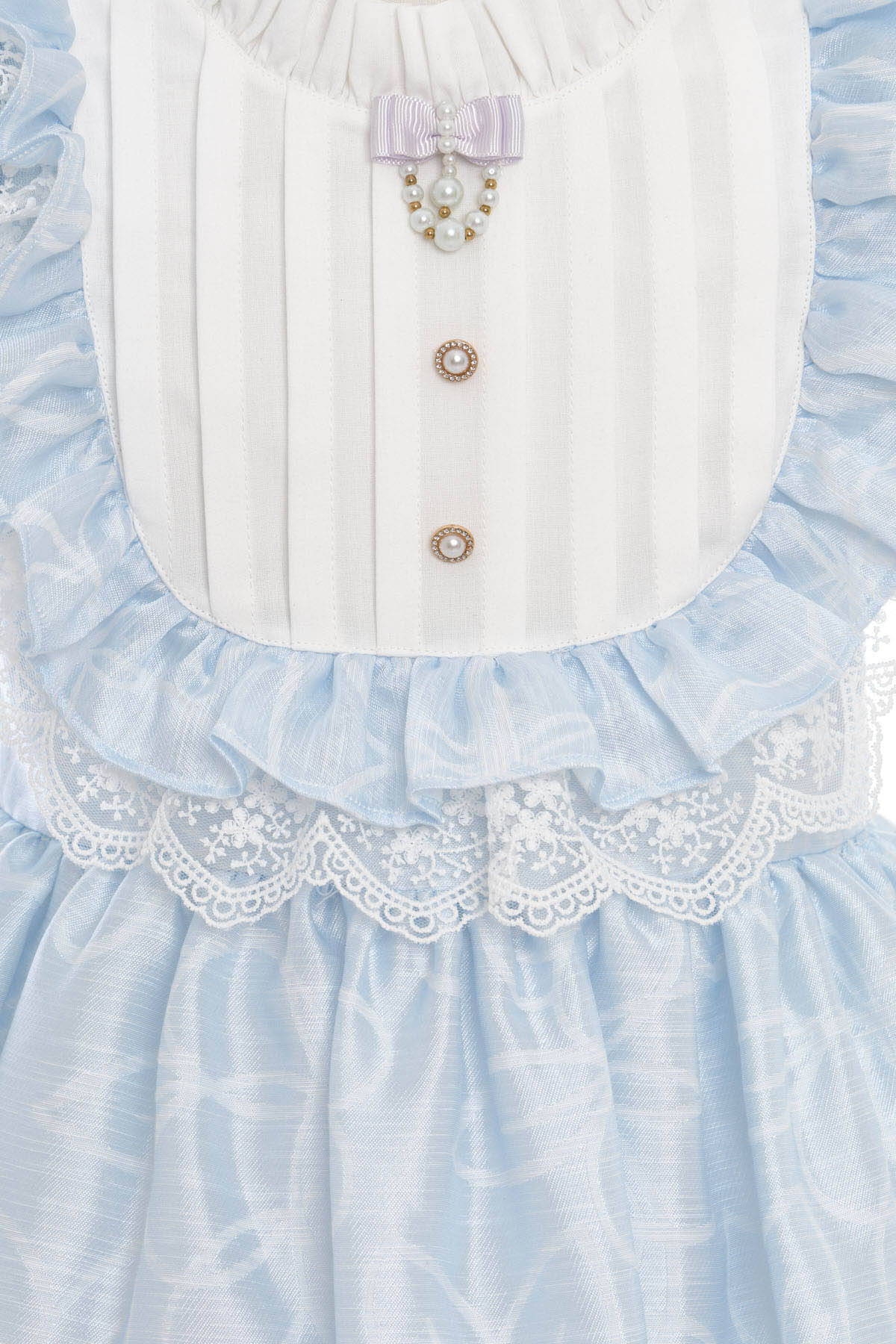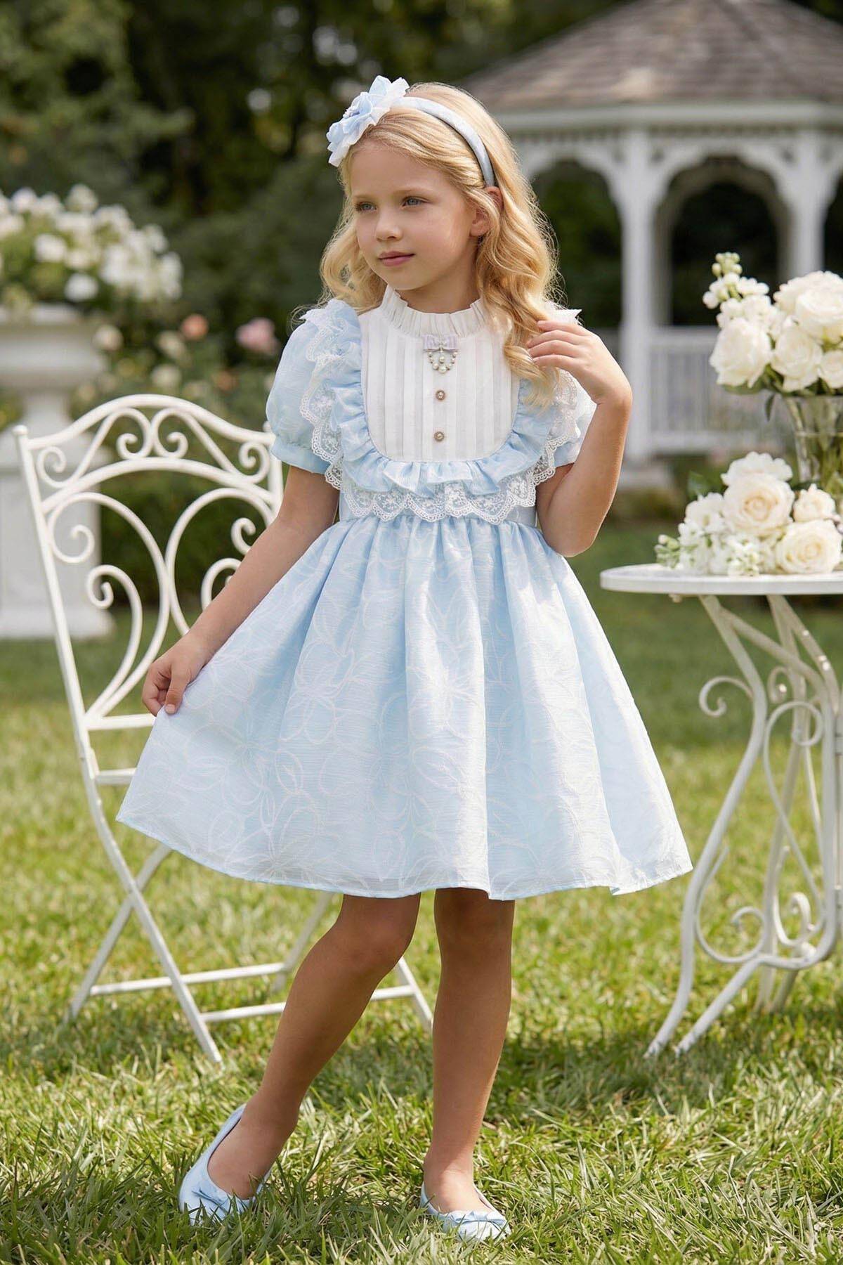 A delightful dress with storybook sweetness and elegant detailing. Crafted from soft floral-patterned organza, this design features a structured white bib with pleated stripes and pearl button accents. The ruffled bodice is framed with embroidered lace trim and puff sleeves, creating a classic silhouette full of vintage charm. A layered satin bow at the back and a matching embellished headband complete the look—perfect for birthdays, weddings, and magical celebrations.