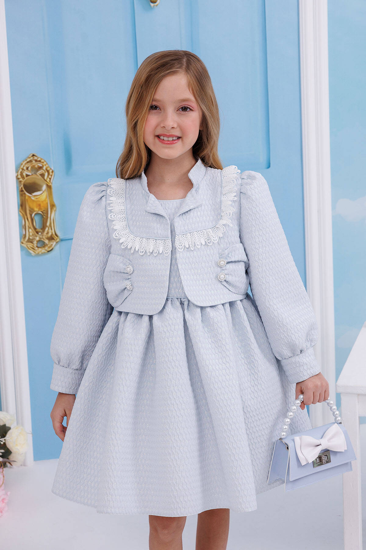 This sophisticated 3-piece set is designed for stylish little ones, featuring a charming dress, a coordinating jacket, and an adorable handbag. Crafted from high-quality textured jacquard fabric, the dress offers a subtle shimmer and luxurious feel. The matching jacket is adorned with delicate fringe details, pearl buttons, and a tailored fit, providing both elegance and warmth. The set is completed with a chic handbag featuring a bow embellishment and pearl handle, adding a playful yet polished touch.