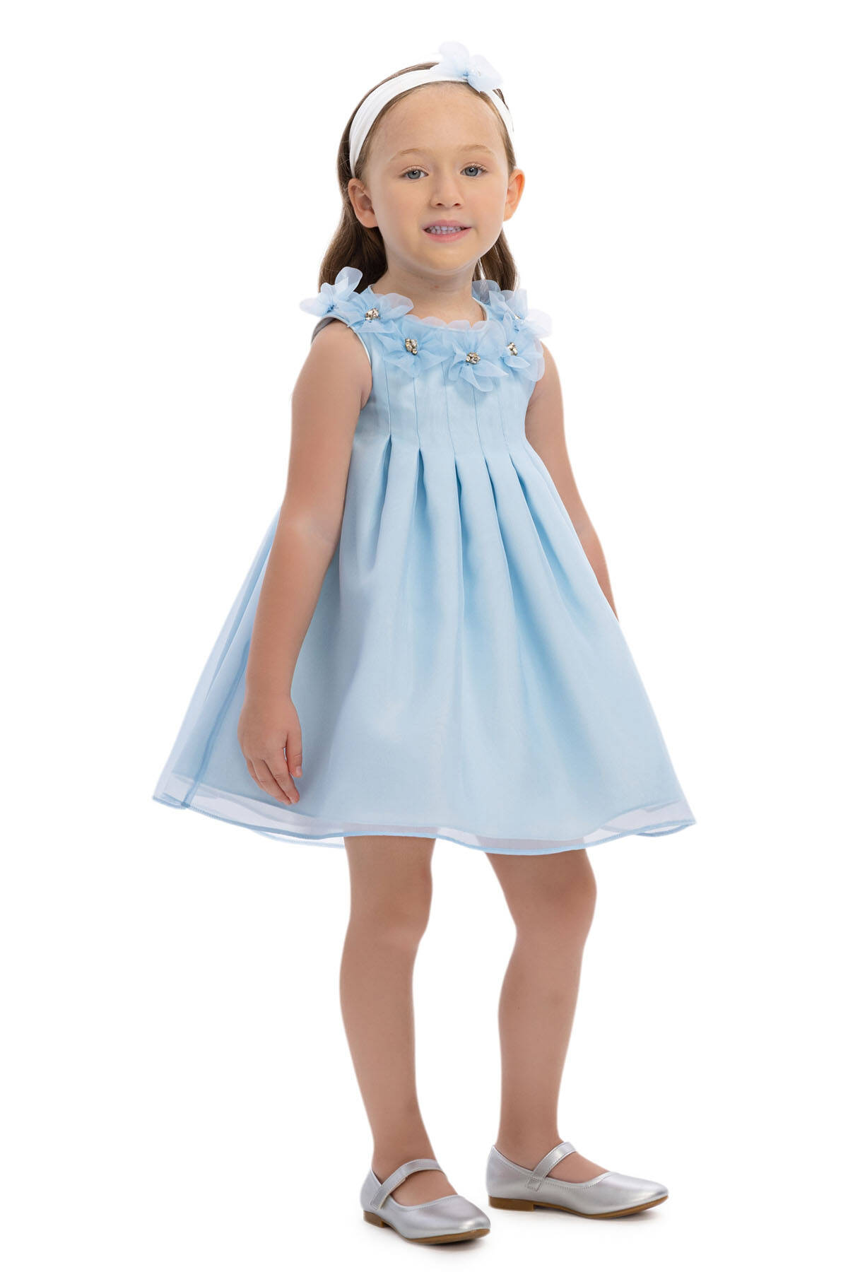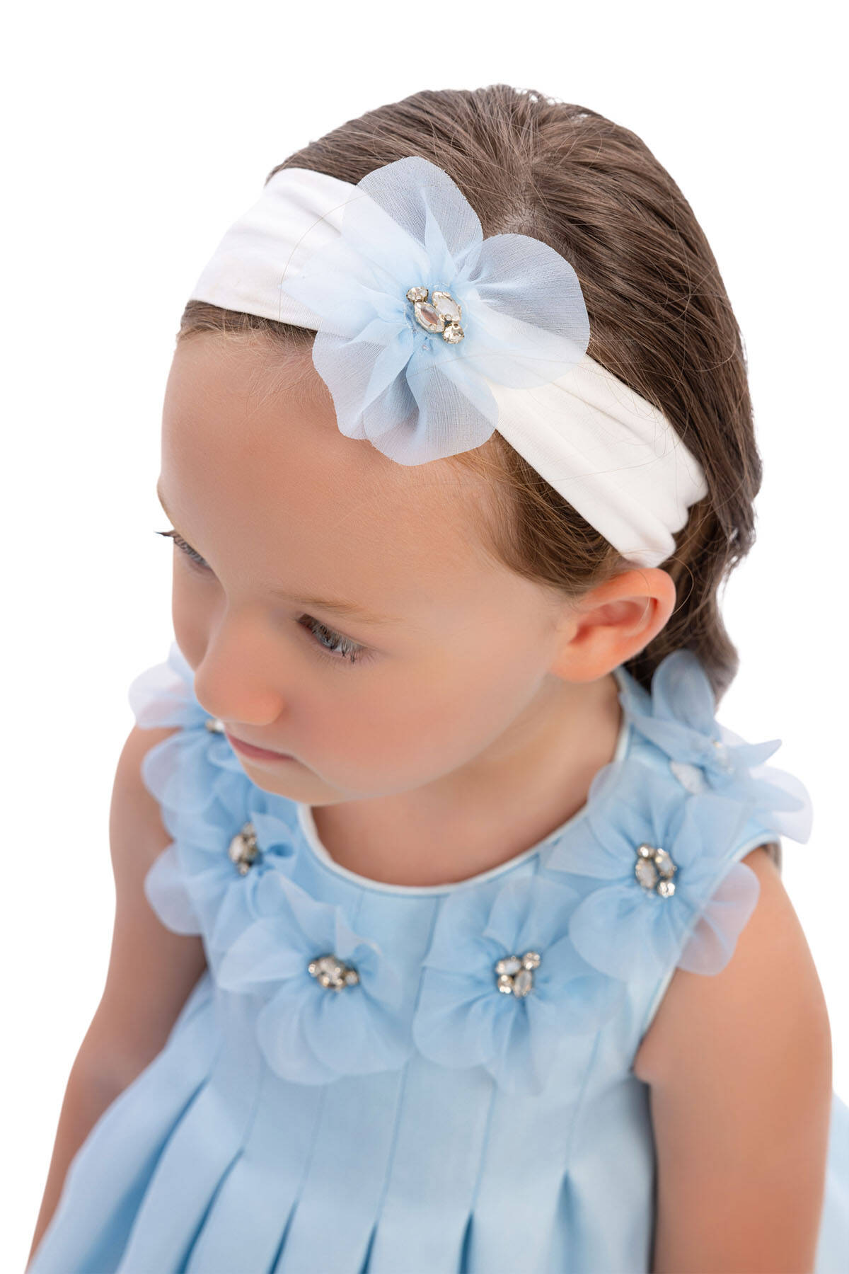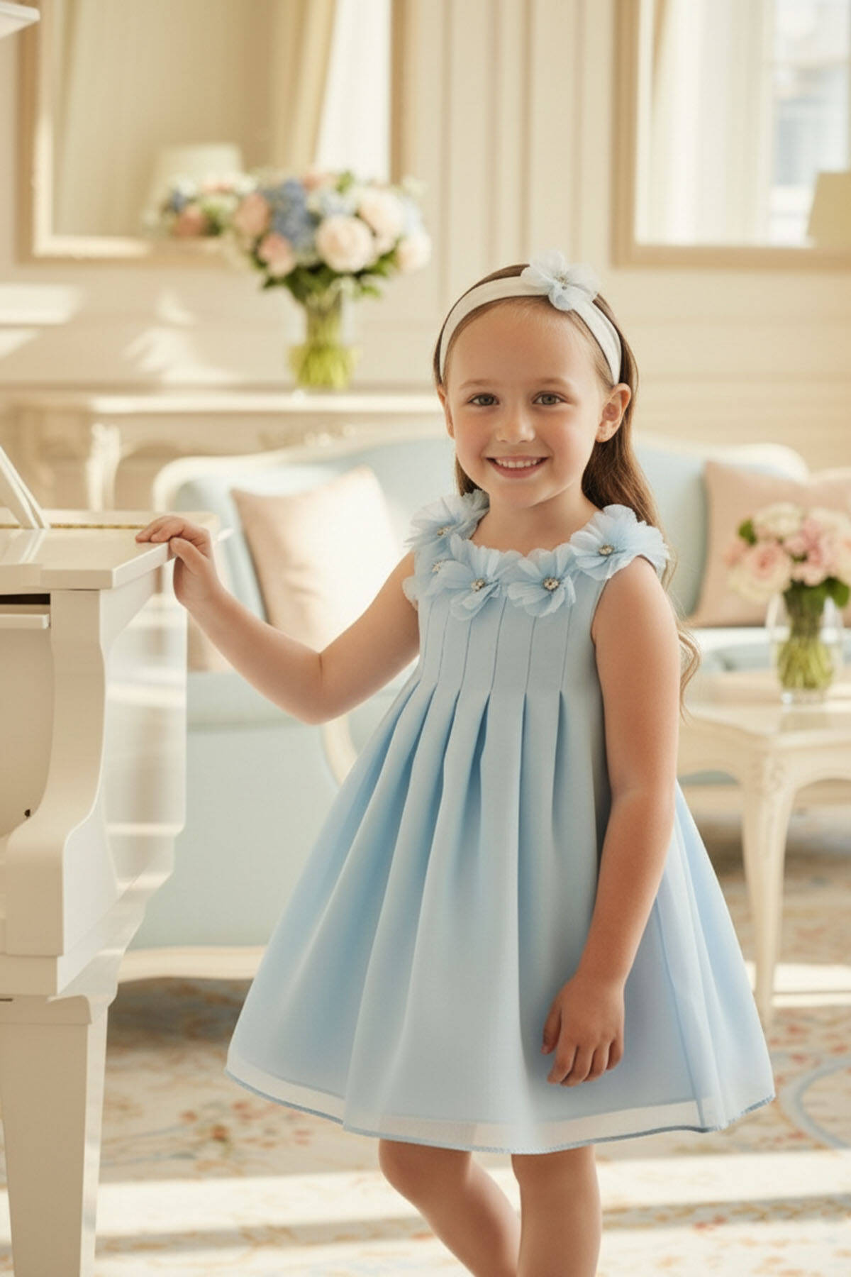 Delicate, dreamy, and designed for special little moments — this baby dress set is pure elegance. The sleeveless A-line silhouette is adorned with soft pleats, creating a graceful flow that allows both style and comfort.The neckline is beautifully decorated with 3D chiffon flowers, each embellished with sparkling crystal stones at the center, adding a touch of sophistication to the playful design. A matching floral headband completes the look, making it perfectly coordinated for photographs and celebrations.Lightweight and lined for comfort, this dress is ideal for birthdays, christenings, and festive gatherings a timeless choice that blends charm and luxury.
