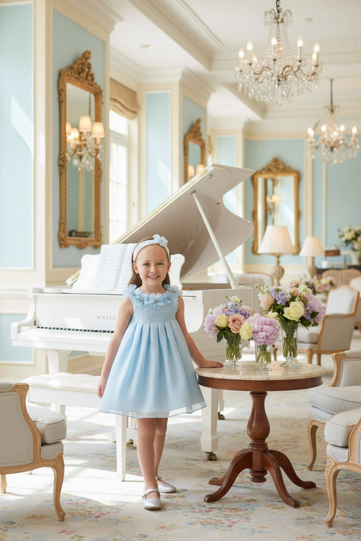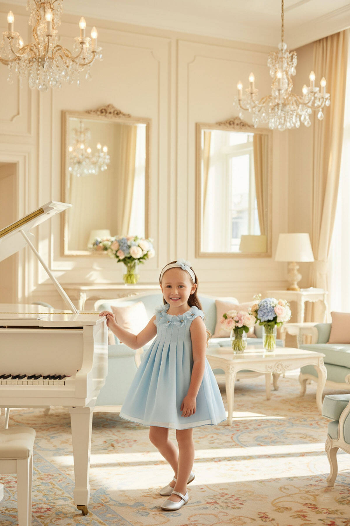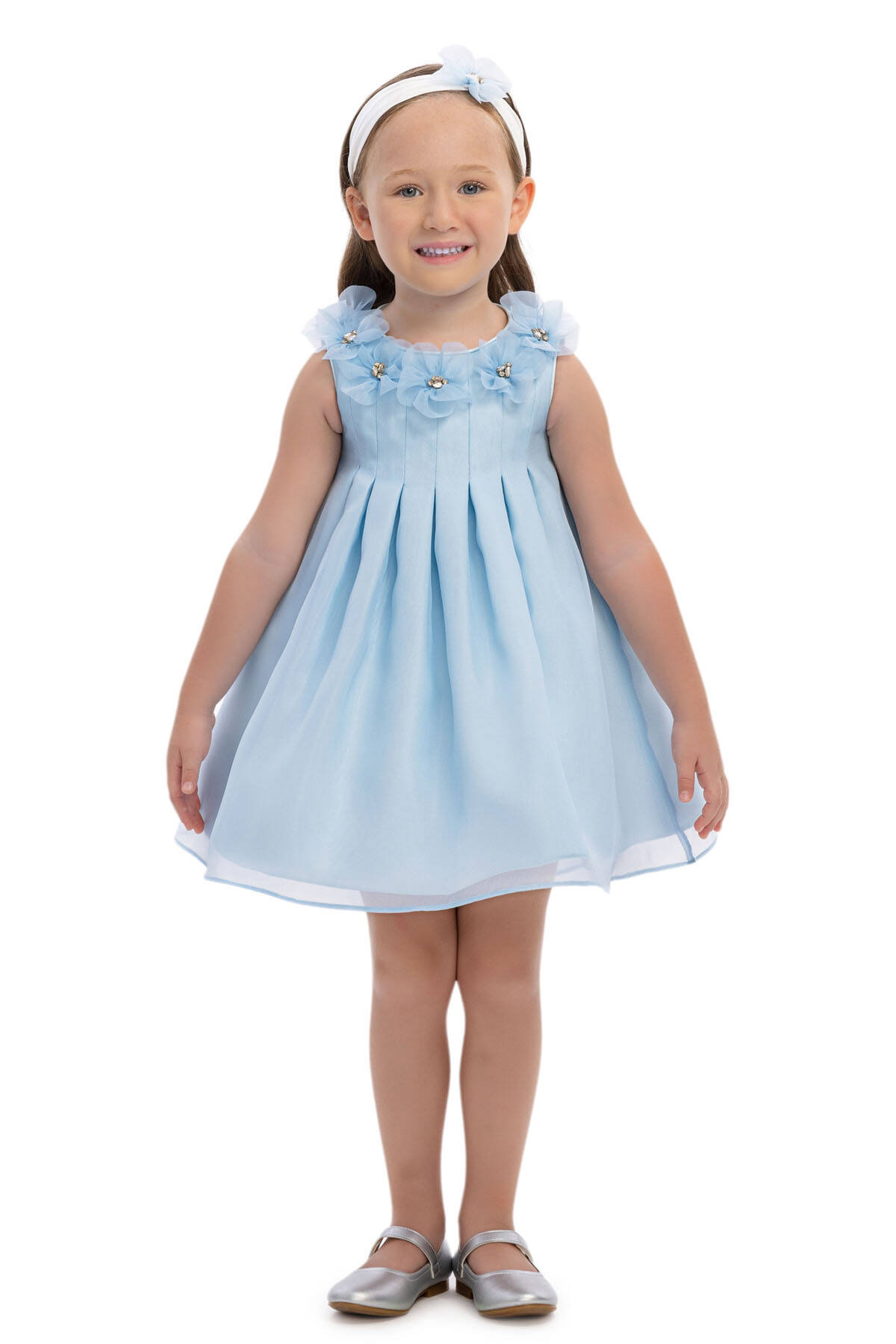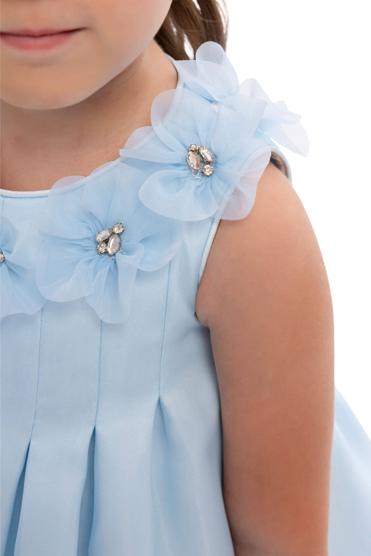 Delicate, dreamy, and designed for special little moments — this baby dress set is pure elegance. The sleeveless A-line silhouette is adorned with soft pleats, creating a graceful flow that allows both style and comfort.The neckline is beautifully decorated with 3D chiffon flowers, each embellished with sparkling crystal stones at the center, adding a touch of sophistication to the playful design. A matching floral headband completes the look, making it perfectly coordinated for photographs and celebrations.Lightweight and lined for comfort, this dress is ideal for birthdays, christenings, and festive gatherings a timeless choice that blends charm and luxury.