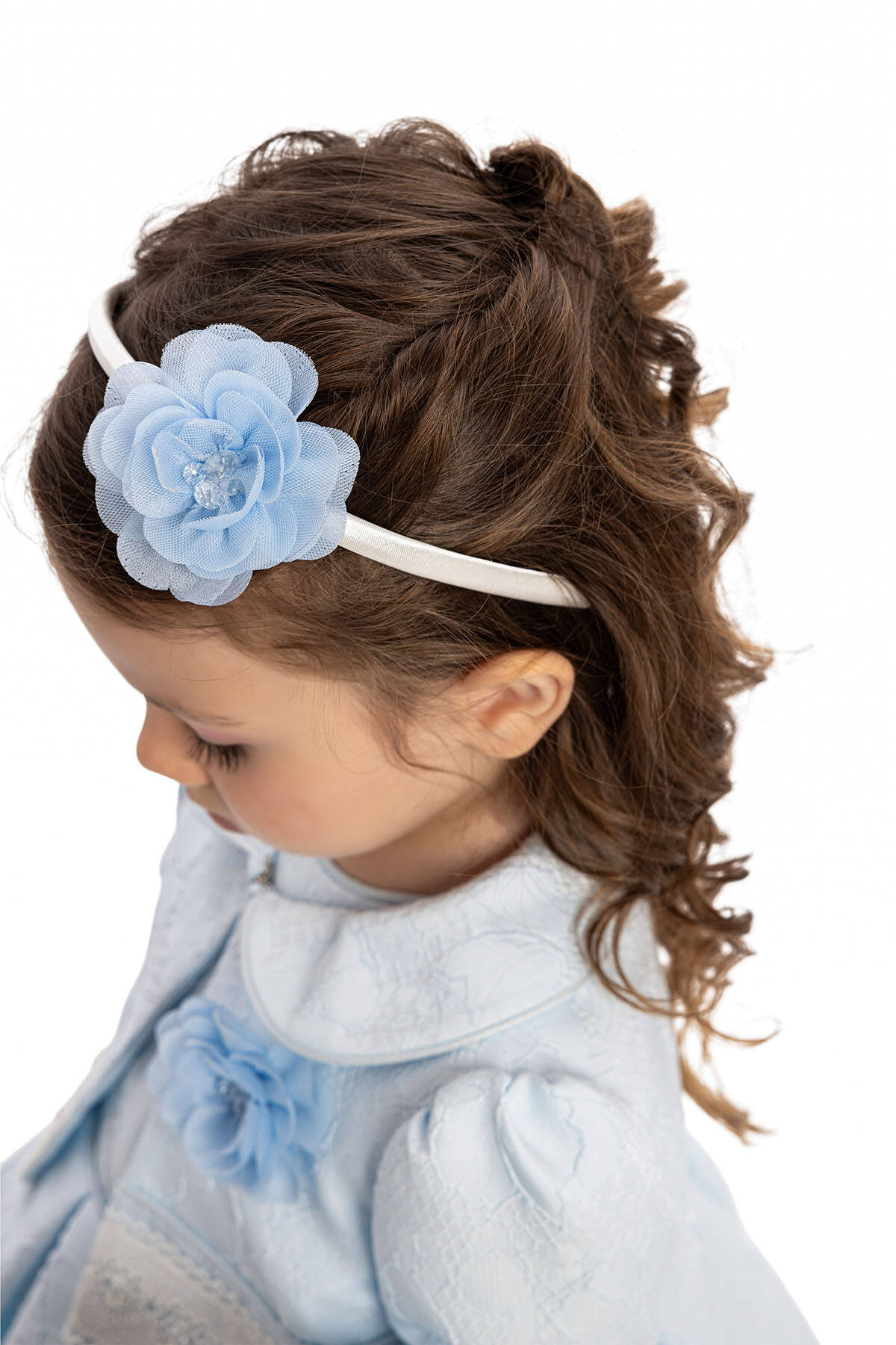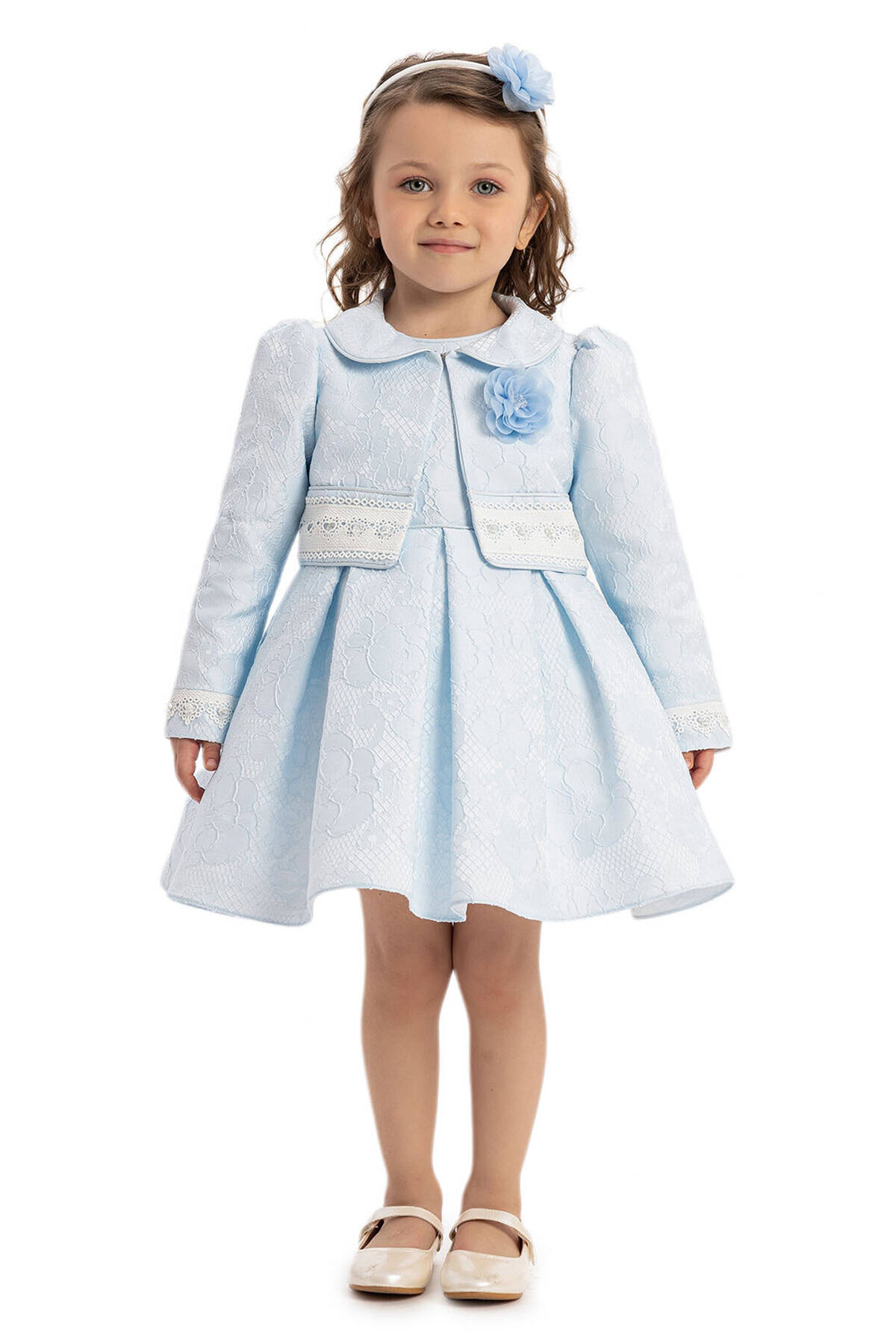 This charming three-piece set is perfect for making your little one shine at every special occasion! The dress boasts a flared skirt with an exquisite lace overlay and a subtle keyhole back closure. The elegant matching jacket adds sophistication with its pearl and lace embellishments, featuring floral-inspired details and a stylish cropped fit. Completing the set is a delicate headband adorned with a floral accessory, adding an adorable finishing touch. Crafted with soft and breathable materials, this set ensures your baby stays comfortable and stylish all day long—ideal for birthdays, weddings, or festive celebrations.