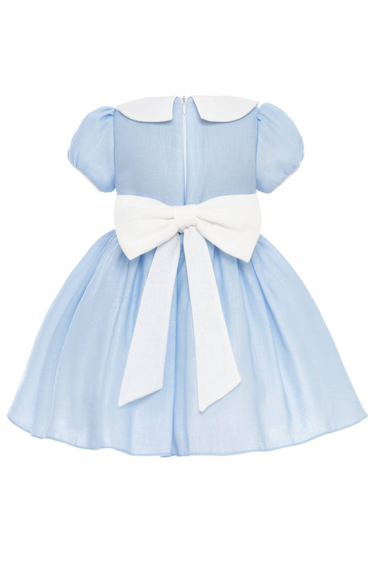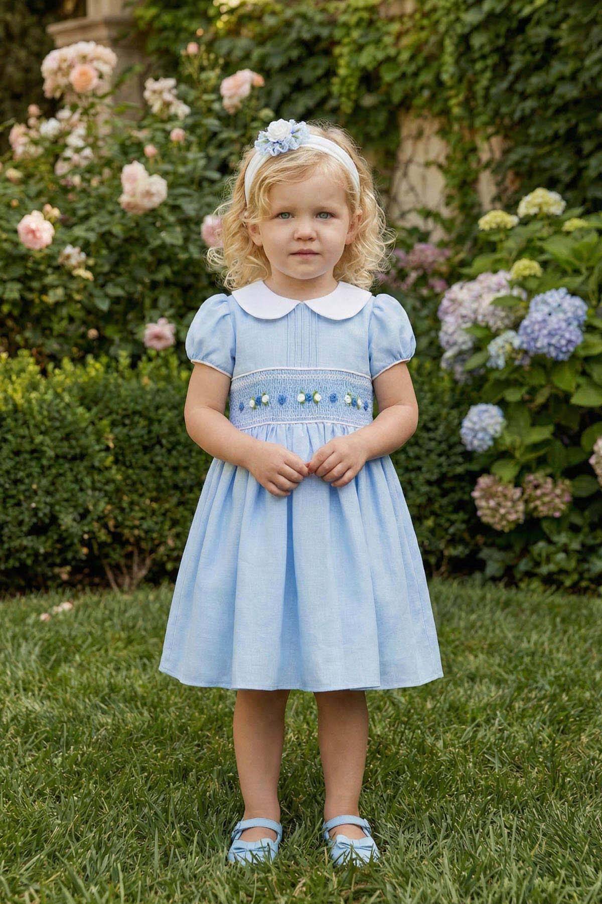 Bring charm to every occasion with this enchanting baby dress and matching headband set. Crafted in soft pastel shades, the dress features a crisp white Peter Pan collar, puffed sleeves, and hand-smocked detailing with tiny embroidered flowers for a delicate vintage touch. The oversized back bow and coordinating floral headband complete the timeless look—perfect for birthdays, tea parties, or special photoshoots.