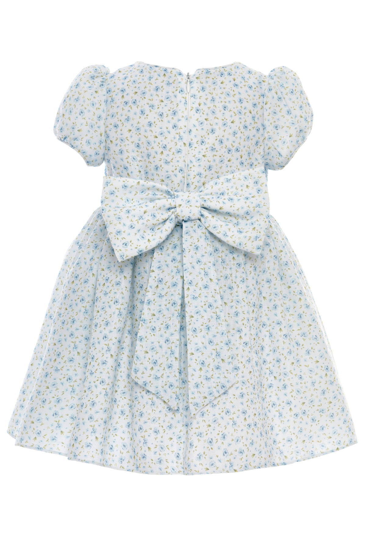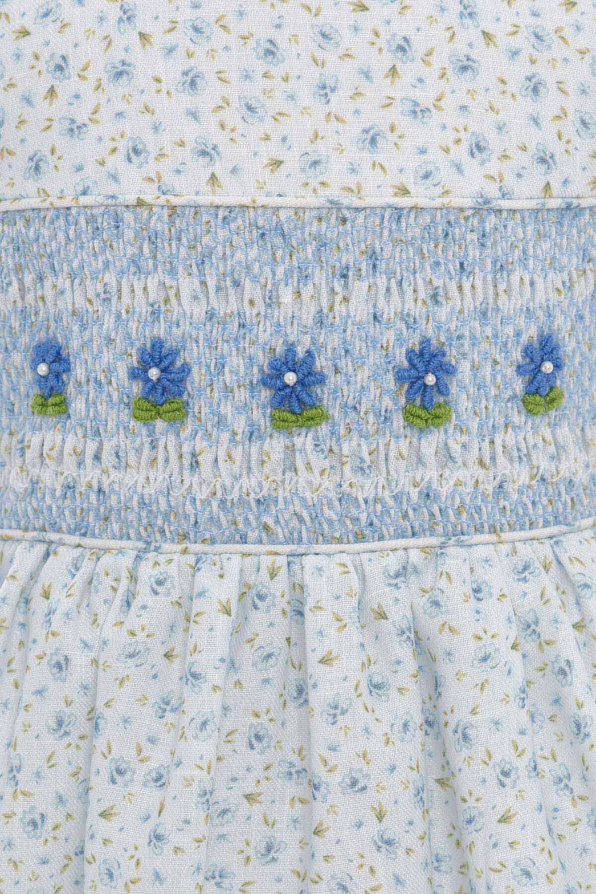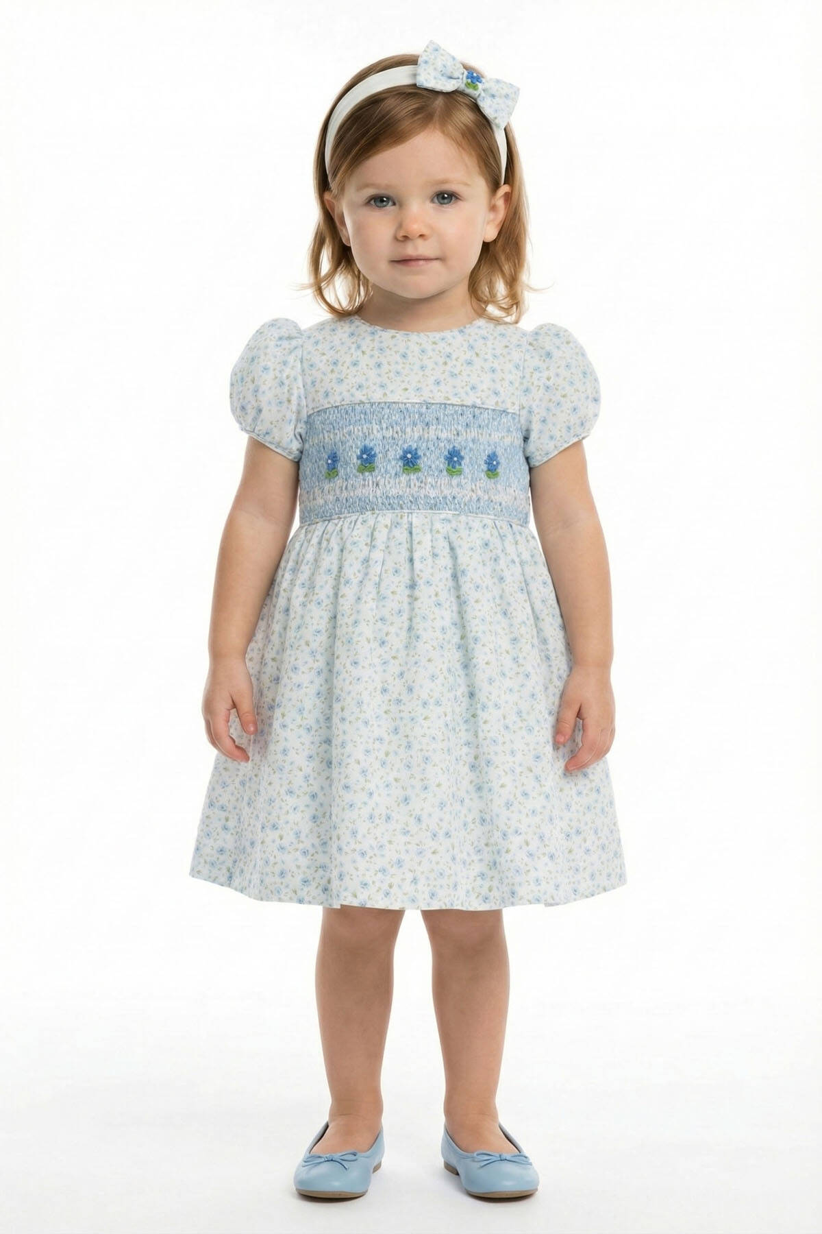 Sweetness in every stitch! This adorable baby dress features delicate allover florals with hand-smocked detailing and embroidered pink flowers across the chest. The puff sleeves and full skirt offer a charming vintage touch, while the oversized bow at the back adds a classic finish. Paired with a matching soft headband, this set is perfect for birthdays, special occasions, or simply looking darling every day.