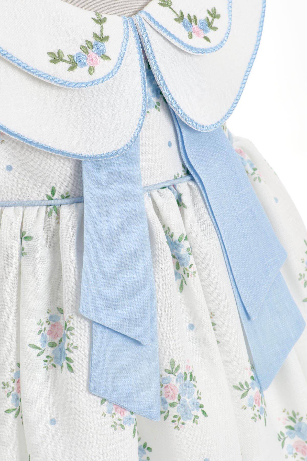 A sweet nod to timeless charm—this vintage-inspired baby dress is made for magical moments and first celebrations. Crafted from a soft floral-printed fabric, the dress features a wide double collar delicately embroidered with mini blooms and trimmed with pastel piping. The highlight is a soft cotton bow that falls gently from the neckline, adding a touch of nostalgia. A matching floral headband with a fabric rosette completes the look, creating a picture-perfect outfit for birthdays, tea parties, or family gatherings.