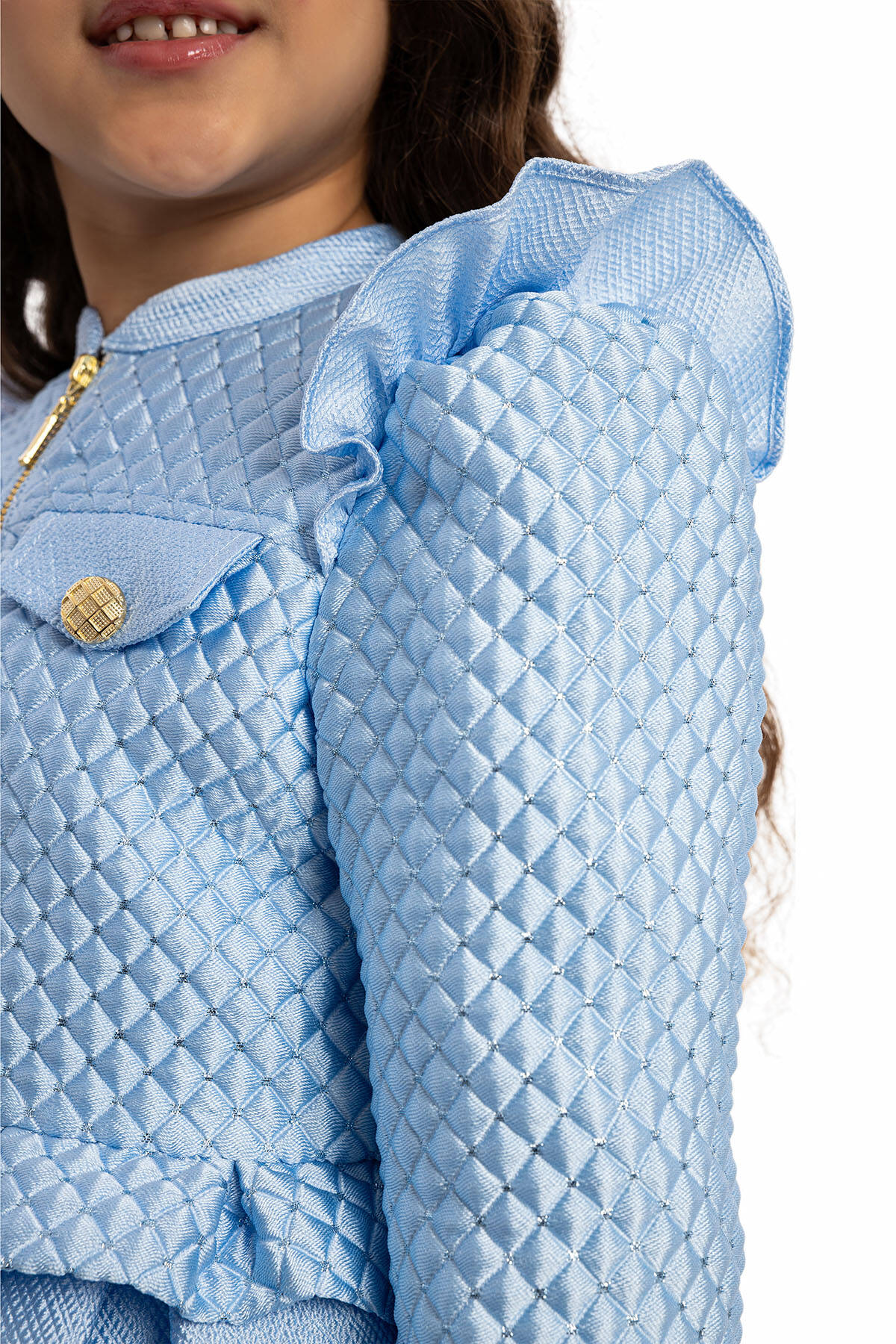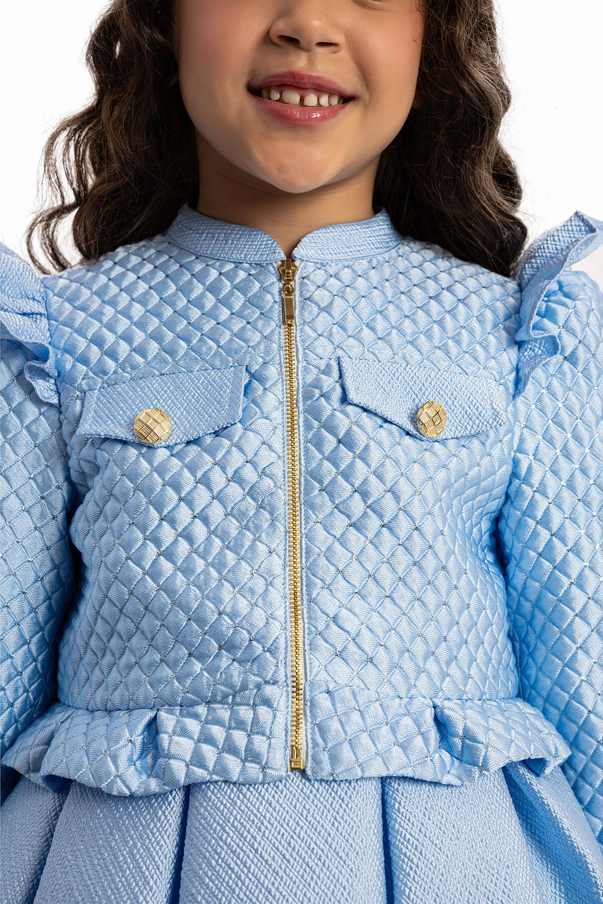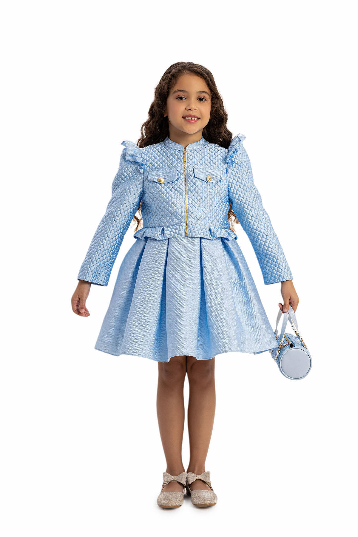 This delightful dress set combines style and functionality, making it the perfect choice for special occasions. Crafted from high-quality quilted and textured jacquard fabric, offering both a luxurious feel and durability. The fabric’s subtle shimmer adds an extra touch of charm. Features long sleeves, gold-tone buttons, and decorative flap pockets for a sophisticated look. Ruffled accents at the shoulders and hemline enhance its chic appeal. A matching quilted handbag with metallic details and a convenient handle, perfectly complementing the outfit.
