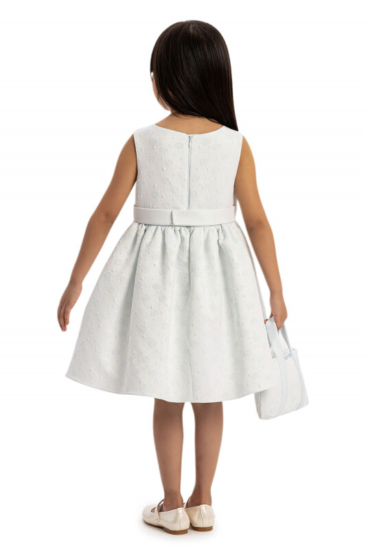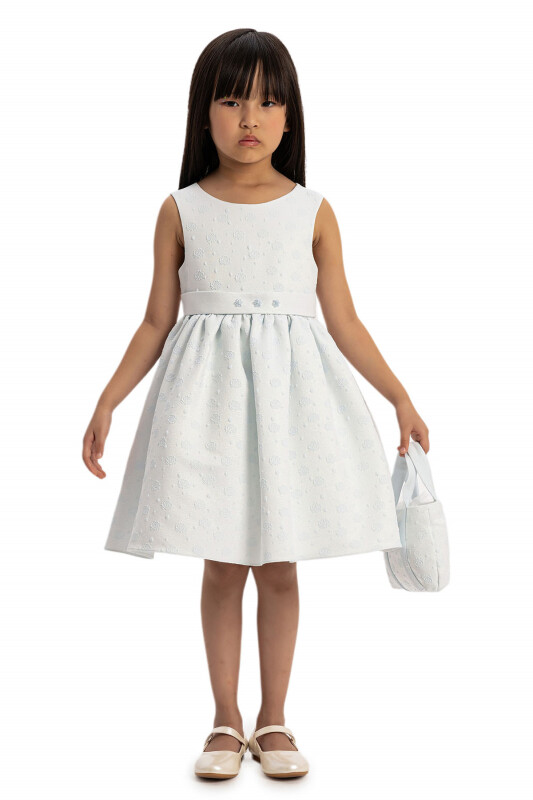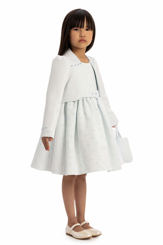 he sleeveless dress features a delicate textured fabric adorned with subtle floral patterns, complemented by charming bead details on the waistline. The matching long-sleeve jacket enhances the outfit with its refined bead embellishments, providing a polished and cozy layer. The set is completed with a chic, coordinating bag to carry small essentials. Perfect for weddings, birthdays, and other special occasions, this ensemble ensures your little one looks graceful and radiant.